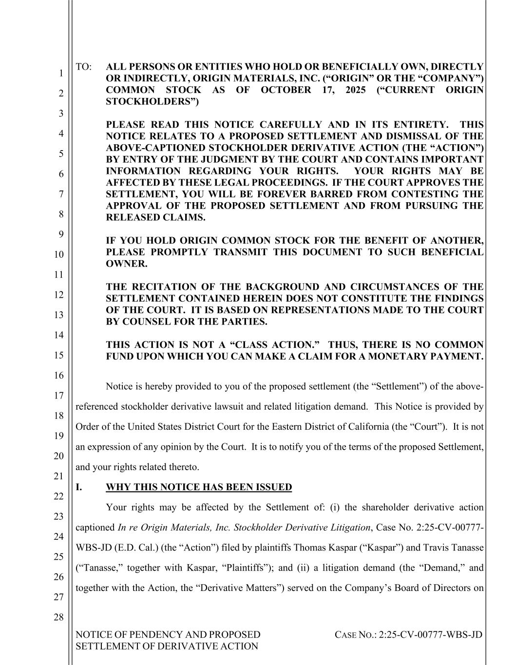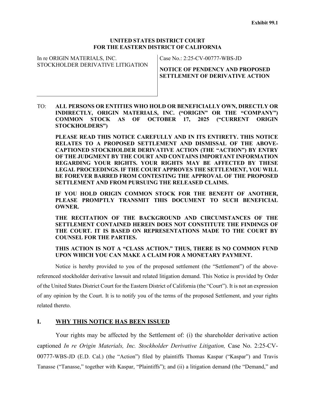 NOTICE OF PENDENCY AND PROPOSED SETTLEMENT OF DERIVATIVE ACTION CASE NO.: 2:25-CV-00777-WBS-JD 1 2 3 4 5 6 7 8 9 10 11 12 13 14 15 16 17 18 19 20 21 22 23 24 25 26 27 28 TO: ALL PERSONS OR ENTITIES WHO HOLD OR BENEFICIALLY OWN, DIRECTLY OR INDIRECTLY, ORIGIN MATERIALS, INC. (“ORIGIN” OR THE “COMPANY”) COMMON STOCK AS OF OCTOBER 17, 2025 (“CURRENT ORIGIN STOCKHOLDERS”) PLEASE READ THIS NOTICE CAREFULLY AND IN ITS ENTIRETY. THIS NOTICE RELATES TO A PROPOSED SETTLEMENT AND DISMISSAL OF THE ABOVE-CAPTIONED STOCKHOLDER DERIVATIVE ACTION (THE “ACTION”) BY ENTRY OF THE JUDGMENT BY THE COURT AND CONTAINS IMPORTANT INFORMATION REGARDING YOUR RIGHTS. YOUR RIGHTS MAY BE AFFECTED BY THESE LEGAL PROCEEDINGS. IF THE COURT APPROVES THE SETTLEMENT, YOU WILL BE FOREVER BARRED FROM CONTESTING THE APPROVAL OF THE PROPOSED SETTLEMENT AND FROM PURSUING THE RELEASED CLAIMS. IF YOU HOLD ORIGIN COMMON STOCK FOR THE BENEFIT OF ANOTHER, PLEASE PROMPTLY TRANSMIT THIS DOCUMENT TO SUCH BENEFICIAL OWNER. THE RECITATION OF THE BACKGROUND AND CIRCUMSTANCES OF THE SETTLEMENT CONTAINED HEREIN DOES NOT CONSTITUTE THE FINDINGS OF THE COURT. IT IS BASED ON REPRESENTATIONS MADE TO THE COURT BY COUNSEL FOR THE PARTIES. THIS ACTION IS NOT A “CLASS ACTION.” THUS, THERE IS NO COMMON FUND UPON WHICH YOU CAN MAKE A CLAIM FOR A MONETARY PAYMENT. Notice is hereby provided to you of the proposed settlement (the “Settlement”) of the above- referenced stockholder derivative lawsuit and related litigation demand. This Notice is provided by Order of the United States District Court for the Eastern District of California (the “Court”). It is not an expression of any opinion by the Court. It is to notify you of the terms of the proposed Settlement, and your rights related thereto. I. WHY THIS NOTICE HAS BEEN ISSUED Your rights may be affected by the Settlement of: (i) the shareholder derivative action captioned In re Origin Materials, Inc. Stockholder Derivative Litigation, Case No. 2:25-CV-00777- WBS-JD (E.D. Cal.) (the “Action”) filed by plaintiffs Thomas Kaspar (“Kaspar”) and Travis Tanasse (“Tanasse,” together with Kaspar, “Plaintiffs”); and (ii) a litigation demand (the “Demand,” and together with the Action, the “Derivative Matters”) served on the Company’s Board of Directors on