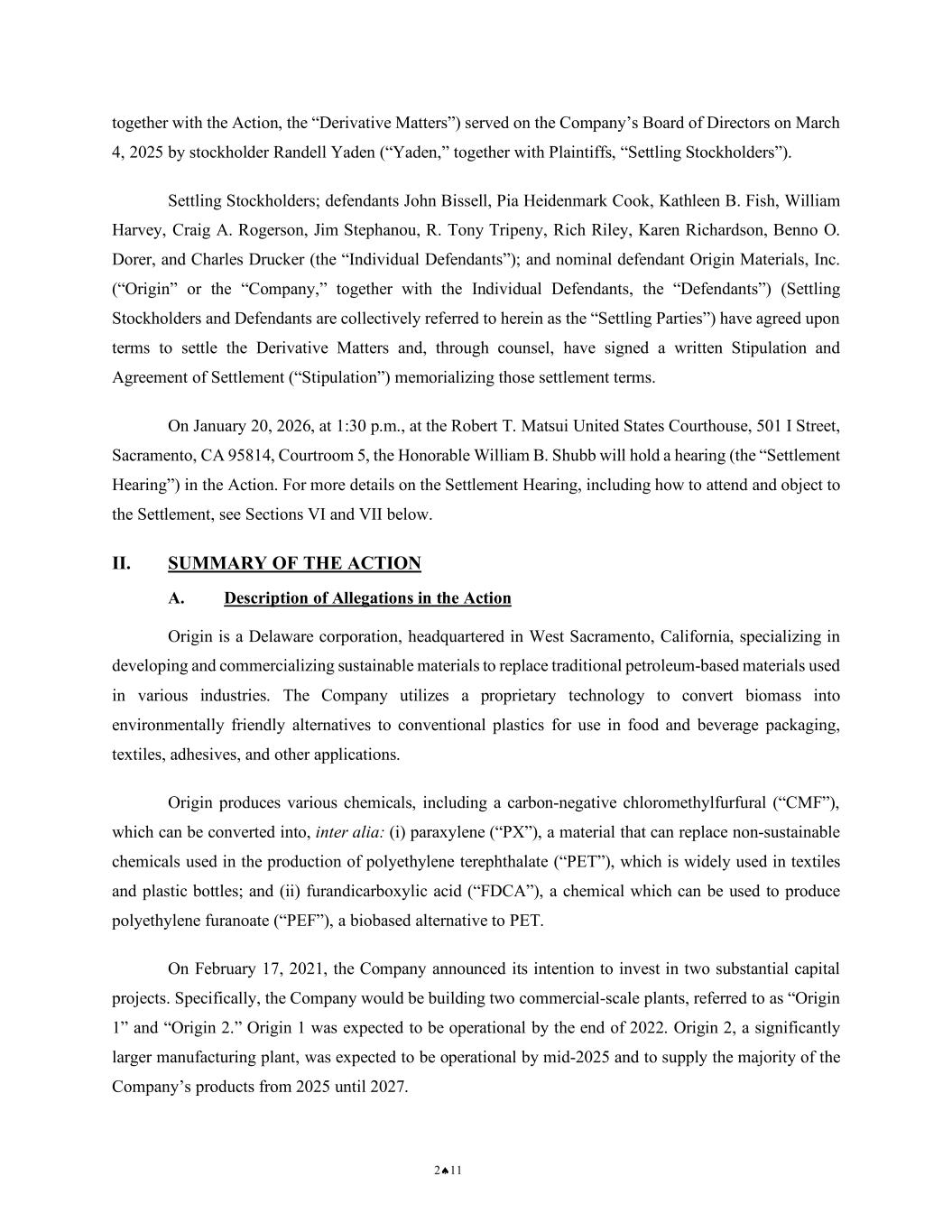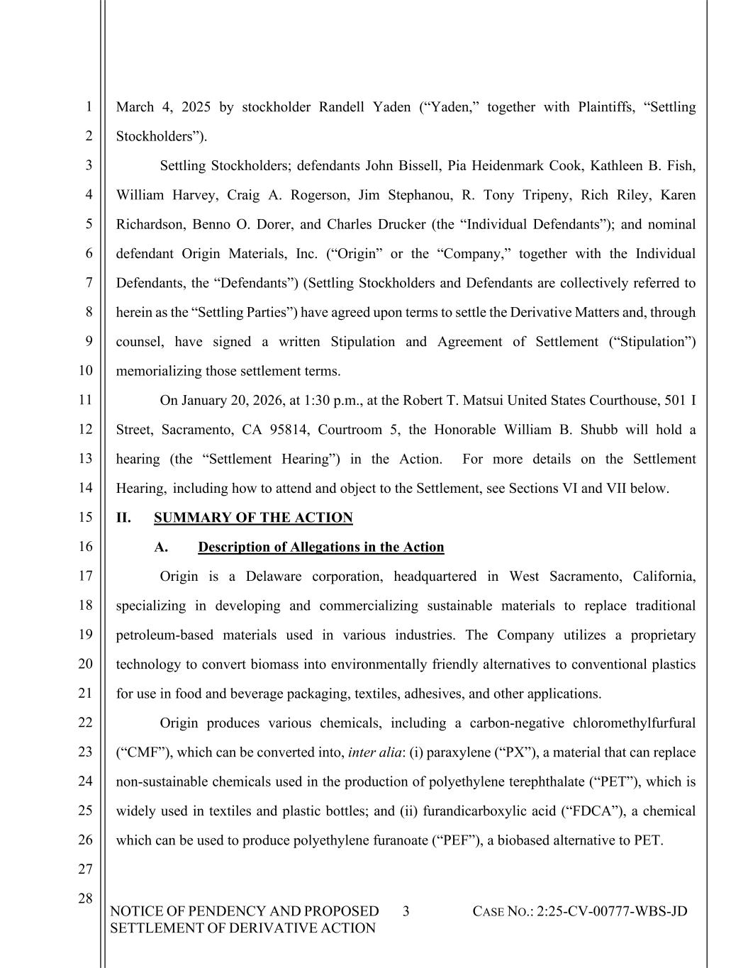 NOTICE OF PENDENCY AND PROPOSED SETTLEMENT OF DERIVATIVE ACTION 3 CASE NO.: 2:25-CV-00777-WBS-JD 1 2 3 4 5 6 7 8 9 10 11 12 13 14 15 16 17 18 19 20 21 22 23 24 25 26 27 28 March 4, 2025 by stockholder Randell Yaden (“Yaden,” together with Plaintiffs, “Settling Stockholders”). Settling Stockholders; defendants John Bissell, Pia Heidenmark Cook, Kathleen B. Fish, William Harvey, Craig A. Rogerson, Jim Stephanou, R. Tony Tripeny, Rich Riley, Karen Richardson, Benno O. Dorer, and Charles Drucker (the “Individual Defendants”); and nominal defendant Origin Materials, Inc. (“Origin” or the “Company,” together with the Individual Defendants, the “Defendants”) (Settling Stockholders and Defendants are collectively referred to herein as the “Settling Parties”) have agreed upon terms to settle the Derivative Matters and, through counsel, have signed a written Stipulation and Agreement of Settlement (“Stipulation”) memorializing those settlement terms. On January 20, 2026, at 1:30 p.m., at the Robert T. Matsui United States Courthouse, 501 I Street, Sacramento, CA 95814, Courtroom 5, the Honorable William B. Shubb will hold a hearing (the “Settlement Hearing”) in the Action. For more details on the Settlement Hearing, including how to attend and object to the Settlement, see Sections VI and VII below. II. SUMMARY OF THE ACTION A. Description of Allegations in the Action Origin is a Delaware corporation, headquartered in West Sacramento, California, specializing in developing and commercializing sustainable materials to replace traditional petroleum-based materials used in various industries. The Company utilizes a proprietary technology to convert biomass into environmentally friendly alternatives to conventional plastics for use in food and beverage packaging, textiles, adhesives, and other applications. Origin produces various chemicals, including a carbon-negative chloromethylfurfural (“CMF”), which can be converted into, inter alia: (i) paraxylene (“PX”), a material that can replace non-sustainable chemicals used in the production of polyethylene terephthalate (“PET”), which is widely used in textiles and plastic bottles; and (ii) furandicarboxylic acid (“FDCA”), a chemical which can be used to produce polyethylene furanoate (“PEF”), a biobased alternative to PET.