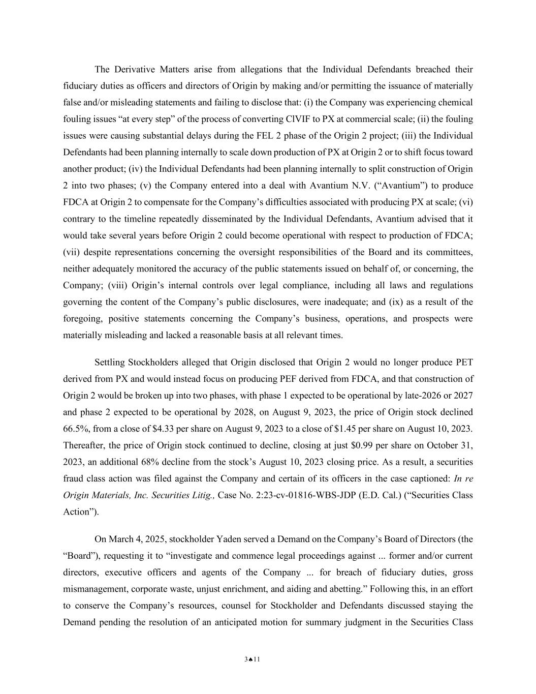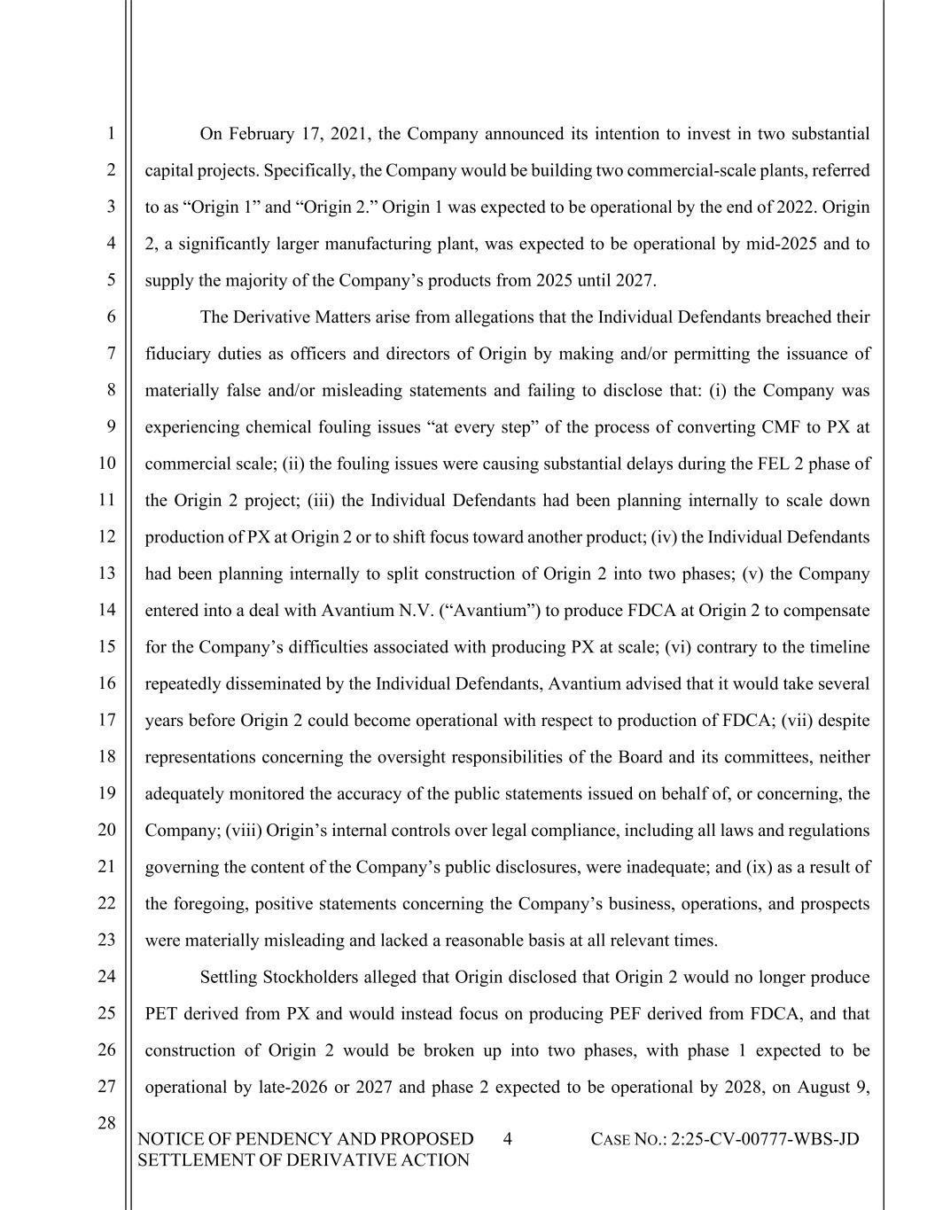 NOTICE OF PENDENCY AND PROPOSED SETTLEMENT OF DERIVATIVE ACTION 4 CASE NO.: 2:25-CV-00777-WBS-JD 1 2 3 4 5 6 7 8 9 10 11 12 13 14 15 16 17 18 19 20 21 22 23 24 25 26 27 28 On February 17, 2021, the Company announced its intention to invest in two substantial capital projects. Specifically, the Company would be building two commercial-scale plants, referred to as “Origin 1” and “Origin 2.” Origin 1 was expected to be operational by the end of 2022. Origin 2, a significantly larger manufacturing plant, was expected to be operational by mid-2025 and to supply the majority of the Company’s products from 2025 until 2027. The Derivative Matters arise from allegations that the Individual Defendants breached their fiduciary duties as officers and directors of Origin by making and/or permitting the issuance of materially false and/or misleading statements and failing to disclose that: (i) the Company was experiencing chemical fouling issues “at every step” of the process of converting CMF to PX at commercial scale; (ii) the fouling issues were causing substantial delays during the FEL 2 phase of the Origin 2 project; (iii) the Individual Defendants had been planning internally to scale down production of PX at Origin 2 or to shift focus toward another product; (iv) the Individual Defendants had been planning internally to split construction of Origin 2 into two phases; (v) the Company entered into a deal with Avantium N.V. (“Avantium”) to produce FDCA at Origin 2 to compensate for the Company’s difficulties associated with producing PX at scale; (vi) contrary to the timeline repeatedly disseminated by the Individual Defendants, Avantium advised that it would take several years before Origin 2 could become operational with respect to production of FDCA; (vii) despite representations concerning the oversight responsibilities of the Board and its committees, neither adequately monitored the accuracy of the public statements issued on behalf of, or concerning, the Company; (viii) Origin’s internal controls over legal compliance, including all laws and regulations governing the content of the Company’s public disclosures, were inadequate; and (ix) as a result of the foregoing, positive statements concerning the Company’s business, operations, and prospects were materially misleading and lacked a reasonable basis at all relevant times. Settling Stockholders alleged that Origin disclosed that Origin 2 would no longer produce PET derived from PX and would instead focus on producing PEF derived from FDCA, and that construction of Origin 2 would be broken up into two phases, with phase 1 expected to be operational by late-2026 or 2027 and phase 2 expected to be operational by 2028, on August 9,