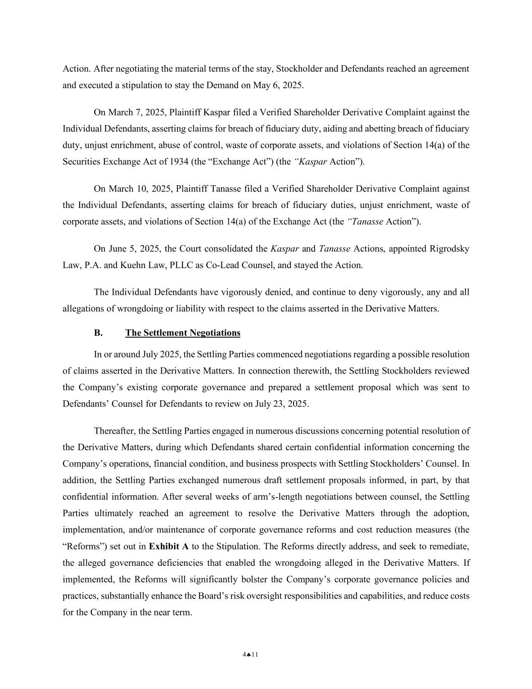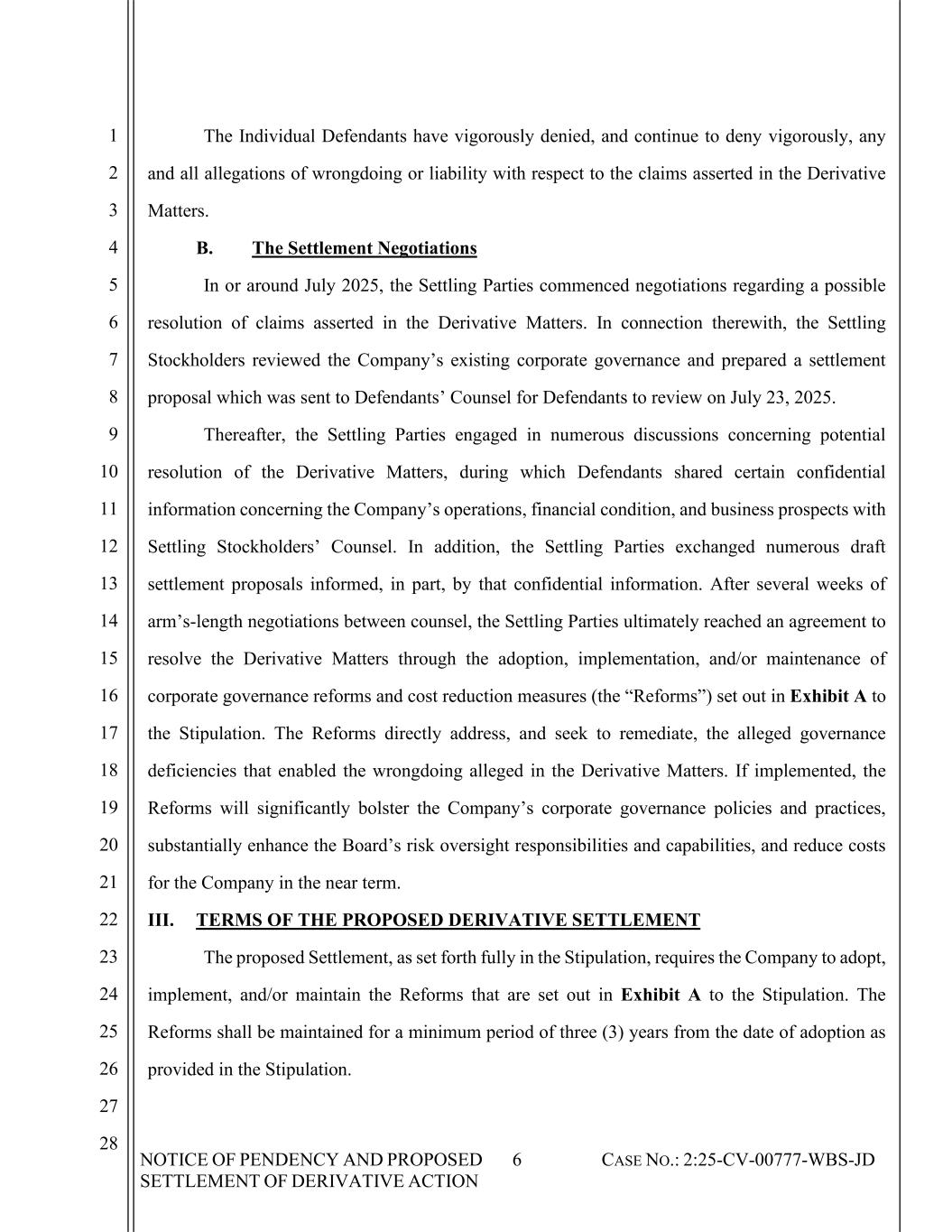 NOTICE OF PENDENCY AND PROPOSED SETTLEMENT OF DERIVATIVE ACTION 6 CASE NO.: 2:25-CV-00777-WBS-JD 1 2 3 4 5 6 7 8 9 10 11 12 13 14 15 16 17 18 19 20 21 22 23 24 25 26 27 28 The Individual Defendants have vigorously denied, and continue to deny vigorously, any and all allegations of wrongdoing or liability with respect to the claims asserted in the Derivative Matters. B. The Settlement Negotiations In or around July 2025, the Settling Parties commenced negotiations regarding a possible resolution of claims asserted in the Derivative Matters. In connection therewith, the Settling Stockholders reviewed the Company’s existing corporate governance and prepared a settlement proposal which was sent to Defendants’ Counsel for Defendants to review on July 23, 2025. Thereafter, the Settling Parties engaged in numerous discussions concerning potential resolution of the Derivative Matters, during which Defendants shared certain confidential information concerning the Company’s operations, financial condition, and business prospects with Settling Stockholders’ Counsel. In addition, the Settling Parties exchanged numerous draft settlement proposals informed, in part, by that confidential information. After several weeks of arm’s-length negotiations between counsel, the Settling Parties ultimately reached an agreement to resolve the Derivative Matters through the adoption, implementation, and/or maintenance of corporate governance reforms and cost reduction measures (the “Reforms”) set out in Exhibit A to the Stipulation. The Reforms directly address, and seek to remediate, the alleged governance deficiencies that enabled the wrongdoing alleged in the Derivative Matters. If implemented, the Reforms will significantly bolster the Company’s corporate governance policies and practices, substantially enhance the Board’s risk oversight responsibilities and capabilities, and reduce costs for the Company in the near term. III. TERMS OF THE PROPOSED DERIVATIVE SETTLEMENT The proposed Settlement, as set forth fully in the Stipulation, requires the Company to adopt, implement, and/or maintain the Reforms that are set out in Exhibit A to the Stipulation. The Reforms shall be maintained for a minimum period of three (3) years from the date of adoption as provided in the Stipulation.
