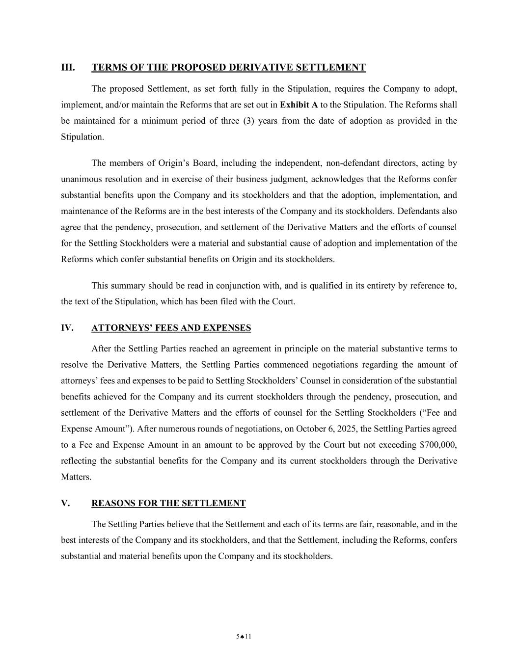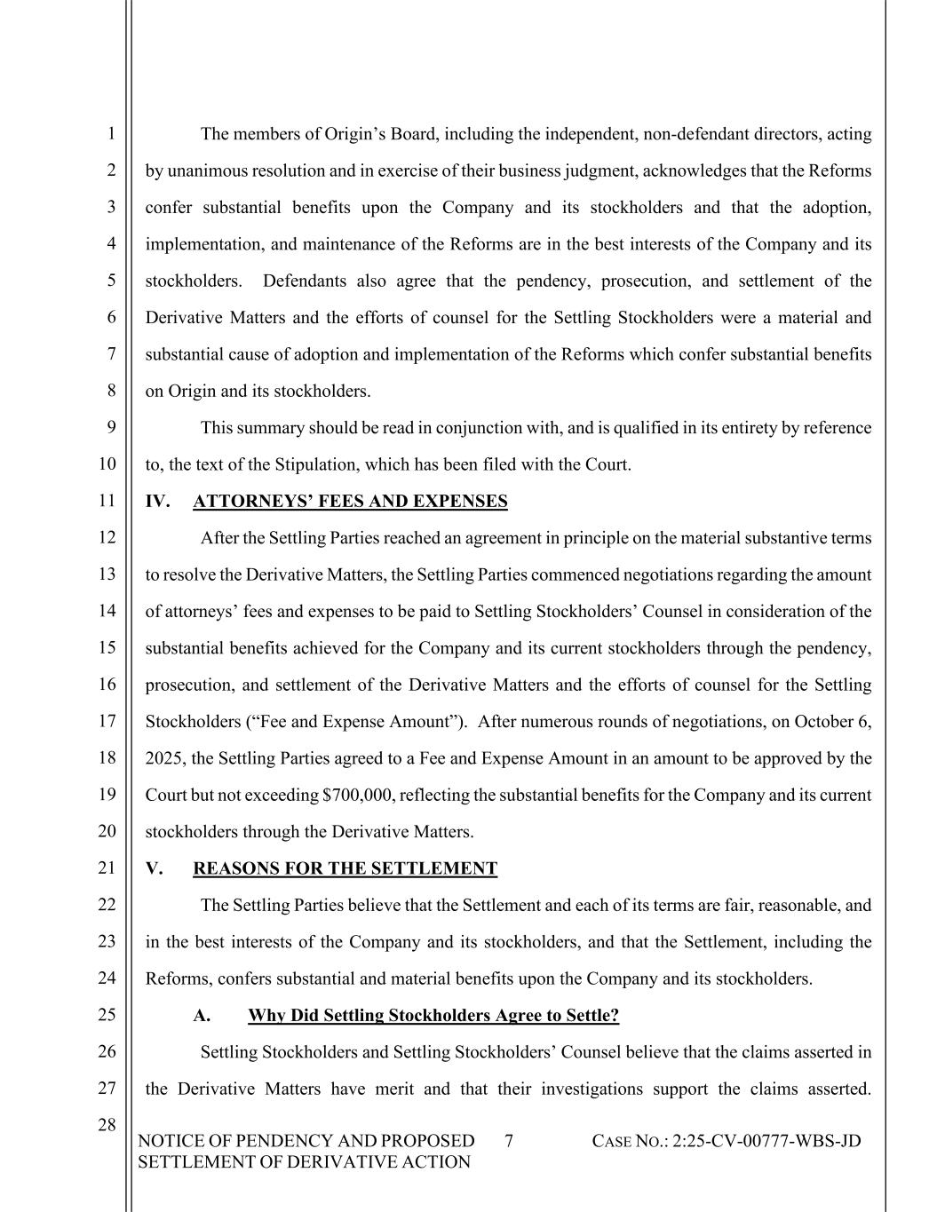 NOTICE OF PENDENCY AND PROPOSED SETTLEMENT OF DERIVATIVE ACTION 7 CASE NO.: 2:25-CV-00777-WBS-JD 1 2 3 4 5 6 7 8 9 10 11 12 13 14 15 16 17 18 19 20 21 22 23 24 25 26 27 28 The members of Origin’s Board, including the independent, non-defendant directors, acting by unanimous resolution and in exercise of their business judgment, acknowledges that the Reforms confer substantial benefits upon the Company and its stockholders and that the adoption, implementation, and maintenance of the Reforms are in the best interests of the Company and its stockholders. Defendants also agree that the pendency, prosecution, and settlement of the Derivative Matters and the efforts of counsel for the Settling Stockholders were a material and substantial cause of adoption and implementation of the Reforms which confer substantial benefits on Origin and its stockholders. This summary should be read in conjunction with, and is qualified in its entirety by reference to, the text of the Stipulation, which has been filed with the Court. IV. ATTORNEYS’ FEES AND EXPENSES After the Settling Parties reached an agreement in principle on the material substantive terms to resolve the Derivative Matters, the Settling Parties commenced negotiations regarding the amount of attorneys’ fees and expenses to be paid to Settling Stockholders’ Counsel in consideration of the substantial benefits achieved for the Company and its current stockholders through the pendency, prosecution, and settlement of the Derivative Matters and the efforts of counsel for the Settling Stockholders (“Fee and Expense Amount”). After numerous rounds of negotiations, on October 6, 2025, the Settling Parties agreed to a Fee and Expense Amount in an amount to be approved by the Court but not exceeding $700,000, reflecting the substantial benefits for the Company and its current stockholders through the Derivative Matters. V. REASONS FOR THE SETTLEMENT The Settling Parties believe that the Settlement and each of its terms are fair, reasonable, and in the best interests of the Company and its stockholders, and that the Settlement, including the Reforms, confers substantial and material benefits upon the Company and its stockholders. A. Why Did Settling Stockholders Agree to Settle? Settling Stockholders and Settling Stockholders’ Counsel believe that the claims asserted in the Derivative Matters have merit and that their investigations support the claims asserted.