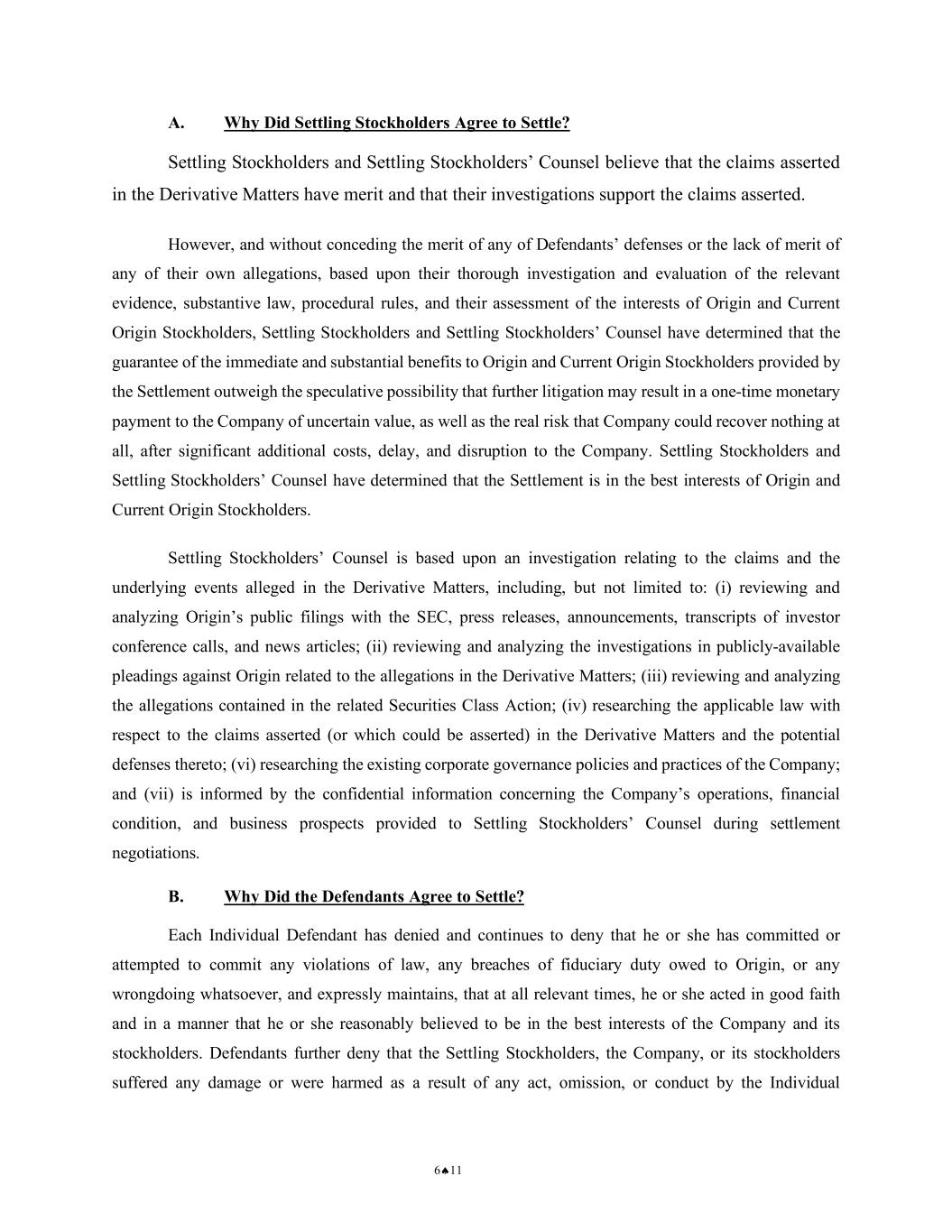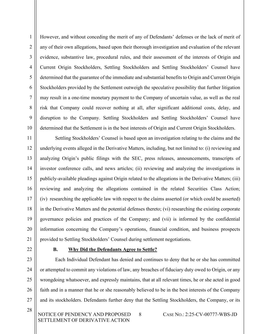 NOTICE OF PENDENCY AND PROPOSED SETTLEMENT OF DERIVATIVE ACTION 8 CASE NO.: 2:25-CV-00777-WBS-JD 1 2 3 4 5 6 7 8 9 10 11 12 13 14 15 16 17 18 19 20 21 22 23 24 25 26 27 28 However, and without conceding the merit of any of Defendants’ defenses or the lack of merit of any of their own allegations, based upon their thorough investigation and evaluation of the relevant evidence, substantive law, procedural rules, and their assessment of the interests of Origin and Current Origin Stockholders, Settling Stockholders and Settling Stockholders’ Counsel have determined that the guarantee of the immediate and substantial benefits to Origin and Current Origin Stockholders provided by the Settlement outweigh the speculative possibility that further litigation may result in a one-time monetary payment to the Company of uncertain value, as well as the real risk that Company could recover nothing at all, after significant additional costs, delay, and disruption to the Company. Settling Stockholders and Settling Stockholders’ Counsel have determined that the Settlement is in the best interests of Origin and Current Origin Stockholders. Settling Stockholders’ Counsel is based upon an investigation relating to the claims and the underlying events alleged in the Derivative Matters, including, but not limited to: (i) reviewing and analyzing Origin’s public filings with the SEC, press releases, announcements, transcripts of investor conference calls, and news articles; (ii) reviewing and analyzing the investigations in publicly-available pleadings against Origin related to the allegations in the Derivative Matters; (iii) reviewing and analyzing the allegations contained in the related Securities Class Action; (iv) researching the applicable law with respect to the claims asserted (or which could be asserted) in the Derivative Matters and the potential defenses thereto; (vi) researching the existing corporate governance policies and practices of the Company; and (vii) is informed by the confidential information concerning the Company’s operations, financial condition, and business prospects provided to Settling Stockholders’ Counsel during settlement negotiations. B. Why Did the Defendants Agree to Settle? Each Individual Defendant has denied and continues to deny that he or she has committed or attempted to commit any violations of law, any breaches of fiduciary duty owed to Origin, or any wrongdoing whatsoever, and expressly maintains, that at all relevant times, he or she acted in good faith and in a manner that he or she reasonably believed to be in the best interests of the Company and its stockholders. Defendants further deny that the Settling Stockholders, the Company, or its