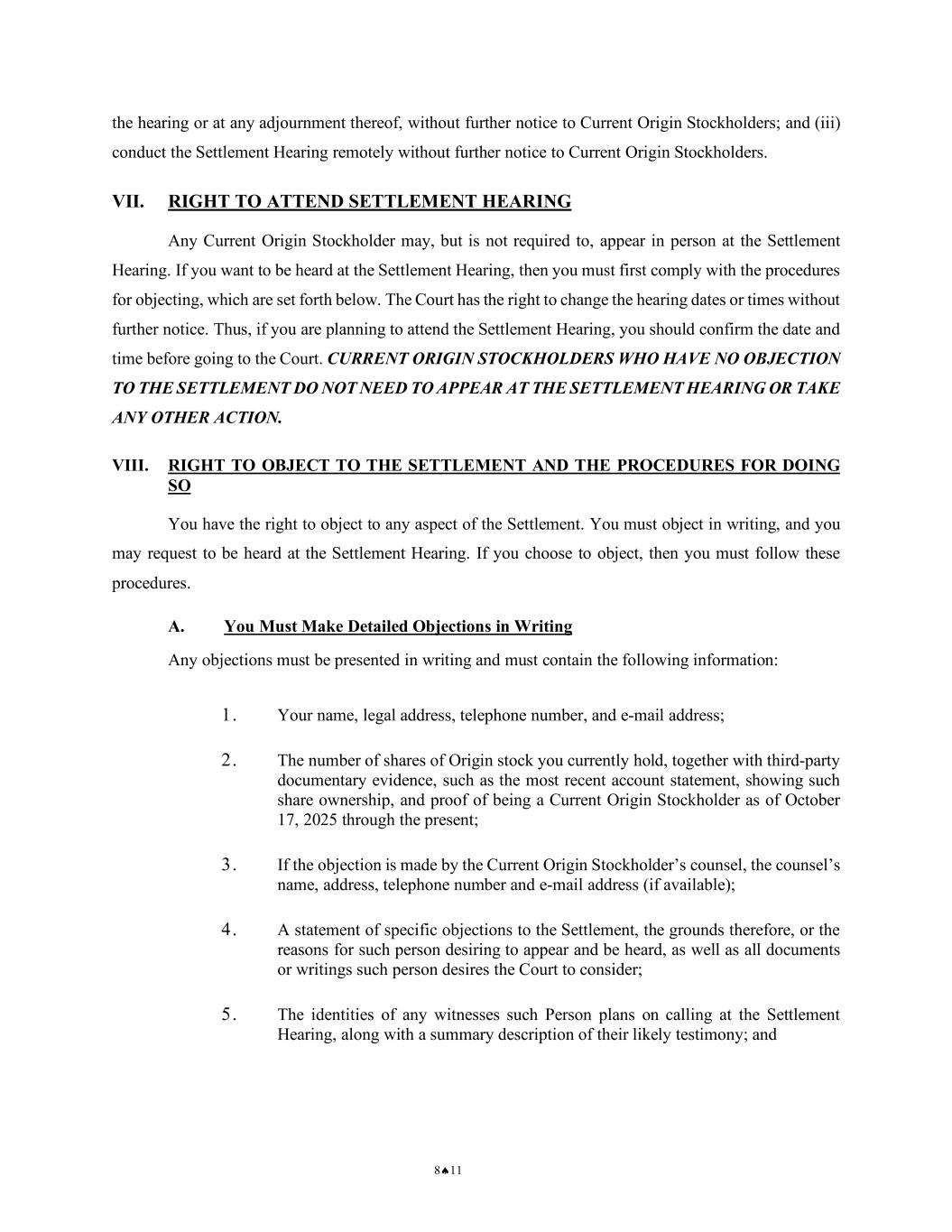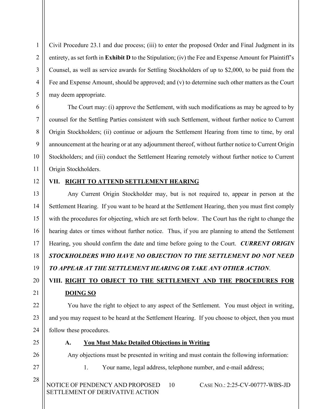 NOTICE OF PENDENCY AND PROPOSED SETTLEMENT OF DERIVATIVE ACTION 10 CASE NO.: 2:25-CV-00777-WBS-JD 1 2 3 4 5 6 7 8 9 10 11 12 13 14 15 16 17 18 19 20 21 22 23 24 25 26 27 28 Civil Procedure 23.1 and due process; (iii) to enter the proposed Order and Final Judgment in its entirety, as set forth in Exhibit D to the Stipulation; (iv) the Fee and Expense Amount for Plaintiff’s Counsel, as well as service awards for Settling Stockholders of up to $2,000, to be paid from the Fee and Expense Amount, should be approved; and (v) to determine such other matters as the Court may deem appropriate. The Court may: (i) approve the Settlement, with such modifications as may be agreed to by counsel for the Settling Parties consistent with such Settlement, without further notice to Current Origin Stockholders; (ii) continue or adjourn the Settlement Hearing from time to time, by oral announcement at the hearing or at any adjournment thereof, without further notice to Current Origin Stockholders; and (iii) conduct the Settlement Hearing remotely without further notice to Current Origin Stockholders. VII. RIGHT TO ATTEND SETTLEMENT HEARING Any Current Origin Stockholder may, but is not required to, appear in person at the Settlement Hearing. If you want to be heard at the Settlement Hearing, then you must first comply with the procedures for objecting, which are set forth below. The Court has the right to change the hearing dates or times without further notice. Thus, if you are planning to attend the Settlement Hearing, you should confirm the date and time before going to the Court. CURRENT ORIGIN STOCKHOLDERS WHO HAVE NO OBJECTION TO THE SETTLEMENT DO NOT NEED TO APPEAR AT THE SETTLEMENT HEARING OR TAKE ANY OTHER ACTION. VIII. RIGHT TO OBJECT TO THE SETTLEMENT AND THE PROCEDURES FOR DOING SO You have the right to object to any aspect of the Settlement. You must object in writing, and you may request to be heard at the Settlement Hearing. If you choose to object, then you must follow these procedures. A. You Must Make Detailed Objections in Writing Any objections must be presented in writing and must contain the following information: 1. Your name, legal address, telephone number, and e-mail address;