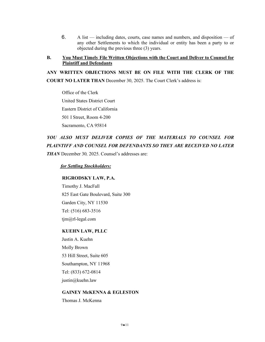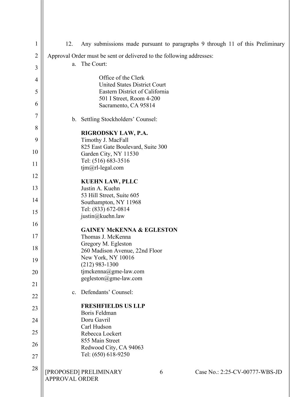 [PROPOSED] PRELIMINARY APPROVAL ORDER 6 Case No.: 2:25-CV-00777-WBS-JD 1 2 3 4 5 6 7 8 9 10 11 12 13 14 15 16 17 18 19 20 21 22 23 24 25 26 27 28 12. Any submissions made pursuant to paragraphs 9 through 11 of this Preliminary Approval Order must be sent or delivered to the following addresses: a. The Court: Office of the Clerk United States District Court Eastern District of California 501 I Street, Room 4-200 Sacramento, CA 95814 b. Settling Stockholders’ Counsel: RIGRODSKY LAW, P.A. Timothy J. MacFall 825 East Gate Boulevard, Suite 300 Garden City, NY 11530 Tel: (516) 683-3516 tjm@rl-legal.com KUEHN LAW, PLLC Justin A. Kuehn 53 Hill Street, Suite 605 Southampton, NY 11968 Tel: (833) 672-0814 justin@kuehn.law GAINEY McKENNA & EGLESTON Thomas J. McKenna Gregory M. Egleston 260 Madison Avenue, 22nd Floor New York, NY 10016 (212) 983-1300 tjmckenna@gme-law.com gegleston@gme-law.com c. Defendants’ Counsel: FRESHFIELDS US LLP Boris Feldman Doru Gavril Carl Hudson Rebecca Lockert 855 Main Street Redwood City, CA 94063 Tel: (650) 618-9250