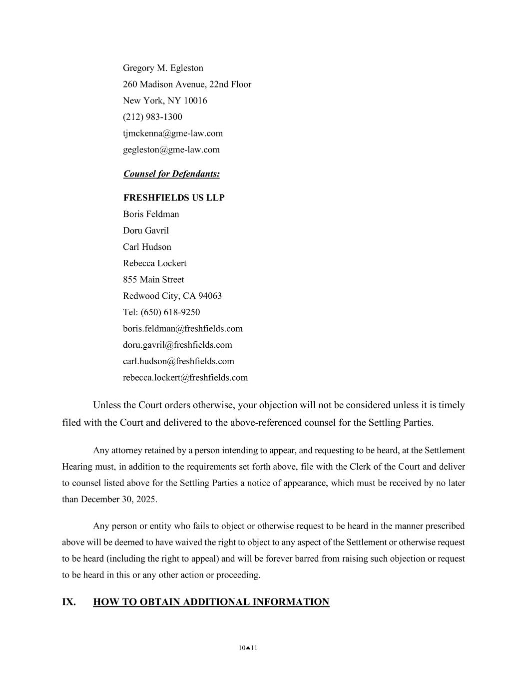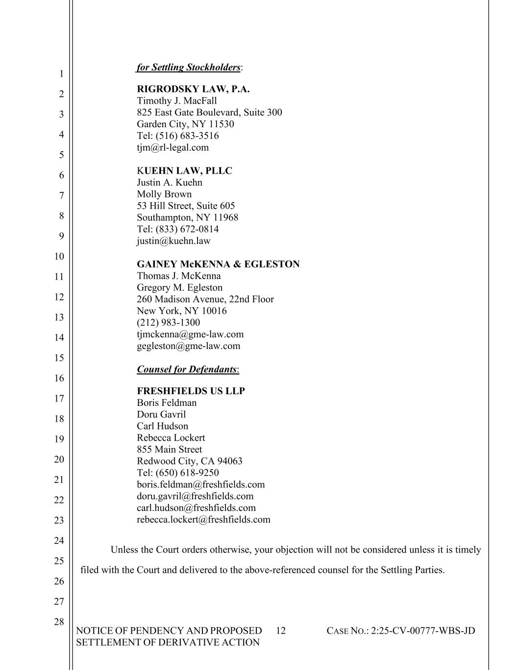 NOTICE OF PENDENCY AND PROPOSED SETTLEMENT OF DERIVATIVE ACTION 12 CASE NO.: 2:25-CV-00777-WBS-JD 1 2 3 4 5 6 7 8 9 10 11 12 13 14 15 16 17 18 19 20 21 22 23 24 25 26 27 28 for Settling Stockholders: RIGRODSKY LAW, P.A. Timothy J. MacFall 825 East Gate Boulevard, Suite 300 Garden City, NY 11530 Tel: (516) 683-3516 tjm@rl-legal.com KUEHN LAW, PLLC Justin A. Kuehn Molly Brown 53 Hill Street, Suite 605 Southampton, NY 11968 Tel: (833) 672-0814 justin@kuehn.law GAINEY McKENNA & EGLESTON Thomas J. McKenna Gregory M. Egleston 260 Madison Avenue, 22nd Floor New York, NY 10016 (212) 983-1300 tjmckenna@gme-law.com gegleston@gme-law.com Counsel for Defendants: FRESHFIELDS US LLP Boris Feldman Doru Gavril Carl Hudson Rebecca Lockert 855 Main Street Redwood City, CA 94063 Tel: (650) 618-9250 boris.feldman@freshfields.com doru.gavril@freshfields.com carl.hudson@freshfields.com rebecca.lockert@freshfields.com Unless the Court orders otherwise, your objection will not be considered unless it is timely filed with the Court and delivered to the above-referenced counsel for the Settling Parties.