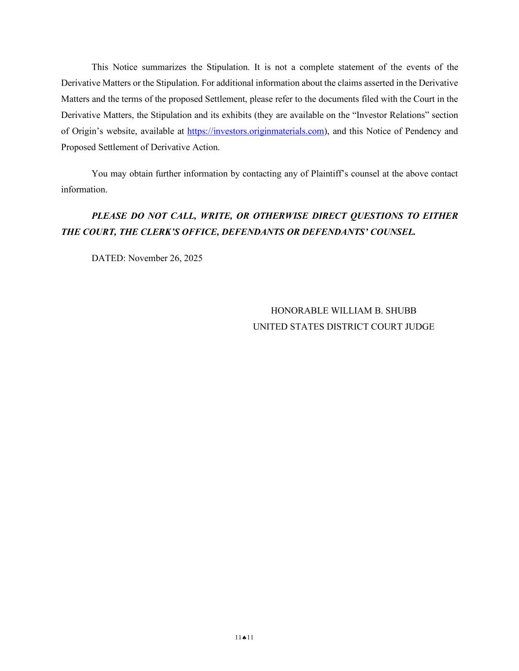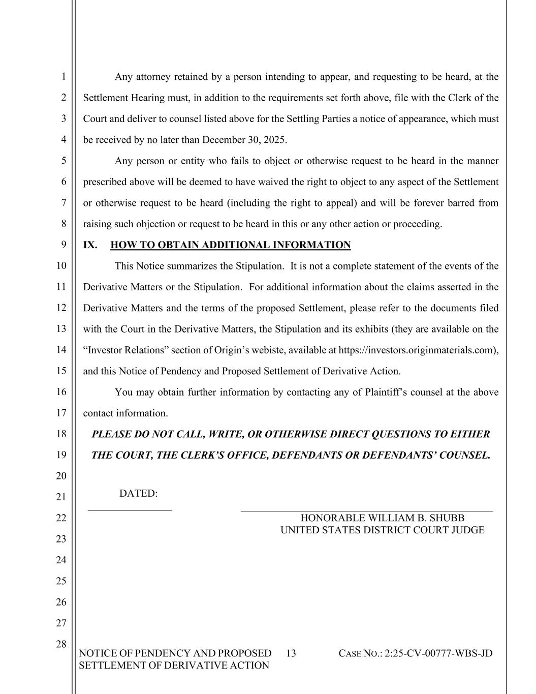 NOTICE OF PENDENCY AND PROPOSED SETTLEMENT OF DERIVATIVE ACTION 13 CASE NO.: 2:25-CV-00777-WBS-JD 1 2 3 4 5 6 7 8 9 10 11 12 13 14 15 16 17 18 19 20 21 22 23 24 25 26 27 28 Any attorney retained by a person intending to appear, and requesting to be heard, at the Settlement Hearing must, in addition to the requirements set forth above, file with the Clerk of the Court and deliver to counsel listed above for the Settling Parties a notice of appearance, which must be received by no later than December 30, 2025. Any person or entity who fails to object or otherwise request to be heard in the manner prescribed above will be deemed to have waived the right to object to any aspect of the Settlement or otherwise request to be heard (including the right to appeal) and will be forever barred from raising such objection or request to be heard in this or any other action or proceeding. IX. HOW TO OBTAIN ADDITIONAL INFORMATION This Notice summarizes the Stipulation. It is not a complete statement of the events of the Derivative Matters or the Stipulation. For additional information about the claims asserted in the Derivative Matters and the terms of the proposed Settlement, please refer to the documents filed with the Court in the Derivative Matters, the Stipulation and its exhibits (they are available on the “Investor Relations” section of Origin’s webiste, available at https://investors.originmaterials.com), and this Notice of Pendency and Proposed Settlement of Derivative Action. You may obtain further information by contacting any of Plaintiff’s counsel at the above contact information. PLEASE DO NOT CALL, WRITE, OR OTHERWISE DIRECT QUESTIONS TO EITHER THE COURT, THE CLERK’S OFFICE, DEFENDANTS OR DEFENDANTS’ COUNSEL. DATED: ________________ HONORABLE WILLIAM B. SHUBB UNITED STATES DISTRICT COURT JUDGE