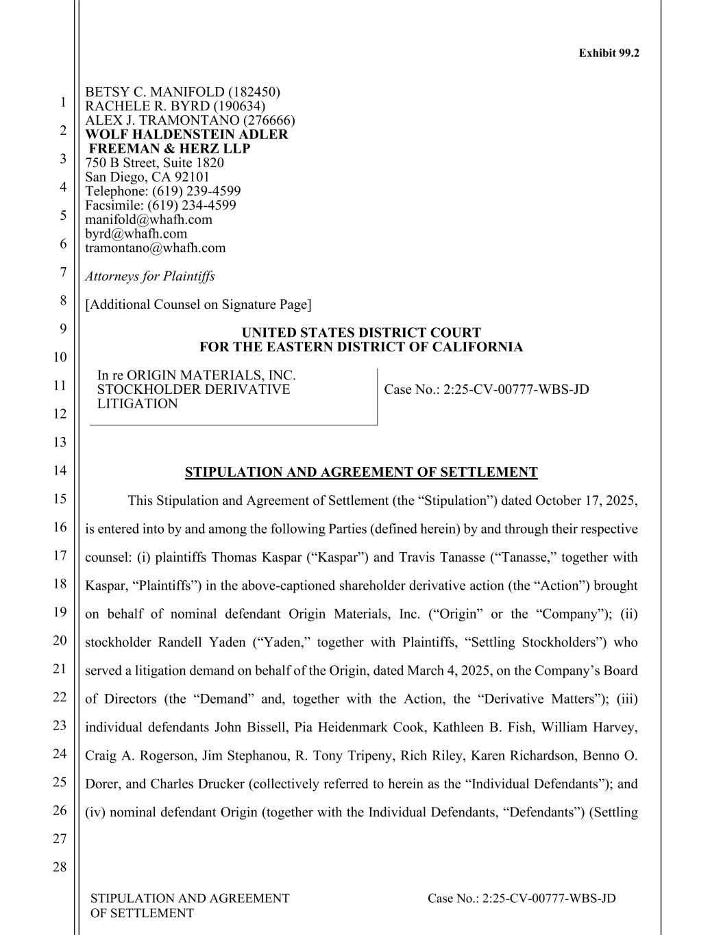 STIPULATION AND AGREEMENT OF SETTLEMENT Case No.: 2:25-CV-00777-WBS-JD 1 2 3 4 5 6 7 8 9 10 11 12 13 14 15 16 17 18 19 20 21 22 23 24 25 26 27 28 BETSY C. MANIFOLD (182450) RACHELE R. BYRD (190634) ALEX J. TRAMONTANO (276666) WOLF HALDENSTEIN ADLER FREEMAN & HERZ LLP 750 B Street, Suite 1820 San Diego, CA 92101 Telephone: (619) 239-4599 Facsimile: (619) 234-4599 manifold@whafh.com byrd@whafh.com tramontano@whafh.com Attorneys for Plaintiffs [Additional Counsel on Signature Page] UNITED STATES DISTRICT COURT FOR THE EASTERN DISTRICT OF CALIFORNIA In re ORIGIN MATERIALS, INC. STOCKHOLDER DERIVATIVE LITIGATION Case No.: 2:25-CV-00777-WBS-JD STIPULATION AND AGREEMENT OF SETTLEMENT This Stipulation and Agreement of Settlement (the “Stipulation”) dated October 17, 2025, is entered into by and among the following Parties (defined herein) by and through their respective counsel: (i) plaintiffs Thomas Kaspar (“Kaspar”) and Travis Tanasse (“Tanasse,” together with Kaspar, “Plaintiffs”) in the above-captioned shareholder derivative action (the “Action”) brought on behalf of nominal defendant Origin Materials, Inc. (“Origin” or the “Company”); (ii) stockholder Randell Yaden (“Yaden,” together with Plaintiffs, “Settling Stockholders”) who served a litigation demand on behalf of the Origin, dated March 4, 2025, on the Company’s Board of Directors (the “Demand” and, together with the Action, the “Derivative Matters”); (iii) individual defendants John Bissell, Pia Heidenmark Cook, Kathleen B. Fish, William Harvey, Craig A. Rogerson, Jim Stephanou, R. Tony Tripeny, Rich Riley, Karen Richardson, Benno O. Dorer, and Charles Drucker (collectively referred to herein as the “Individual Defendants”); and (iv) nominal defendant Origin (together with the Individual Defendants, “Defendants”) (Settling Exhibit 99.2