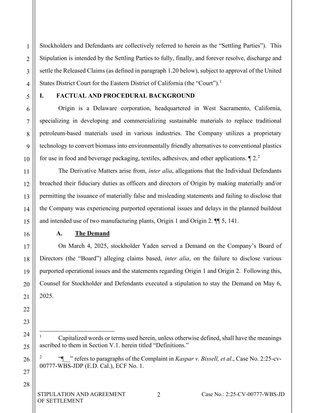 STIPULATION AND AGREEMENT OF SETTLEMENT 2 Case No.: 2:25-CV-00777-WBS-JD 1 2 3 4 5 6 7 8 9 10 11 12 13 14 15 16 17 18 19 20 21 22 23 24 25 26 27 28 Stockholders and Defendants are collectively referred to herein as the “Settling Parties”). This Stipulation is intended by the Settling Parties to fully, finally, and forever resolve, discharge and settle the Released Claims (as defined in paragraph 1.20 below), subject to approval of the United States District Court for the Eastern District of California (the “Court”).1 I. FACTUAL AND PROCEDURAL BACKGROUND Origin is a Delaware corporation, headquartered in West Sacramento, California, specializing in developing and commercializing sustainable materials to replace traditional petroleum-based materials used in various industries. The Company utilizes a proprietary technology to convert biomass into environmentally friendly alternatives to conventional plastics for use in food and beverage packaging, textiles, adhesives, and other applications. ¶ 2.2 The Derivative Matters arise from, inter alia, allegations that the Individual Defendants breached their fiduciary duties as officers and directors of Origin by making materially and/or permitting the issuance of materially false and misleading statements and failing to disclose that the Company was experiencing purported operational issues and delays in the planned buildout and intended use of two manufacturing plants, Origin 1 and Origin 2. ¶¶ 5, 141. A. The Demand On March 4, 2025, stockholder Yaden served a Demand on the Company’s Board of Directors (the “Board”) alleging claims based, inter alia, on the failure to disclose various purported operational issues and the statements regarding Origin 1 and Origin 2. Following this, Counsel for Stockholder and Defendants executed a stipulation to stay the Demand on May 6, 2025. 1 Capitalized words or terms used herein, unless otherwise defined, shall have the meanings ascribed to them in Section V.1. herein titled “Definitions.” 2 “¶__” refers to paragraphs of the Complaint in Kaspar v. Bissell, et al., Case No. 2:25-cv- 00777-WBS-JDP (E.D. Cal.), ECF No. 1.