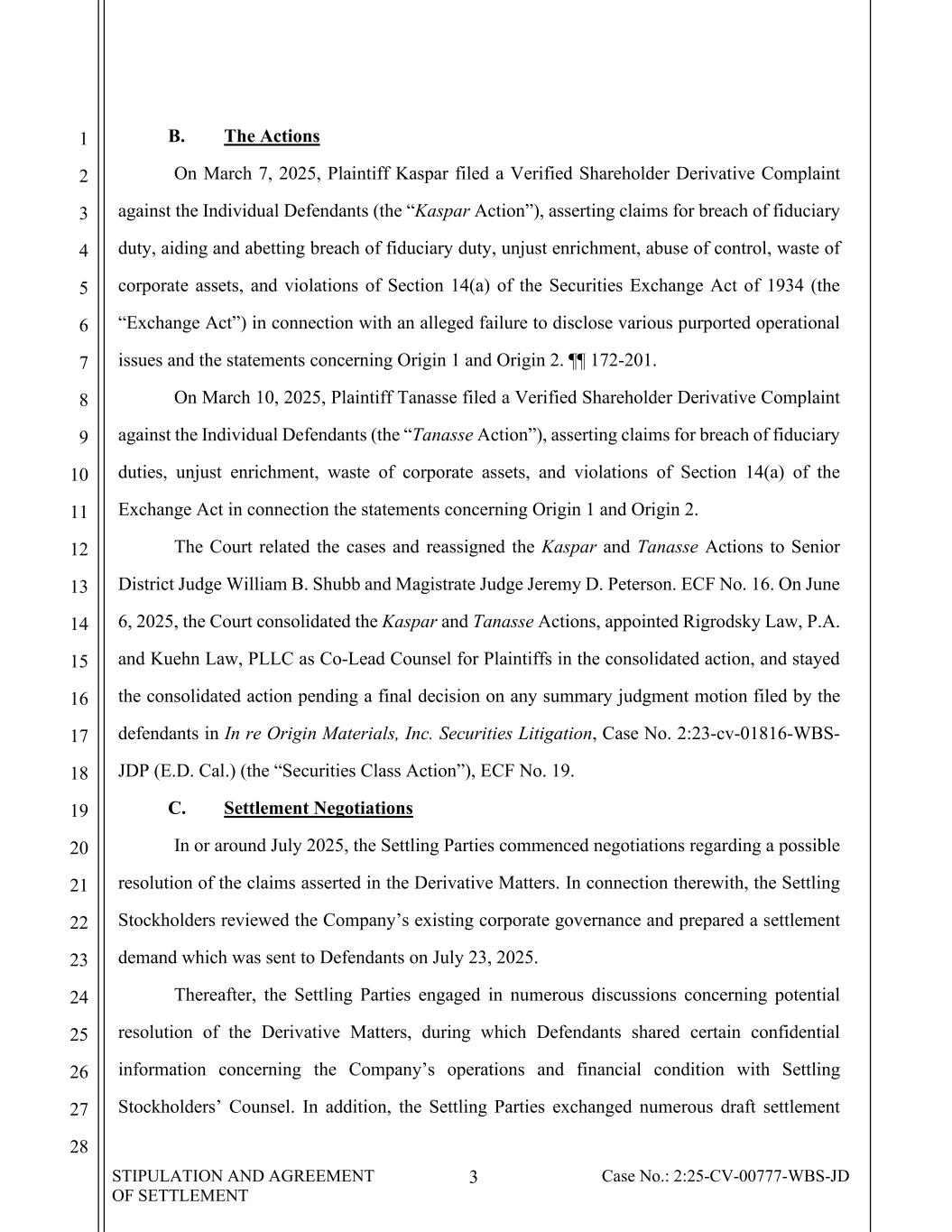 STIPULATION AND AGREEMENT OF SETTLEMENT 3 Case No.: 2:25-CV-00777-WBS-JD 1 2 3 4 5 6 7 8 9 10 11 12 13 14 15 16 17 18 19 20 21 22 23 24 25 26 27 28 B. The Actions On March 7, 2025, Plaintiff Kaspar filed a Verified Shareholder Derivative Complaint against the Individual Defendants (the “Kaspar Action”), asserting claims for breach of fiduciary duty, aiding and abetting breach of fiduciary duty, unjust enrichment, abuse of control, waste of corporate assets, and violations of Section 14(a) of the Securities Exchange Act of 1934 (the “Exchange Act”) in connection with an alleged failure to disclose various purported operational issues and the statements concerning Origin 1 and Origin 2. ¶¶ 172-201. On March 10, 2025, Plaintiff Tanasse filed a Verified Shareholder Derivative Complaint against the Individual Defendants (the “Tanasse Action”), asserting claims for breach of fiduciary duties, unjust enrichment, waste of corporate assets, and violations of Section 14(a) of the Exchange Act in connection the statements concerning Origin 1 and Origin 2. The Court related the cases and reassigned the Kaspar and Tanasse Actions to Senior District Judge William B. Shubb and Magistrate Judge Jeremy D. Peterson. ECF No. 16. On June 6, 2025, the Court consolidated the Kaspar and Tanasse Actions, appointed Rigrodsky Law, P.A. and Kuehn Law, PLLC as Co-Lead Counsel for Plaintiffs in the consolidated action, and stayed the consolidated action pending a final decision on any summary judgment motion filed by the defendants in In re Origin Materials, Inc. Securities Litigation, Case No. 2:23-cv-01816-WBS- JDP (E.D. Cal.) (the “Securities Class Action”), ECF No. 19. C. Settlement Negotiations In or around July 2025, the Settling Parties commenced negotiations regarding a possible resolution of the claims asserted in the Derivative Matters. In connection therewith, the Settling Stockholders reviewed the Company’s existing corporate governance and prepared a settlement demand which was sent to Defendants on July 23, 2025. Thereafter, the Settling Parties engaged in numerous discussions concerning potential resolution of the Derivative Matters, during which Defendants shared certain confidential information concerning the Company’s operations and financial condition with Settling Stockholders’ Counsel. In addition, the Settling Parties exchanged numerous draft settlement