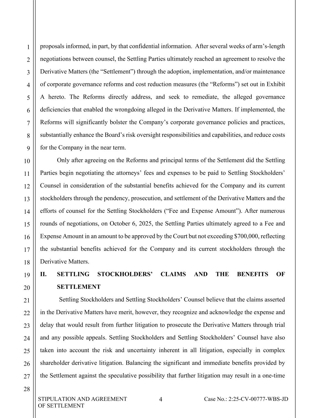 STIPULATION AND AGREEMENT OF SETTLEMENT 4 Case No.: 2:25-CV-00777-WBS-JD 1 2 3 4 5 6 7 8 9 10 11 12 13 14 15 16 17 18 19 20 21 22 23 24 25 26 27 28 proposals informed, in part, by that confidential information. After several weeks of arm’s-length negotiations between counsel, the Settling Parties ultimately reached an agreement to resolve the Derivative Matters (the “Settlement”) through the adoption, implementation, and/or maintenance of corporate governance reforms and cost reduction measures (the “Reforms”) set out in Exhibit A hereto. The Reforms directly address, and seek to remediate, the alleged governance deficiencies that enabled the wrongdoing alleged in the Derivative Matters. If implemented, the Reforms will significantly bolster the Company’s corporate governance policies and practices, substantially enhance the Board’s risk oversight responsibilities and capabilities, and reduce costs for the Company in the near term. Only after agreeing on the Reforms and principal terms of the Settlement did the Settling Parties begin negotiating the attorneys’ fees and expenses to be paid to Settling Stockholders’ Counsel in consideration of the substantial benefits achieved for the Company and its current stockholders through the pendency, prosecution, and settlement of the Derivative Matters and the efforts of counsel for the Settling Stockholders (“Fee and Expense Amount”). After numerous rounds of negotiations, on October 6, 2025, the Settling Parties ultimately agreed to a Fee and Expense Amount in an amount to be approved by the Court but not exceeding $700,000, reflecting the substantial benefits achieved for the Company and its current stockholders through the Derivative Matters. II. SETTLING STOCKHOLDERS’ CLAIMS AND THE BENEFITS OF SETTLEMENT Settling Stockholders and Settling Stockholders’ Counsel believe that the claims asserted in the Derivative Matters have merit, however, they recognize and acknowledge the expense and delay that would result from further litigation to prosecute the Derivative Matters through trial and any possible appeals. Settling Stockholders and Settling Stockholders’ Counsel have also taken into account the risk and uncertainty inherent in all litigation, especially in complex shareholder derivative litigation. Balancing the significant and immediate benefits provided by the Settlement against the speculative possibility that further litigation may result in a one-time