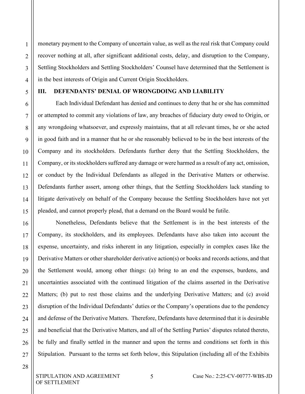 STIPULATION AND AGREEMENT OF SETTLEMENT 5 Case No.: 2:25-CV-00777-WBS-JD 1 2 3 4 5 6 7 8 9 10 11 12 13 14 15 16 17 18 19 20 21 22 23 24 25 26 27 28 monetary payment to the Company of uncertain value, as well as the real risk that Company could recover nothing at all, after significant additional costs, delay, and disruption to the Company, Settling Stockholders and Settling Stockholders’ Counsel have determined that the Settlement is in the best interests of Origin and Current Origin Stockholders. III. DEFENDANTS’ DENIAL OF WRONGDOING AND LIABILITY Each Individual Defendant has denied and continues to deny that he or she has committed or attempted to commit any violations of law, any breaches of fiduciary duty owed to Origin, or any wrongdoing whatsoever, and expressly maintains, that at all relevant times, he or she acted in good faith and in a manner that he or she reasonably believed to be in the best interests of the Company and its stockholders. Defendants further deny that the Settling Stockholders, the Company, or its stockholders suffered any damage or were harmed as a result of any act, omission, or conduct by the Individual Defendants as alleged in the Derivative Matters or otherwise. Defendants further assert, among other things, that the Settling Stockholders lack standing to litigate derivatively on behalf of the Company because the Settling Stockholders have not yet pleaded, and cannot properly plead, that a demand on the Board would be futile. Nonetheless, Defendants believe that the Settlement is in the best interests of the Company, its stockholders, and its employees. Defendants have also taken into account the expense, uncertainty, and risks inherent in any litigation, especially in complex cases like the Derivative Matters or other shareholder derivative action(s) or books and records actions, and that the Settlement would, among other things: (a) bring to an end the expenses, burdens, and uncertainties associated with the continued litigation of the claims asserted in the Derivative Matters; (b) put to rest those claims and the underlying Derivative Matters; and (c) avoid disruption of the Individual Defendants’ duties or the Company’s operations due to the pendency and defense of the Derivative Matters. Therefore, Defendants have determined that it is desirable and beneficial that the Derivative Matters, and all of the Settling Parties’ disputes related thereto, be fully and finally settled in the manner and upon the terms and conditions set forth in this Stipulation. Pursuant to the terms set forth below, this Stipulation (including all of the Exhibits