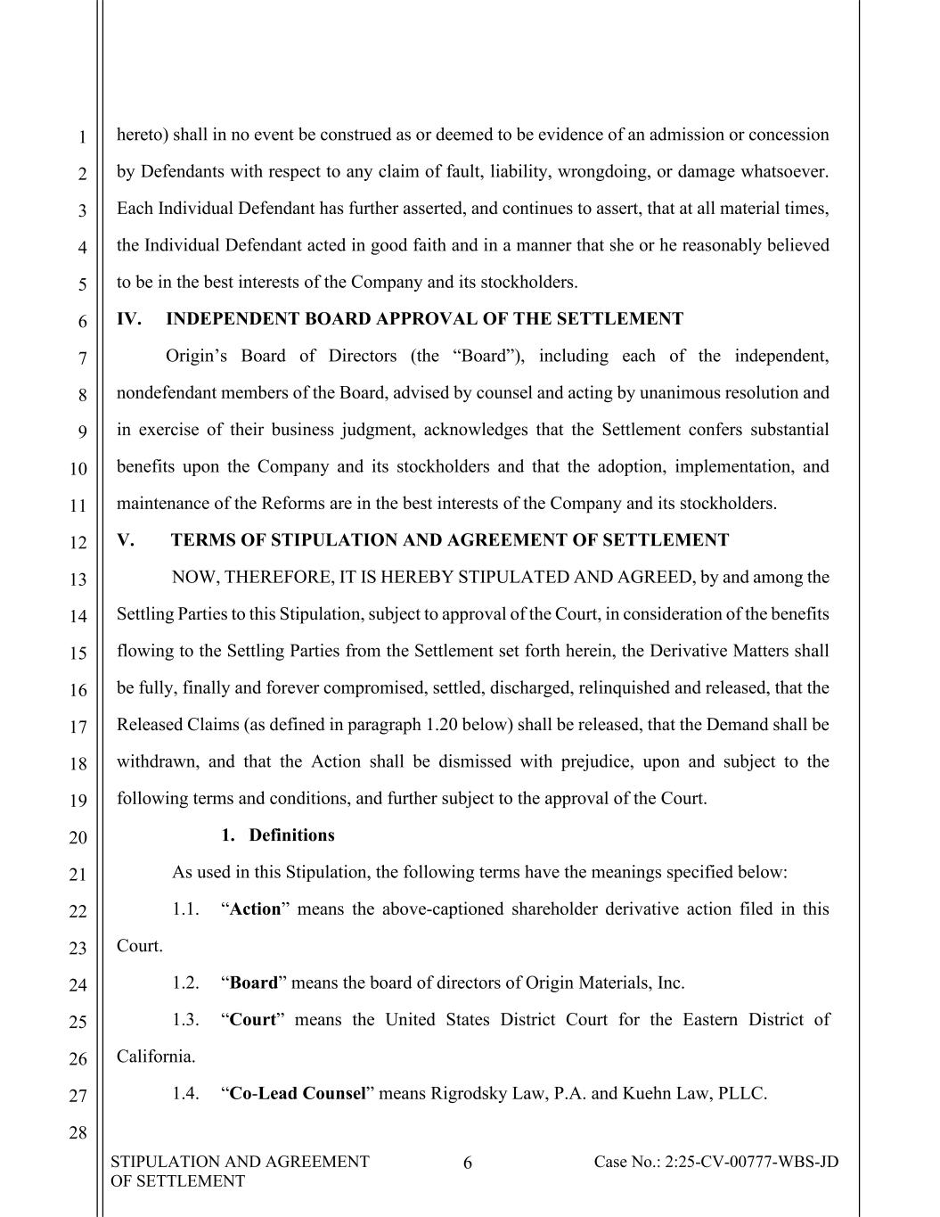 STIPULATION AND AGREEMENT OF SETTLEMENT 6 Case No.: 2:25-CV-00777-WBS-JD 1 2 3 4 5 6 7 8 9 10 11 12 13 14 15 16 17 18 19 20 21 22 23 24 25 26 27 28 hereto) shall in no event be construed as or deemed to be evidence of an admission or concession by Defendants with respect to any claim of fault, liability, wrongdoing, or damage whatsoever. Each Individual Defendant has further asserted, and continues to assert, that at all material times, the Individual Defendant acted in good faith and in a manner that she or he reasonably believed to be in the best interests of the Company and its stockholders. IV. INDEPENDENT BOARD APPROVAL OF THE SETTLEMENT Origin’s Board of Directors (the “Board”), including each of the independent, nondefendant members of the Board, advised by counsel and acting by unanimous resolution and in exercise of their business judgment, acknowledges that the Settlement confers substantial benefits upon the Company and its stockholders and that the adoption, implementation, and maintenance of the Reforms are in the best interests of the Company and its stockholders. V. TERMS OF STIPULATION AND AGREEMENT OF SETTLEMENT NOW, THEREFORE, IT IS HEREBY STIPULATED AND AGREED, by and among the Settling Parties to this Stipulation, subject to approval of the Court, in consideration of the benefits flowing to the Settling Parties from the Settlement set forth herein, the Derivative Matters shall be fully, finally and forever compromised, settled, discharged, relinquished and released, that the Released Claims (as defined in paragraph 1.20 below) shall be released, that the Demand shall be withdrawn, and that the Action shall be dismissed with prejudice, upon and subject to the following terms and conditions, and further subject to the approval of the Court. 1. Definitions As used in this Stipulation, the following terms have the meanings specified below: 1.1. “Action” means the above-captioned shareholder derivative action filed in this Court. 1.2. “Board” means the board of directors of Origin Materials, Inc. 1.3. “Court” means the United States District Court for the Eastern District of California. 1.4. “Co-Lead Counsel” means Rigrodsky Law, P.A. and Kuehn Law, PLLC.