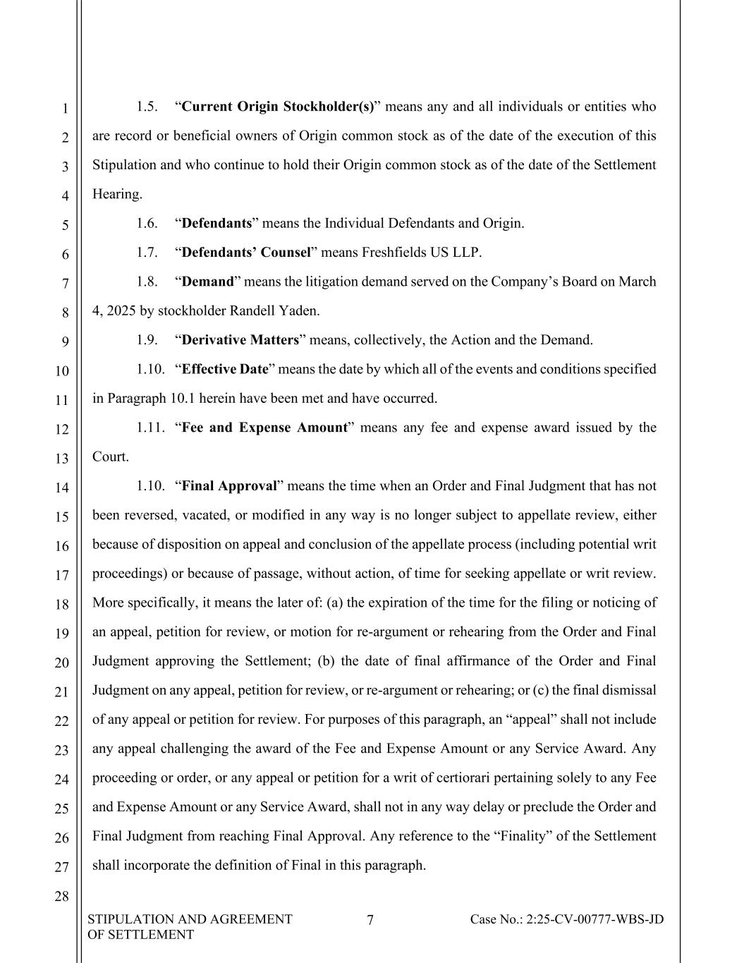 STIPULATION AND AGREEMENT OF SETTLEMENT 7 Case No.: 2:25-CV-00777-WBS-JD 1 2 3 4 5 6 7 8 9 10 11 12 13 14 15 16 17 18 19 20 21 22 23 24 25 26 27 28 1.5. “Current Origin Stockholder(s)” means any and all individuals or entities who are record or beneficial owners of Origin common stock as of the date of the execution of this Stipulation and who continue to hold their Origin common stock as of the date of the Settlement Hearing. 1.6. “Defendants” means the Individual Defendants and Origin. 1.7. “Defendants’ Counsel” means Freshfields US LLP. 1.8. “Demand” means the litigation demand served on the Company’s Board on March 4, 2025 by stockholder Randell Yaden. 1.9. “Derivative Matters” means, collectively, the Action and the Demand. 1.10. “Effective Date” means the date by which all of the events and conditions specified in Paragraph 10.1 herein have been met and have occurred. 1.11. “Fee and Expense Amount” means any fee and expense award issued by the Court. 1.10. “Final Approval” means the time when an Order and Final Judgment that has not been reversed, vacated, or modified in any way is no longer subject to appellate review, either because of disposition on appeal and conclusion of the appellate process (including potential writ proceedings) or because of passage, without action, of time for seeking appellate or writ review. More specifically, it means the later of: (a) the expiration of the time for the filing or noticing of an appeal, petition for review, or motion for re-argument or rehearing from the Order and Final Judgment approving the Settlement; (b) the date of final affirmance of the Order and Final Judgment on any appeal, petition for review, or re-argument or rehearing; or (c) the final dismissal of any appeal or petition for review. For purposes of this paragraph, an “appeal” shall not include any appeal challenging the award of the Fee and Expense Amount or any Service Award. Any proceeding or order, or any appeal or petition for a writ of certiorari pertaining solely to any Fee and Expense Amount or any Service Award, shall not in any way delay or preclude the Order and Final Judgment from reaching Final Approval. Any reference to the “Finality” of the Settlement shall incorporate the definition of Final in this paragraph.