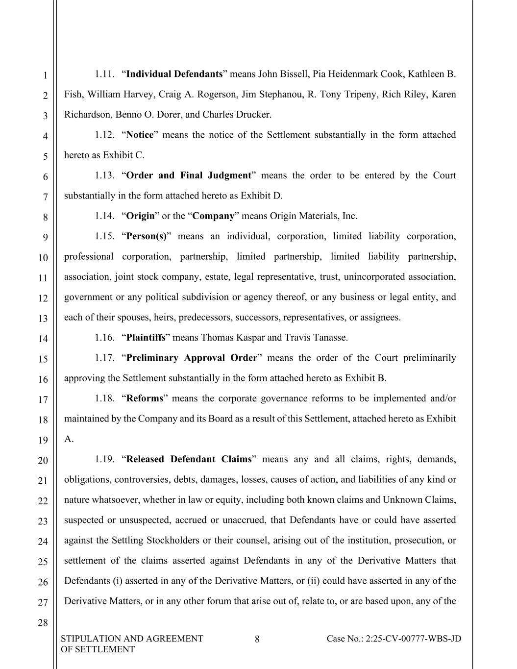 STIPULATION AND AGREEMENT OF SETTLEMENT 8 Case No.: 2:25-CV-00777-WBS-JD 1 2 3 4 5 6 7 8 9 10 11 12 13 14 15 16 17 18 19 20 21 22 23 24 25 26 27 28 1.11. “Individual Defendants” means John Bissell, Pia Heidenmark Cook, Kathleen B. Fish, William Harvey, Craig A. Rogerson, Jim Stephanou, R. Tony Tripeny, Rich Riley, Karen Richardson, Benno O. Dorer, and Charles Drucker. 1.12. “Notice” means the notice of the Settlement substantially in the form attached hereto as Exhibit C. 1.13. “Order and Final Judgment” means the order to be entered by the Court substantially in the form attached hereto as Exhibit D. 1.14. “Origin” or the “Company” means Origin Materials, Inc. 1.15. “Person(s)” means an individual, corporation, limited liability corporation, professional corporation, partnership, limited partnership, limited liability partnership, association, joint stock company, estate, legal representative, trust, unincorporated association, government or any political subdivision or agency thereof, or any business or legal entity, and each of their spouses, heirs, predecessors, successors, representatives, or assignees. 1.16. “Plaintiffs” means Thomas Kaspar and Travis Tanasse. 1.17. “Preliminary Approval Order” means the order of the Court preliminarily approving the Settlement substantially in the form attached hereto as Exhibit B. 1.18. “Reforms” means the corporate governance reforms to be implemented and/or maintained by the Company and its Board as a result of this Settlement, attached hereto as Exhibit A. 1.19. “Released Defendant Claims” means any and all claims, rights, demands, obligations, controversies, debts, damages, losses, causes of action, and liabilities of any kind or nature whatsoever, whether in law or equity, including both known claims and Unknown Claims, suspected or unsuspected, accrued or unaccrued, that Defendants have or could have asserted against the Settling Stockholders or their counsel, arising out of the institution, prosecution, or settlement of the claims asserted against Defendants in any of the Derivative Matters that Defendants (i) asserted in any of the Derivative Matters, or (ii) could have asserted in any of the Derivative Matters, or in any other forum that arise out of, relate to, or are based upon, any of the