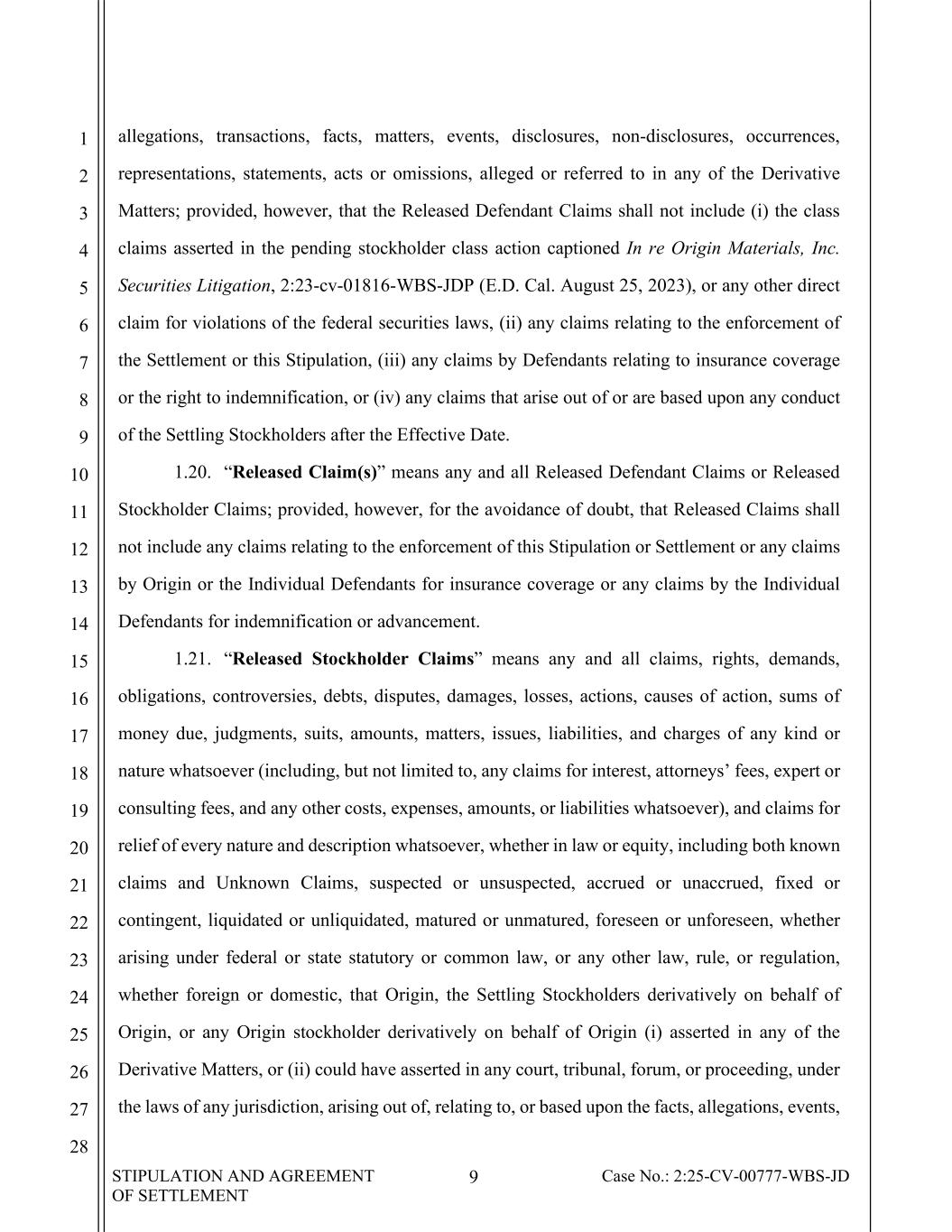 STIPULATION AND AGREEMENT OF SETTLEMENT 9 Case No.: 2:25-CV-00777-WBS-JD 1 2 3 4 5 6 7 8 9 10 11 12 13 14 15 16 17 18 19 20 21 22 23 24 25 26 27 28 allegations, transactions, facts, matters, events, disclosures, non-disclosures, occurrences, representations, statements, acts or omissions, alleged or referred to in any of the Derivative Matters; provided, however, that the Released Defendant Claims shall not include (i) the class claims asserted in the pending stockholder class action captioned In re Origin Materials, Inc. Securities Litigation, 2:23-cv-01816-WBS-JDP (E.D. Cal. August 25, 2023), or any other direct claim for violations of the federal securities laws, (ii) any claims relating to the enforcement of the Settlement or this Stipulation, (iii) any claims by Defendants relating to insurance coverage or the right to indemnification, or (iv) any claims that arise out of or are based upon any conduct of the Settling Stockholders after the Effective Date. 1.20. “Released Claim(s)” means any and all Released Defendant Claims or Released Stockholder Claims; provided, however, for the avoidance of doubt, that Released Claims shall not include any claims relating to the enforcement of this Stipulation or Settlement or any claims by Origin or the Individual Defendants for insurance coverage or any claims by the Individual Defendants for indemnification or advancement. 1.21. “Released Stockholder Claims” means any and all claims, rights, demands, obligations, controversies, debts, disputes, damages, losses, actions, causes of action, sums of money due, judgments, suits, amounts, matters, issues, liabilities, and charges of any kind or nature whatsoever (including, but not limited to, any claims for interest, attorneys’ fees, expert or consulting fees, and any other costs, expenses, amounts, or liabilities whatsoever), and claims for relief of every nature and description whatsoever, whether in law or equity, including both known claims and Unknown Claims, suspected or unsuspected, accrued or unaccrued, fixed or contingent, liquidated or unliquidated, matured or unmatured, foreseen or unforeseen, whether arising under federal or state statutory or common law, or any other law, rule, or regulation, whether foreign or domestic, that Origin, the Settling Stockholders derivatively on behalf of Origin, or any Origin stockholder derivatively on behalf of Origin (i) asserted in any of the Derivative Matters, or (ii) could have asserted in any court, tribunal, forum, or proceeding, under the laws of any jurisdiction, arising out of, relating to, or based upon the facts, allegations, events,