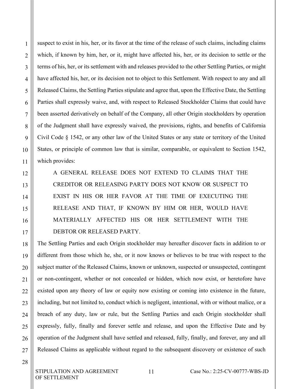 STIPULATION AND AGREEMENT OF SETTLEMENT 11 Case No.: 2:25-CV-00777-WBS-JD 1 2 3 4 5 6 7 8 9 10 11 12 13 14 15 16 17 18 19 20 21 22 23 24 25 26 27 28 suspect to exist in his, her, or its favor at the time of the release of such claims, including claims which, if known by him, her, or it, might have affected his, her, or its decision to settle or the terms of his, her, or its settlement with and releases provided to the other Settling Parties, or might have affected his, her, or its decision not to object to this Settlement. With respect to any and all Released Claims, the Settling Parties stipulate and agree that, upon the Effective Date, the Settling Parties shall expressly waive, and, with respect to Released Stockholder Claims that could have been asserted derivatively on behalf of the Company, all other Origin stockholders by operation of the Judgment shall have expressly waived, the provisions, rights, and benefits of California Civil Code § 1542, or any other law of the United States or any state or territory of the United States, or principle of common law that is similar, comparable, or equivalent to Section 1542, which provides: A GENERAL RELEASE DOES NOT EXTEND TO CLAIMS THAT THE CREDITOR OR RELEASING PARTY DOES NOT KNOW OR SUSPECT TO EXIST IN HIS OR HER FAVOR AT THE TIME OF EXECUTING THE RELEASE AND THAT, IF KNOWN BY HIM OR HER, WOULD HAVE MATERIALLY AFFECTED HIS OR HER SETTLEMENT WITH THE DEBTOR OR RELEASED PARTY. The Settling Parties and each Origin stockholder may hereafter discover facts in addition to or different from those which he, she, or it now knows or believes to be true with respect to the subject matter of the Released Claims, known or unknown, suspected or unsuspected, contingent or non-contingent, whether or not concealed or hidden, which now exist, or heretofore have existed upon any theory of law or equity now existing or coming into existence in the future, including, but not limited to, conduct which is negligent, intentional, with or without malice, or a breach of any duty, law or rule, but the Settling Parties and each Origin stockholder shall expressly, fully, finally and forever settle and release, and upon the Effective Date and by operation of the Judgment shall have settled and released, fully, finally, and forever, any and all Released Claims as applicable without regard to the subsequent discovery or existence of such