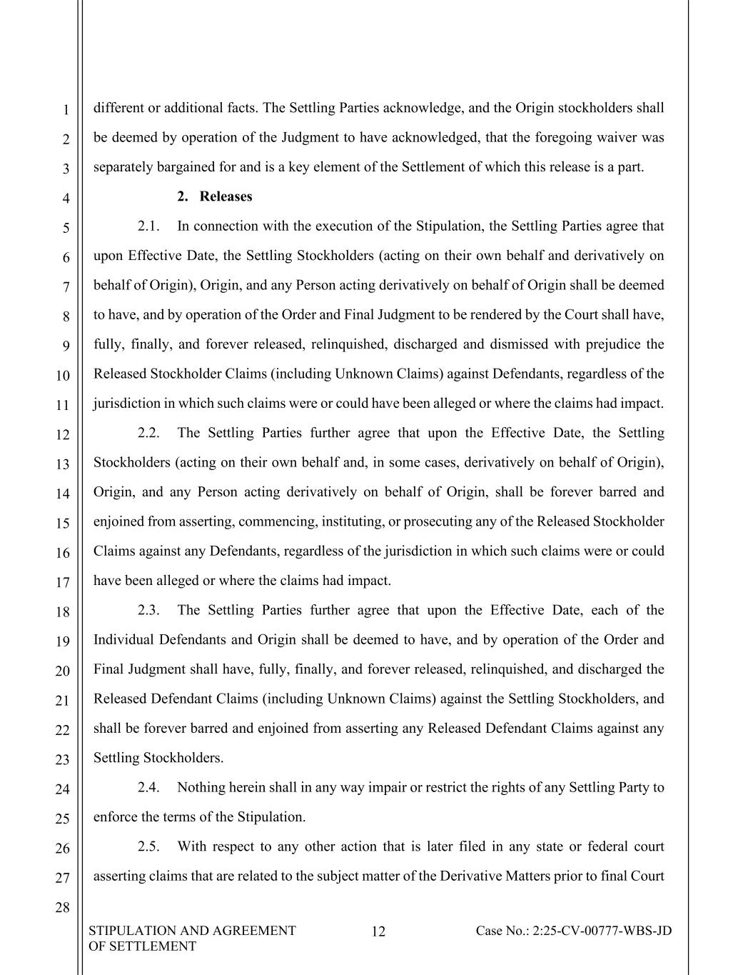 STIPULATION AND AGREEMENT OF SETTLEMENT 12 Case No.: 2:25-CV-00777-WBS-JD 1 2 3 4 5 6 7 8 9 10 11 12 13 14 15 16 17 18 19 20 21 22 23 24 25 26 27 28 different or additional facts. The Settling Parties acknowledge, and the Origin stockholders shall be deemed by operation of the Judgment to have acknowledged, that the foregoing waiver was separately bargained for and is a key element of the Settlement of which this release is a part. 2. Releases 2.1. In connection with the execution of the Stipulation, the Settling Parties agree that upon Effective Date, the Settling Stockholders (acting on their own behalf and derivatively on behalf of Origin), Origin, and any Person acting derivatively on behalf of Origin shall be deemed to have, and by operation of the Order and Final Judgment to be rendered by the Court shall have, fully, finally, and forever released, relinquished, discharged and dismissed with prejudice the Released Stockholder Claims (including Unknown Claims) against Defendants, regardless of the jurisdiction in which such claims were or could have been alleged or where the claims had impact. 2.2. The Settling Parties further agree that upon the Effective Date, the Settling Stockholders (acting on their own behalf and, in some cases, derivatively on behalf of Origin), Origin, and any Person acting derivatively on behalf of Origin, shall be forever barred and enjoined from asserting, commencing, instituting, or prosecuting any of the Released Stockholder Claims against any Defendants, regardless of the jurisdiction in which such claims were or could have been alleged or where the claims had impact. 2.3. The Settling Parties further agree that upon the Effective Date, each of the Individual Defendants and Origin shall be deemed to have, and by operation of the Order and Final Judgment shall have, fully, finally, and forever released, relinquished, and discharged the Released Defendant Claims (including Unknown Claims) against the Settling Stockholders, and shall be forever barred and enjoined from asserting any Released Defendant Claims against any Settling Stockholders. 2.4. Nothing herein shall in any way impair or restrict the rights of any Settling Party to enforce the terms of the Stipulation. 2.5. With respect to any other action that is later filed in any state or federal court asserting claims that are related to the subject matter of the Derivative Matters prior to final Court