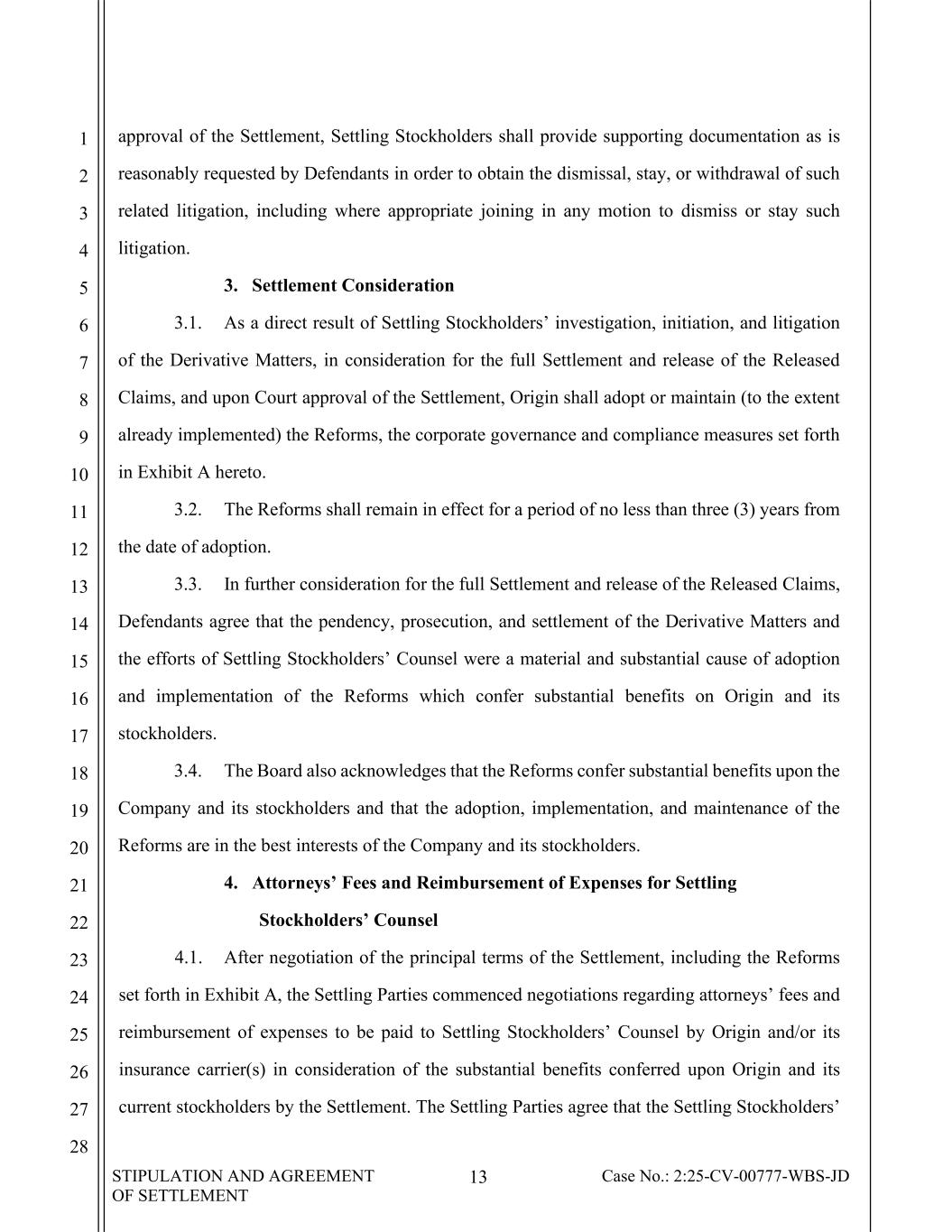 STIPULATION AND AGREEMENT OF SETTLEMENT 13 Case No.: 2:25-CV-00777-WBS-JD 1 2 3 4 5 6 7 8 9 10 11 12 13 14 15 16 17 18 19 20 21 22 23 24 25 26 27 28 approval of the Settlement, Settling Stockholders shall provide supporting documentation as is reasonably requested by Defendants in order to obtain the dismissal, stay, or withdrawal of such related litigation, including where appropriate joining in any motion to dismiss or stay such litigation. 3. Settlement Consideration 3.1. As a direct result of Settling Stockholders’ investigation, initiation, and litigation of the Derivative Matters, in consideration for the full Settlement and release of the Released Claims, and upon Court approval of the Settlement, Origin shall adopt or maintain (to the extent already implemented) the Reforms, the corporate governance and compliance measures set forth in Exhibit A hereto. 3.2. The Reforms shall remain in effect for a period of no less than three (3) years from the date of adoption. 3.3. In further consideration for the full Settlement and release of the Released Claims, Defendants agree that the pendency, prosecution, and settlement of the Derivative Matters and the efforts of Settling Stockholders’ Counsel were a material and substantial cause of adoption and implementation of the Reforms which confer substantial benefits on Origin and its stockholders. 3.4. The Board also acknowledges that the Reforms confer substantial benefits upon the Company and its stockholders and that the adoption, implementation, and maintenance of the Reforms are in the best interests of the Company and its stockholders. 4. Attorneys’ Fees and Reimbursement of Expenses for Settling Stockholders’ Counsel 4.1. After negotiation of the principal terms of the Settlement, including the Reforms set forth in Exhibit A, the Settling Parties commenced negotiations regarding attorneys’ fees and reimbursement of expenses to be paid to Settling Stockholders’ Counsel by Origin and/or its insurance carrier(s) in consideration of the substantial benefits conferred upon Origin and its current stockholders by the Settlement. The Settling Parties agree that the Settling Stockholders’