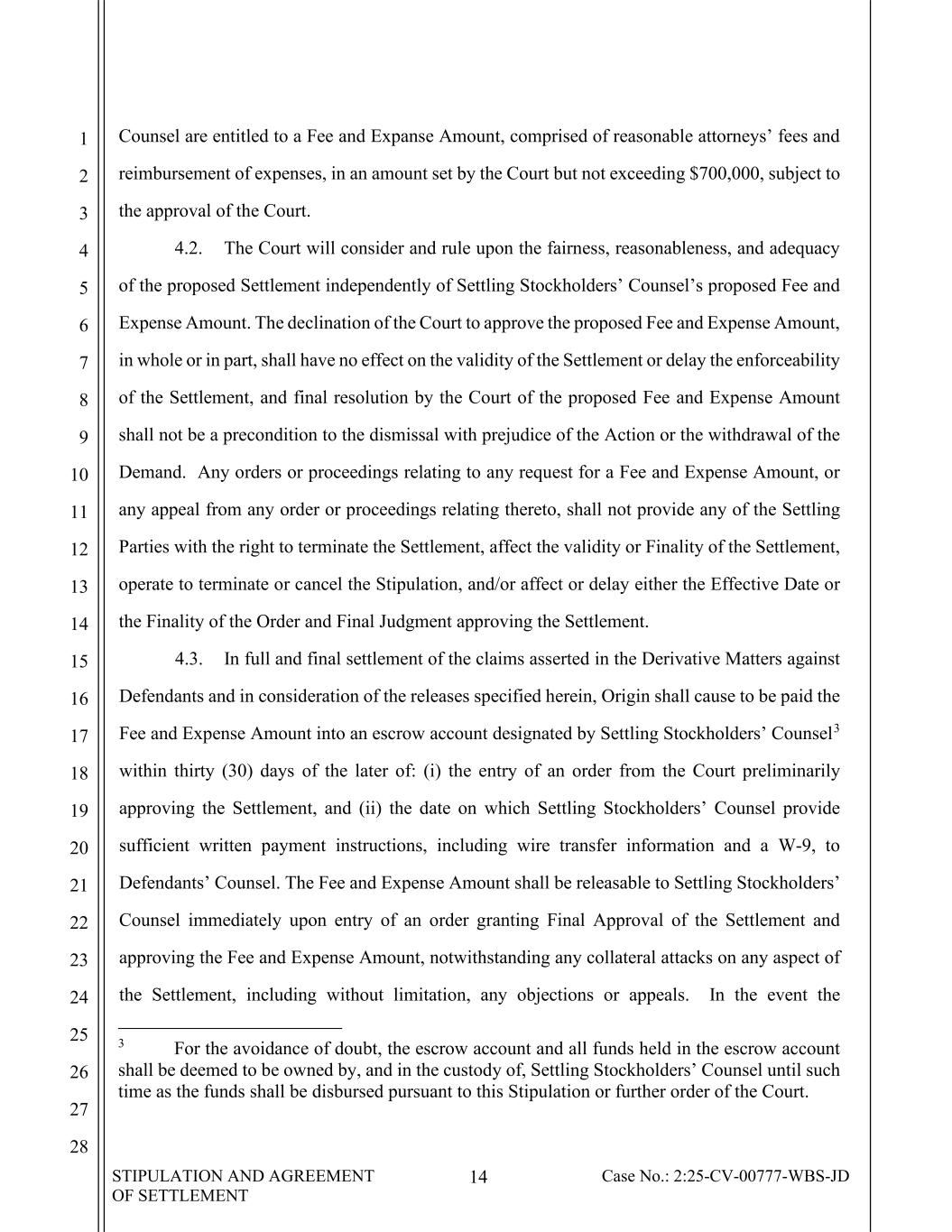 STIPULATION AND AGREEMENT OF SETTLEMENT 14 Case No.: 2:25-CV-00777-WBS-JD 1 2 3 4 5 6 7 8 9 10 11 12 13 14 15 16 17 18 19 20 21 22 23 24 25 26 27 28 Counsel are entitled to a Fee and Expanse Amount, comprised of reasonable attorneys’ fees and reimbursement of expenses, in an amount set by the Court but not exceeding $700,000, subject to the approval of the Court. 4.2. The Court will consider and rule upon the fairness, reasonableness, and adequacy of the proposed Settlement independently of Settling Stockholders’ Counsel’s proposed Fee and Expense Amount. The declination of the Court to approve the proposed Fee and Expense Amount, in whole or in part, shall have no effect on the validity of the Settlement or delay the enforceability of the Settlement, and final resolution by the Court of the proposed Fee and Expense Amount shall not be a precondition to the dismissal with prejudice of the Action or the withdrawal of the Demand. Any orders or proceedings relating to any request for a Fee and Expense Amount, or any appeal from any order or proceedings relating thereto, shall not provide any of the Settling Parties with the right to terminate the Settlement, affect the validity or Finality of the Settlement, operate to terminate or cancel the Stipulation, and/or affect or delay either the Effective Date or the Finality of the Order and Final Judgment approving the Settlement. 4.3. In full and final settlement of the claims asserted in the Derivative Matters against Defendants and in consideration of the releases specified herein, Origin shall cause to be paid the Fee and Expense Amount into an escrow account designated by Settling Stockholders’ Counsel3 within thirty (30) days of the later of: (i) the entry of an order from the Court preliminarily approving the Settlement, and (ii) the date on which Settling Stockholders’ Counsel provide sufficient written payment instructions, including wire transfer information and a W-9, to Defendants’ Counsel. The Fee and Expense Amount shall be releasable to Settling Stockholders’ Counsel immediately upon entry of an order granting Final Approval of the Settlement and approving the Fee and Expense Amount, notwithstanding any collateral attacks on any aspect of the Settlement, including without limitation, any objections or appeals. In the event the 3 For the avoidance of doubt, the escrow account and all funds held in the escrow account shall be deemed to be owned by, and in the custody of, Settling Stockholders’ Counsel until such time as the funds shall be disbursed pursuant to this Stipulation or further order of the Court.