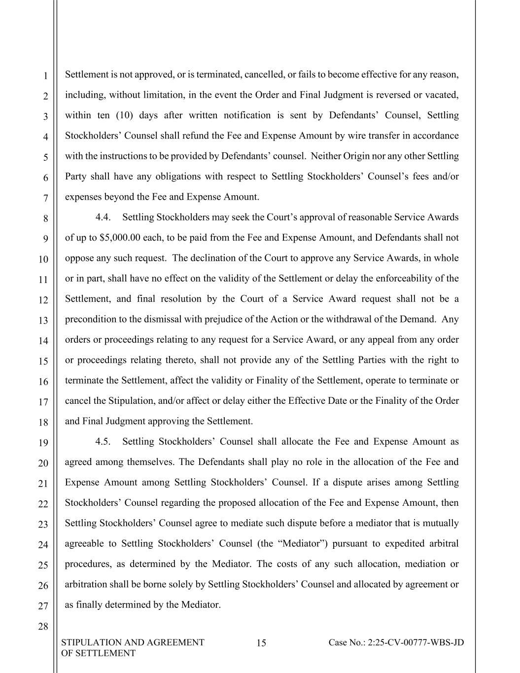 STIPULATION AND AGREEMENT OF SETTLEMENT 15 Case No.: 2:25-CV-00777-WBS-JD 1 2 3 4 5 6 7 8 9 10 11 12 13 14 15 16 17 18 19 20 21 22 23 24 25 26 27 28 Settlement is not approved, or is terminated, cancelled, or fails to become effective for any reason, including, without limitation, in the event the Order and Final Judgment is reversed or vacated, within ten (10) days after written notification is sent by Defendants’ Counsel, Settling Stockholders’ Counsel shall refund the Fee and Expense Amount by wire transfer in accordance with the instructions to be provided by Defendants’ counsel. Neither Origin nor any other Settling Party shall have any obligations with respect to Settling Stockholders’ Counsel’s fees and/or expenses beyond the Fee and Expense Amount. 4.4. Settling Stockholders may seek the Court’s approval of reasonable Service Awards of up to $5,000.00 each, to be paid from the Fee and Expense Amount, and Defendants shall not oppose any such request. The declination of the Court to approve any Service Awards, in whole or in part, shall have no effect on the validity of the Settlement or delay the enforceability of the Settlement, and final resolution by the Court of a Service Award request shall not be a precondition to the dismissal with prejudice of the Action or the withdrawal of the Demand. Any orders or proceedings relating to any request for a Service Award, or any appeal from any order or proceedings relating thereto, shall not provide any of the Settling Parties with the right to terminate the Settlement, affect the validity or Finality of the Settlement, operate to terminate or cancel the Stipulation, and/or affect or delay either the Effective Date or the Finality of the Order and Final Judgment approving the Settlement. 4.5. Settling Stockholders’ Counsel shall allocate the Fee and Expense Amount as agreed among themselves. The Defendants shall play no role in the allocation of the Fee and Expense Amount among Settling Stockholders’ Counsel. If a dispute arises among Settling Stockholders’ Counsel regarding the proposed allocation of the Fee and Expense Amount, then Settling Stockholders’ Counsel agree to mediate such dispute before a mediator that is mutually agreeable to Settling Stockholders’ Counsel (the “Mediator”) pursuant to expedited arbitral procedures, as determined by the Mediator. The costs of any such allocation, mediation or arbitration shall be borne solely by Settling Stockholders’ Counsel and allocated by agreement or as finally determined by the Mediator.