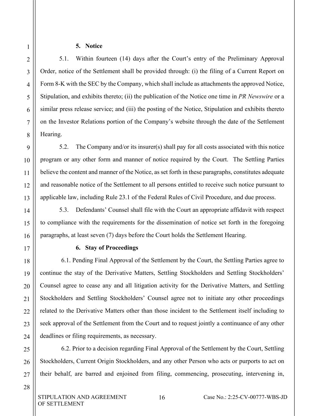 STIPULATION AND AGREEMENT OF SETTLEMENT 16 Case No.: 2:25-CV-00777-WBS-JD 1 2 3 4 5 6 7 8 9 10 11 12 13 14 15 16 17 18 19 20 21 22 23 24 25 26 27 28 5. Notice 5.1. Within fourteen (14) days after the Court’s entry of the Preliminary Approval Order, notice of the Settlement shall be provided through: (i) the filing of a Current Report on Form 8-K with the SEC by the Company, which shall include as attachments the approved Notice, Stipulation, and exhibits thereto; (ii) the publication of the Notice one time in PR Newswire or a similar press release service; and (iii) the posting of the Notice, Stipulation and exhibits thereto on the Investor Relations portion of the Company’s website through the date of the Settlement Hearing. 5.2. The Company and/or its insurer(s) shall pay for all costs associated with this notice program or any other form and manner of notice required by the Court. The Settling Parties believe the content and manner of the Notice, as set forth in these paragraphs, constitutes adequate and reasonable notice of the Settlement to all persons entitled to receive such notice pursuant to applicable law, including Rule 23.1 of the Federal Rules of Civil Procedure, and due process. 5.3. Defendants’ Counsel shall file with the Court an appropriate affidavit with respect to compliance with the requirements for the dissemination of notice set forth in the foregoing paragraphs, at least seven (7) days before the Court holds the Settlement Hearing. 6. Stay of Proceedings 6.1. Pending Final Approval of the Settlement by the Court, the Settling Parties agree to continue the stay of the Derivative Matters, Settling Stockholders and Settling Stockholders’ Counsel agree to cease any and all litigation activity for the Derivative Matters, and Settling Stockholders and Settling Stockholders’ Counsel agree not to initiate any other proceedings related to the Derivative Matters other than those incident to the Settlement itself including to seek approval of the Settlement from the Court and to request jointly a continuance of any other deadlines or filing requirements, as necessary. 6.2. Prior to a decision regarding Final Approval of the Settlement by the Court, Settling Stockholders, Current Origin Stockholders, and any other Person who acts or purports to act on their behalf, are barred and enjoined from filing, commencing, prosecuting, intervening in,