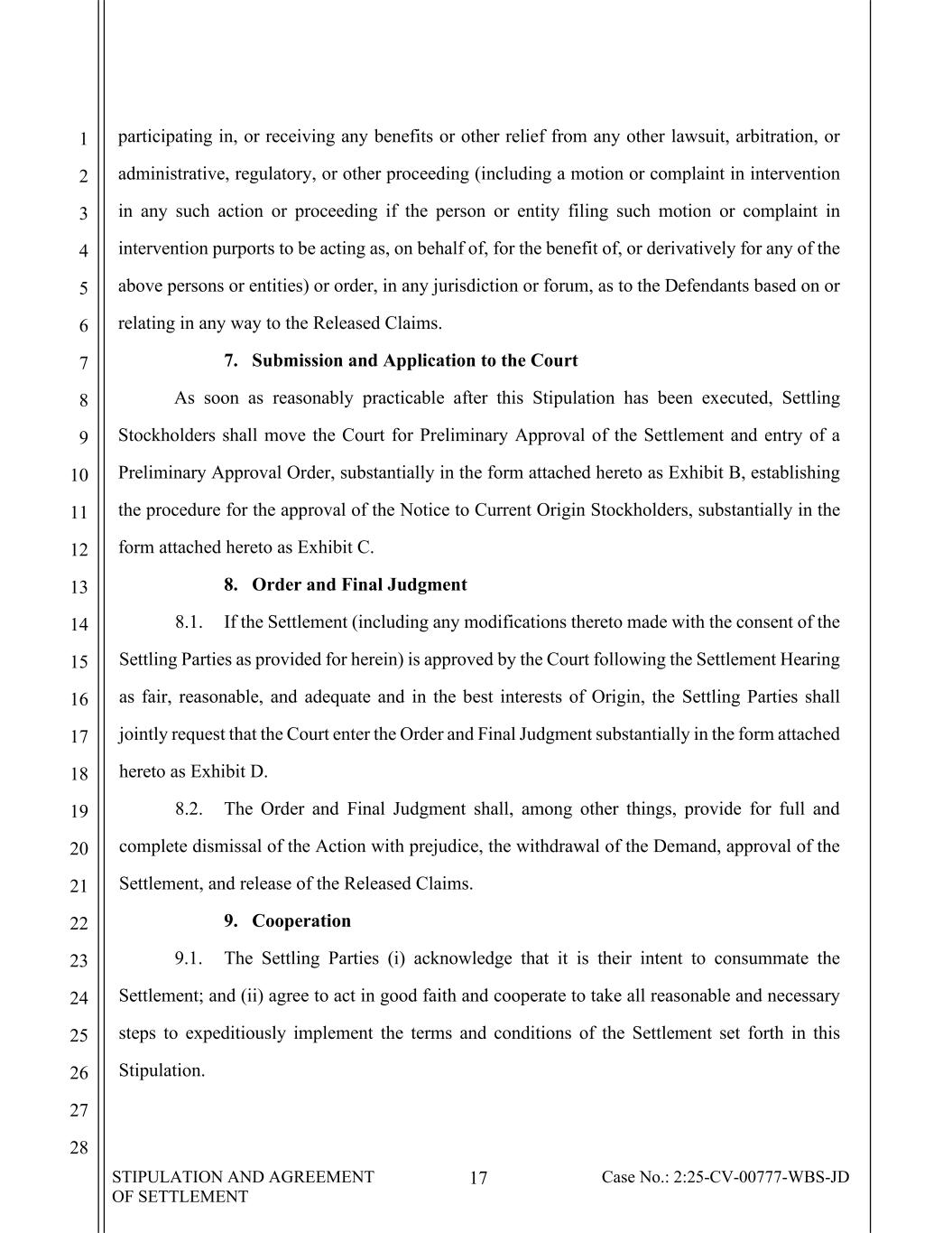 STIPULATION AND AGREEMENT OF SETTLEMENT 17 Case No.: 2:25-CV-00777-WBS-JD 1 2 3 4 5 6 7 8 9 10 11 12 13 14 15 16 17 18 19 20 21 22 23 24 25 26 27 28 participating in, or receiving any benefits or other relief from any other lawsuit, arbitration, or administrative, regulatory, or other proceeding (including a motion or complaint in intervention in any such action or proceeding if the person or entity filing such motion or complaint in intervention purports to be acting as, on behalf of, for the benefit of, or derivatively for any of the above persons or entities) or order, in any jurisdiction or forum, as to the Defendants based on or relating in any way to the Released Claims. 7. Submission and Application to the Court As soon as reasonably practicable after this Stipulation has been executed, Settling Stockholders shall move the Court for Preliminary Approval of the Settlement and entry of a Preliminary Approval Order, substantially in the form attached hereto as Exhibit B, establishing the procedure for the approval of the Notice to Current Origin Stockholders, substantially in the form attached hereto as Exhibit C. 8. Order and Final Judgment 8.1. If the Settlement (including any modifications thereto made with the consent of the Settling Parties as provided for herein) is approved by the Court following the Settlement Hearing as fair, reasonable, and adequate and in the best interests of Origin, the Settling Parties shall jointly request that the Court enter the Order and Final Judgment substantially in the form attached hereto as Exhibit D. 8.2. The Order and Final Judgment shall, among other things, provide for full and complete dismissal of the Action with prejudice, the withdrawal of the Demand, approval of the Settlement, and release of the Released Claims. 9. Cooperation 9.1. The Settling Parties (i) acknowledge that it is their intent to consummate the Settlement; and (ii) agree to act in good faith and cooperate to take all reasonable and necessary steps to expeditiously implement the terms and conditions of the Settlement set forth in this Stipulation.