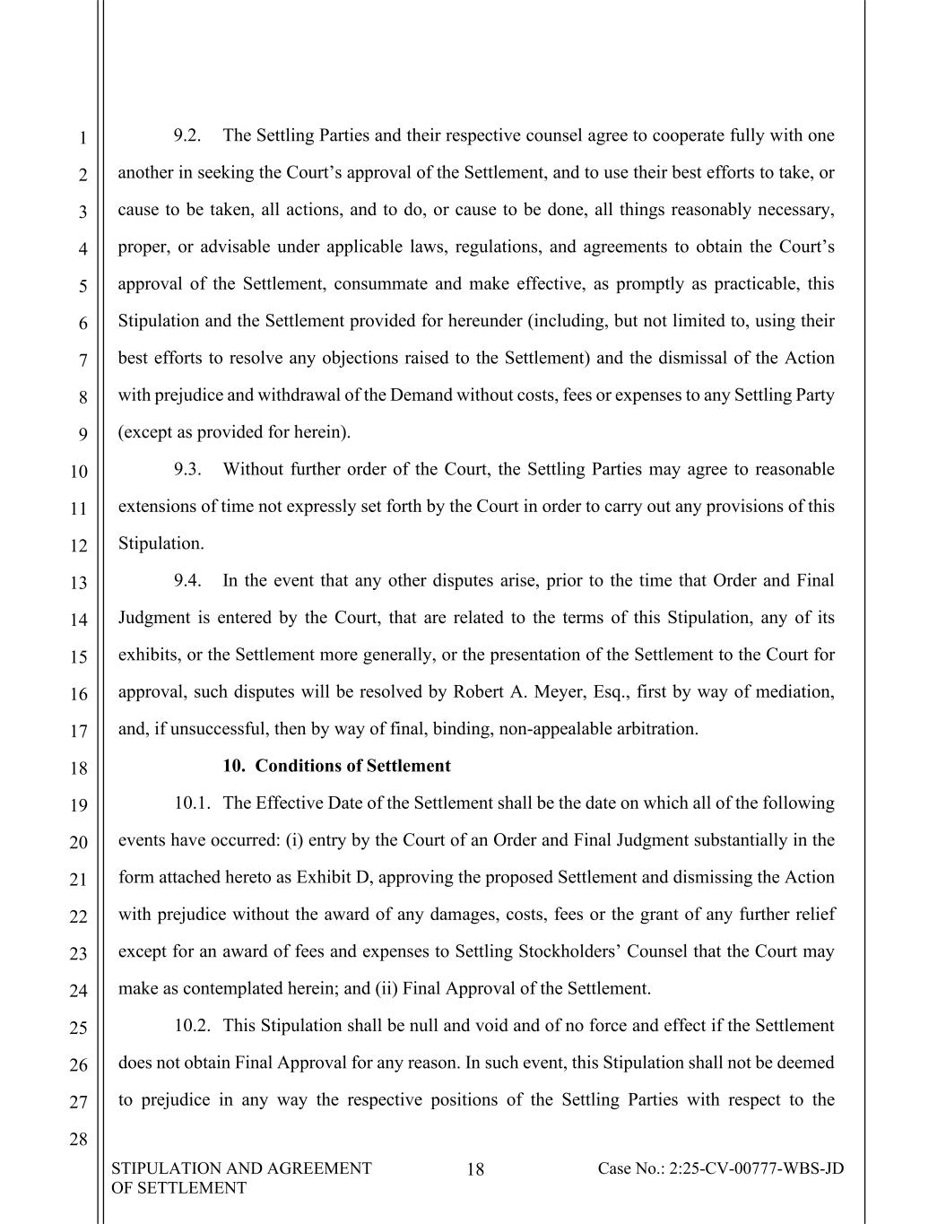STIPULATION AND AGREEMENT OF SETTLEMENT 18 Case No.: 2:25-CV-00777-WBS-JD 1 2 3 4 5 6 7 8 9 10 11 12 13 14 15 16 17 18 19 20 21 22 23 24 25 26 27 28 9.2. The Settling Parties and their respective counsel agree to cooperate fully with one another in seeking the Court’s approval of the Settlement, and to use their best efforts to take, or cause to be taken, all actions, and to do, or cause to be done, all things reasonably necessary, proper, or advisable under applicable laws, regulations, and agreements to obtain the Court’s approval of the Settlement, consummate and make effective, as promptly as practicable, this Stipulation and the Settlement provided for hereunder (including, but not limited to, using their best efforts to resolve any objections raised to the Settlement) and the dismissal of the Action with prejudice and withdrawal of the Demand without costs, fees or expenses to any Settling Party (except as provided for herein). 9.3. Without further order of the Court, the Settling Parties may agree to reasonable extensions of time not expressly set forth by the Court in order to carry out any provisions of this Stipulation. 9.4. In the event that any other disputes arise, prior to the time that Order and Final Judgment is entered by the Court, that are related to the terms of this Stipulation, any of its exhibits, or the Settlement more generally, or the presentation of the Settlement to the Court for approval, such disputes will be resolved by Robert A. Meyer, Esq., first by way of mediation, and, if unsuccessful, then by way of final, binding, non-appealable arbitration. 10. Conditions of Settlement 10.1. The Effective Date of the Settlement shall be the date on which all of the following events have occurred: (i) entry by the Court of an Order and Final Judgment substantially in the form attached hereto as Exhibit D, approving the proposed Settlement and dismissing the Action with prejudice without the award of any damages, costs, fees or the grant of any further relief except for an award of fees and expenses to Settling Stockholders’ Counsel that the Court may make as contemplated herein; and (ii) Final Approval of the Settlement. 10.2. This Stipulation shall be null and void and of no force and effect if the Settlement does not obtain Final Approval for any reason. In such event, this Stipulation shall not be deemed to prejudice in any way the respective positions of the Settling Parties with respect to the