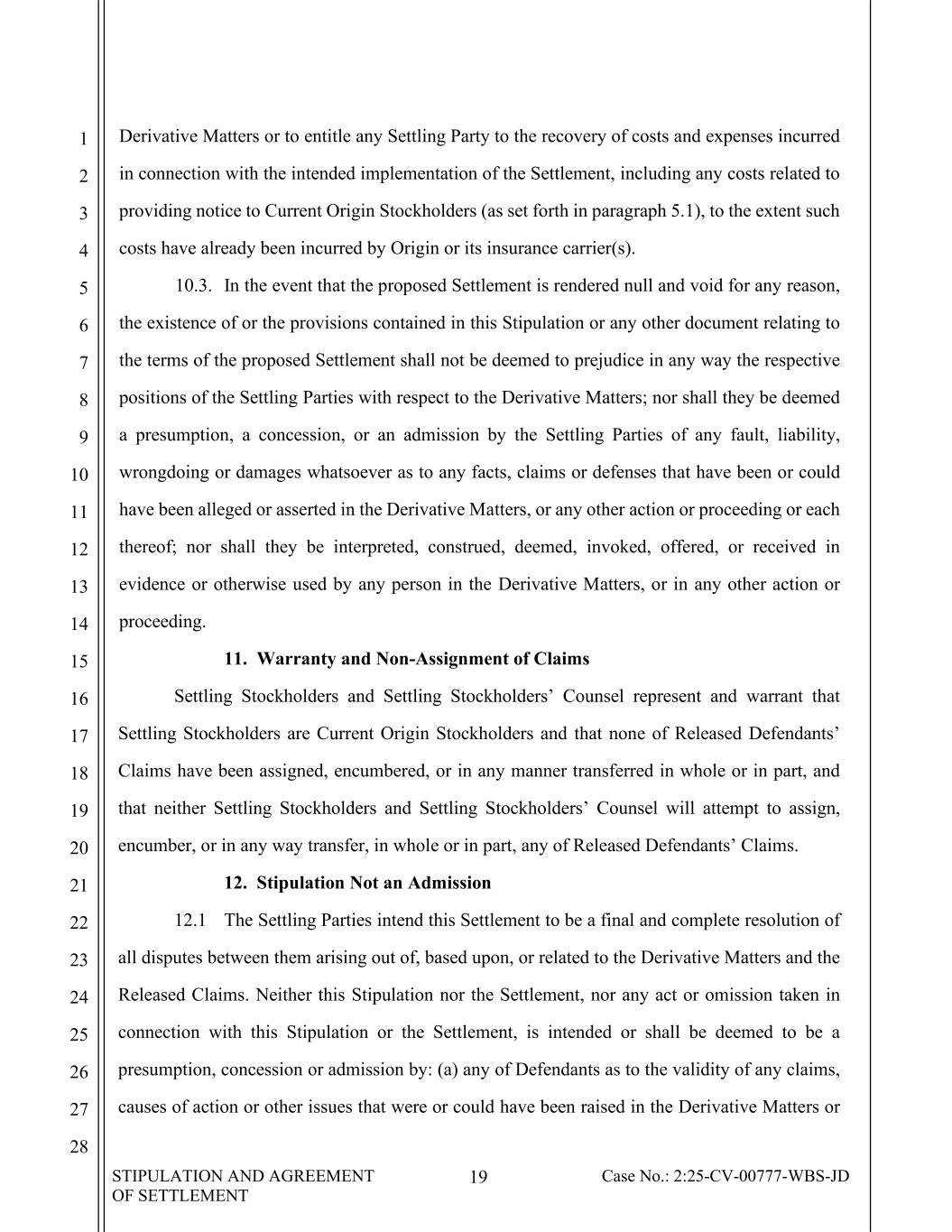 STIPULATION AND AGREEMENT OF SETTLEMENT 19 Case No.: 2:25-CV-00777-WBS-JD 1 2 3 4 5 6 7 8 9 10 11 12 13 14 15 16 17 18 19 20 21 22 23 24 25 26 27 28 Derivative Matters or to entitle any Settling Party to the recovery of costs and expenses incurred in connection with the intended implementation of the Settlement, including any costs related to providing notice to Current Origin Stockholders (as set forth in paragraph 5.1), to the extent such costs have already been incurred by Origin or its insurance carrier(s). 10.3. In the event that the proposed Settlement is rendered null and void for any reason, the existence of or the provisions contained in this Stipulation or any other document relating to the terms of the proposed Settlement shall not be deemed to prejudice in any way the respective positions of the Settling Parties with respect to the Derivative Matters; nor shall they be deemed a presumption, a concession, or an admission by the Settling Parties of any fault, liability, wrongdoing or damages whatsoever as to any facts, claims or defenses that have been or could have been alleged or asserted in the Derivative Matters, or any other action or proceeding or each thereof; nor shall they be interpreted, construed, deemed, invoked, offered, or received in evidence or otherwise used by any person in the Derivative Matters, or in any other action or proceeding. 11. Warranty and Non-Assignment of Claims Settling Stockholders and Settling Stockholders’ Counsel represent and warrant that Settling Stockholders are Current Origin Stockholders and that none of Released Defendants’ Claims have been assigned, encumbered, or in any manner transferred in whole or in part, and that neither Settling Stockholders and Settling Stockholders’ Counsel will attempt to assign, encumber, or in any way transfer, in whole or in part, any of Released Defendants’ Claims. 12. Stipulation Not an Admission 12.1 The Settling Parties intend this Settlement to be a final and complete resolution of all disputes between them arising out of, based upon, or related to the Derivative Matters and the Released Claims. Neither this Stipulation nor the Settlement, nor any act or omission taken in connection with this Stipulation or the Settlement, is intended or shall be deemed to be a presumption, concession or admission by: (a) any of Defendants as to the validity of any claims, causes of action or other issues that were or could have been raised in the Derivative Matters or