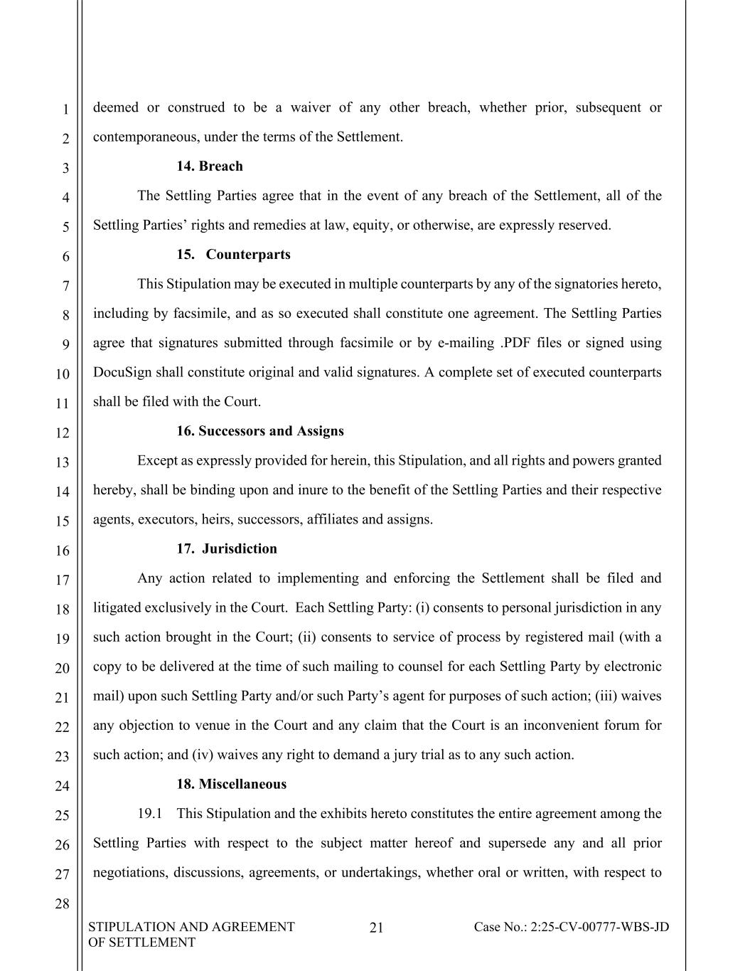 STIPULATION AND AGREEMENT OF SETTLEMENT 21 Case No.: 2:25-CV-00777-WBS-JD 1 2 3 4 5 6 7 8 9 10 11 12 13 14 15 16 17 18 19 20 21 22 23 24 25 26 27 28 deemed or construed to be a waiver of any other breach, whether prior, subsequent or contemporaneous, under the terms of the Settlement. 14. Breach The Settling Parties agree that in the event of any breach of the Settlement, all of the Settling Parties’ rights and remedies at law, equity, or otherwise, are expressly reserved. 15. Counterparts This Stipulation may be executed in multiple counterparts by any of the signatories hereto, including by facsimile, and as so executed shall constitute one agreement. The Settling Parties agree that signatures submitted through facsimile or by e-mailing .PDF files or signed using DocuSign shall constitute original and valid signatures. A complete set of executed counterparts shall be filed with the Court. 16. Successors and Assigns Except as expressly provided for herein, this Stipulation, and all rights and powers granted hereby, shall be binding upon and inure to the benefit of the Settling Parties and their respective agents, executors, heirs, successors, affiliates and assigns. 17. Jurisdiction Any action related to implementing and enforcing the Settlement shall be filed and litigated exclusively in the Court. Each Settling Party: (i) consents to personal jurisdiction in any such action brought in the Court; (ii) consents to service of process by registered mail (with a copy to be delivered at the time of such mailing to counsel for each Settling Party by electronic mail) upon such Settling Party and/or such Party’s agent for purposes of such action; (iii) waives any objection to venue in the Court and any claim that the Court is an inconvenient forum for such action; and (iv) waives any right to demand a jury trial as to any such action. 18. Miscellaneous 19.1 This Stipulation and the exhibits hereto constitutes the entire agreement among the Settling Parties with respect to the subject matter hereof and supersede any and all prior negotiations, discussions, agreements, or undertakings, whether oral or written, with respect to