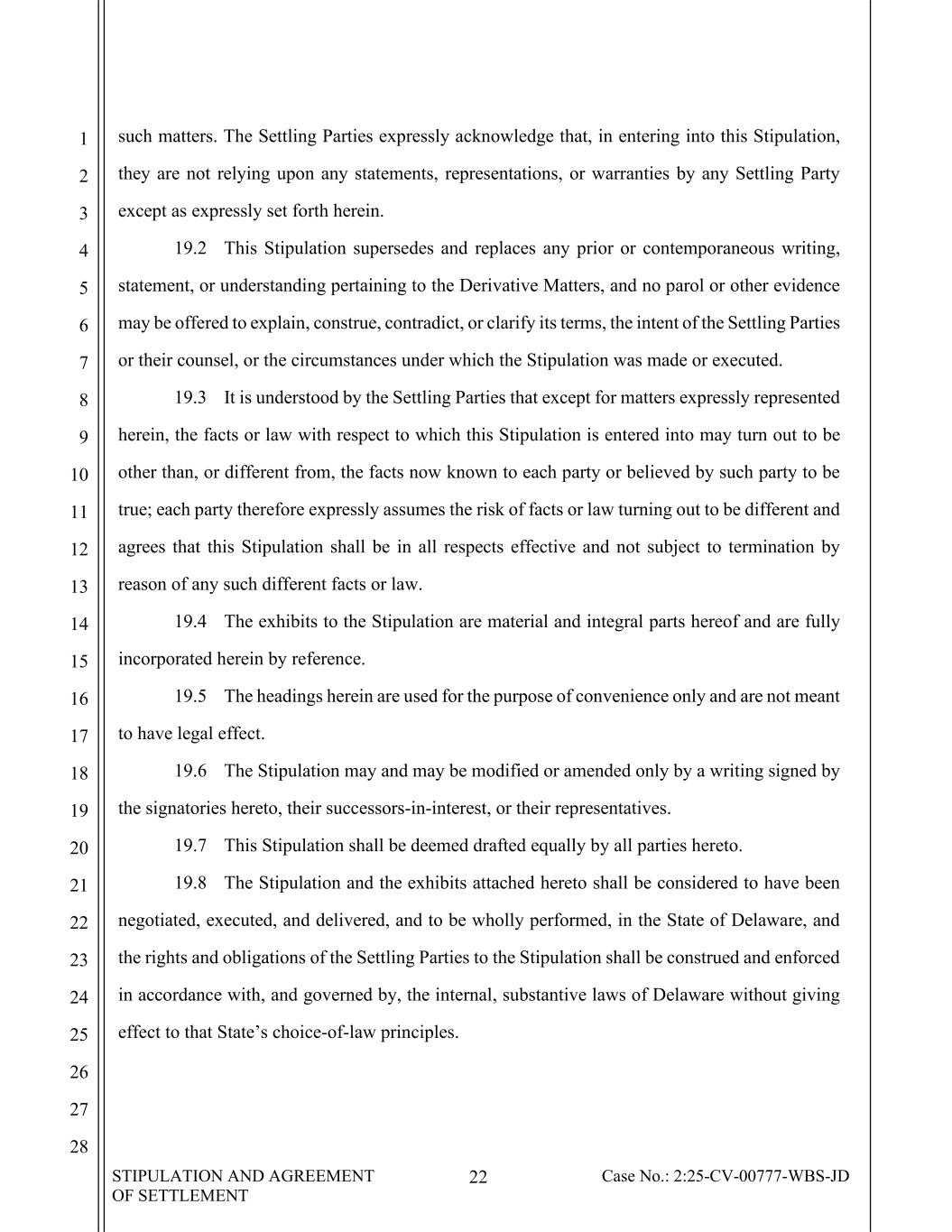 STIPULATION AND AGREEMENT OF SETTLEMENT 22 Case No.: 2:25-CV-00777-WBS-JD 1 2 3 4 5 6 7 8 9 10 11 12 13 14 15 16 17 18 19 20 21 22 23 24 25 26 27 28 such matters. The Settling Parties expressly acknowledge that, in entering into this Stipulation, they are not relying upon any statements, representations, or warranties by any Settling Party except as expressly set forth herein. 19.2 This Stipulation supersedes and replaces any prior or contemporaneous writing, statement, or understanding pertaining to the Derivative Matters, and no parol or other evidence may be offered to explain, construe, contradict, or clarify its terms, the intent of the Settling Parties or their counsel, or the circumstances under which the Stipulation was made or executed. 19.3 It is understood by the Settling Parties that except for matters expressly represented herein, the facts or law with respect to which this Stipulation is entered into may turn out to be other than, or different from, the facts now known to each party or believed by such party to be true; each party therefore expressly assumes the risk of facts or law turning out to be different and agrees that this Stipulation shall be in all respects effective and not subject to termination by reason of any such different facts or law. 19.4 The exhibits to the Stipulation are material and integral parts hereof and are fully incorporated herein by reference. 19.5 The headings herein are used for the purpose of convenience only and are not meant to have legal effect. 19.6 The Stipulation may and may be modified or amended only by a writing signed by the signatories hereto, their successors-in-interest, or their representatives. 19.7 This Stipulation shall be deemed drafted equally by all parties hereto. 19.8 The Stipulation and the exhibits attached hereto shall be considered to have been negotiated, executed, and delivered, and to be wholly performed, in the State of Delaware, and the rights and obligations of the Settling Parties to the Stipulation shall be construed and enforced in accordance with, and governed by, the internal, substantive laws of Delaware without giving effect to that State’s choice-of-law principles.
