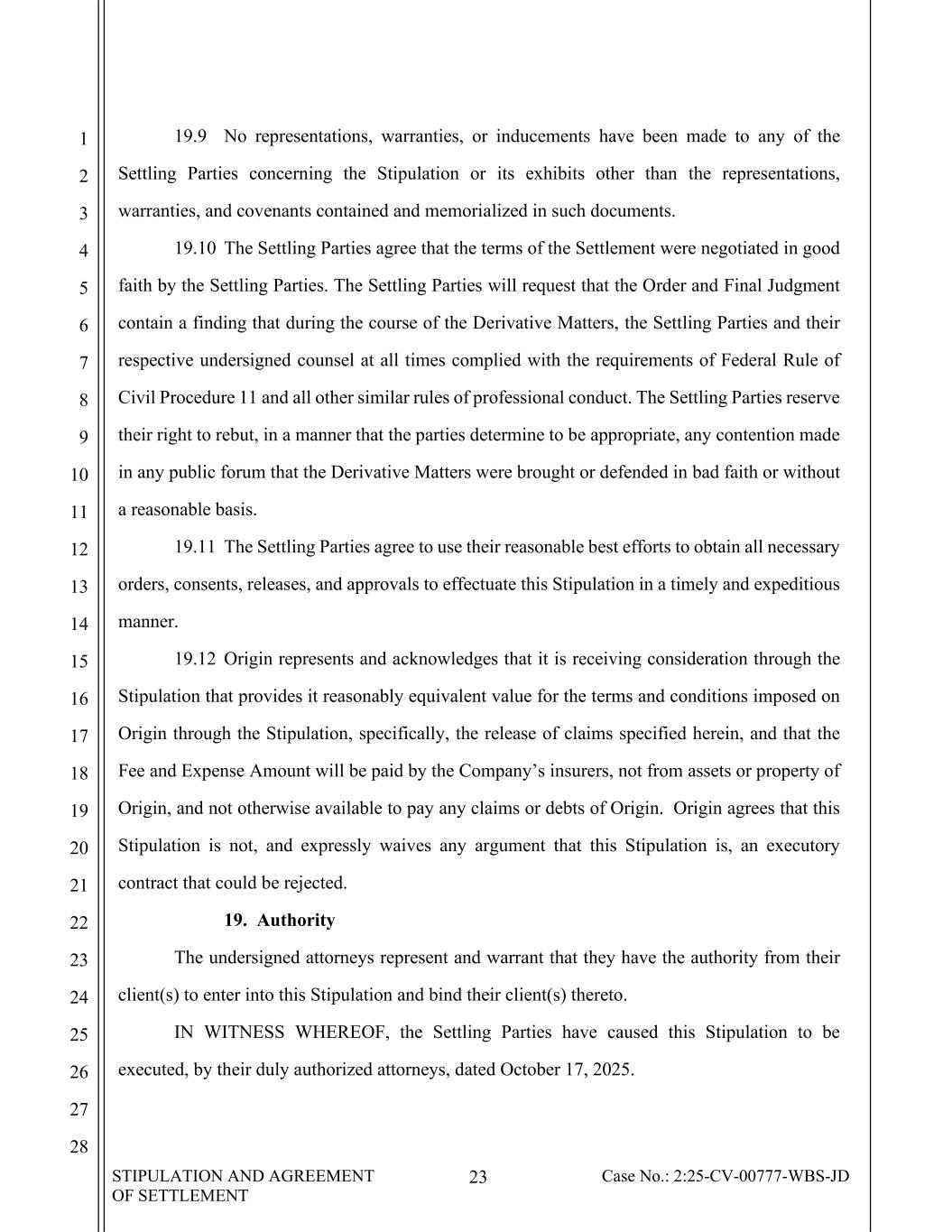 STIPULATION AND AGREEMENT OF SETTLEMENT 23 Case No.: 2:25-CV-00777-WBS-JD 1 2 3 4 5 6 7 8 9 10 11 12 13 14 15 16 17 18 19 20 21 22 23 24 25 26 27 28 19.9 No representations, warranties, or inducements have been made to any of the Settling Parties concerning the Stipulation or its exhibits other than the representations, warranties, and covenants contained and memorialized in such documents. 19.10 The Settling Parties agree that the terms of the Settlement were negotiated in good faith by the Settling Parties. The Settling Parties will request that the Order and Final Judgment contain a finding that during the course of the Derivative Matters, the Settling Parties and their respective undersigned counsel at all times complied with the requirements of Federal Rule of Civil Procedure 11 and all other similar rules of professional conduct. The Settling Parties reserve their right to rebut, in a manner that the parties determine to be appropriate, any contention made in any public forum that the Derivative Matters were brought or defended in bad faith or without a reasonable basis. 19.11 The Settling Parties agree to use their reasonable best efforts to obtain all necessary orders, consents, releases, and approvals to effectuate this Stipulation in a timely and expeditious manner. 19.12 Origin represents and acknowledges that it is receiving consideration through the Stipulation that provides it reasonably equivalent value for the terms and conditions imposed on Origin through the Stipulation, specifically, the release of claims specified herein, and that the Fee and Expense Amount will be paid by the Company’s insurers, not from assets or property of Origin, and not otherwise available to pay any claims or debts of Origin. Origin agrees that this Stipulation is not, and expressly waives any argument that this Stipulation is, an executory contract that could be rejected. 19. Authority The undersigned attorneys represent and warrant that they have the authority from their client(s) to enter into this Stipulation and bind their client(s) thereto. IN WITNESS WHEREOF, the Settling Parties have caused this Stipulation to be executed, by their duly authorized attorneys, dated October 17, 2025.