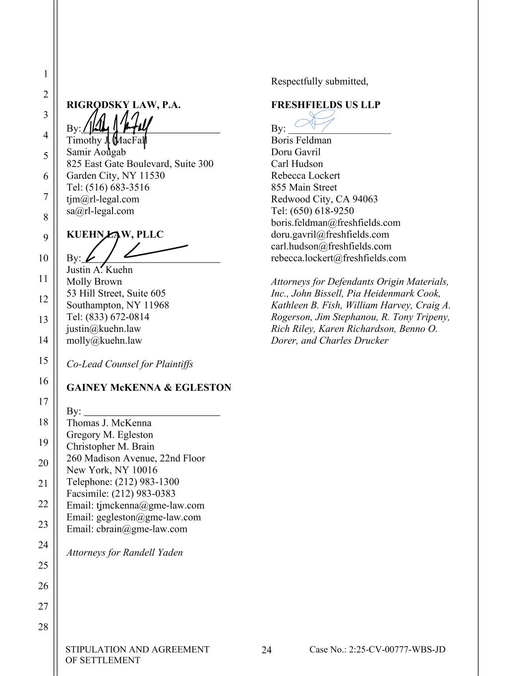 STIPULATION AND AGREEMENT OF SETTLEMENT 24 Case No.: 2:25-CV-00777-WBS-JD 1 2 3 4 5 6 7 8 9 10 11 12 13 14 15 16 17 18 19 20 21 22 23 24 25 26 27 28 RIGRODSKY LAW, P.A. By: Timothy J. MacFall Samir Aougab 825 East Gate Boulevard, Suite 300 Garden City, NY 11530 Tel: (516) 683-3516 tjm@rl-legal.com sa@rl-legal.com KUEHN LAW, PLLC By: Justin A. Kuehn Molly Brown 53 Hill Street, Suite 605 Southampton, NY 11968 Tel: (833) 672-0814 justin@kuehn.law molly@kuehn.law Co-Lead Counsel for Plaintiffs GAINEY McKENNA & EGLESTON By: Thomas J. McKenna Gregory M. Egleston Christopher M. Brain 260 Madison Avenue, 22nd Floor New York, NY 10016 Telephone: (212) 983-1300 Facsimile: (212) 983-0383 Email: tjmckenna@gme-law.com Email: gegleston@gme-law.com Email: cbrain@gme-law.com Attorneys for Randell Yaden Respectfully submitted, FRESHFIELDS US LLP By: ____________________ Boris Feldman Doru Gavril Carl Hudson Rebecca Lockert 855 Main Street Redwood City, CA 94063 Tel: (650) 618-9250 boris.feldman@freshfields.com doru.gavril@freshfields.com carl.hudson@freshfields.com rebecca.lockert@freshfields.com Attorneys for Defendants Origin Materials, Inc., John Bissell, Pia Heidenmark Cook, Kathleen B. Fish, William Harvey, Craig A. Rogerson, Jim Stephanou, R. Tony Tripeny, Rich Riley, Karen Richardson, Benno O. Dorer, and Charles Drucker