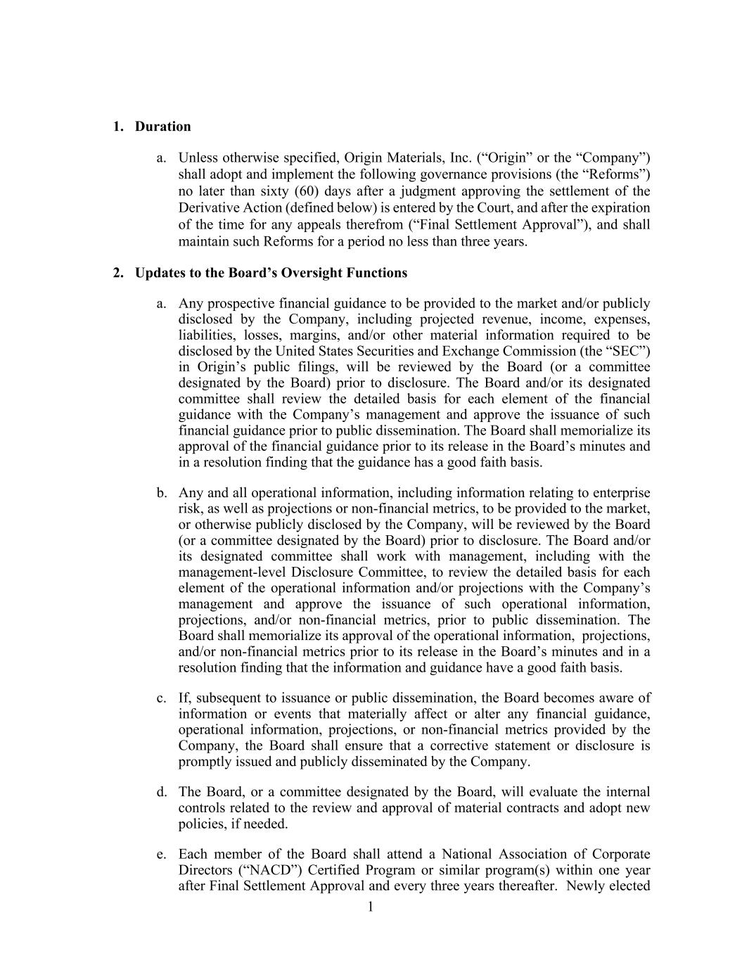 1 1. Duration a. Unless otherwise specified, Origin Materials, Inc. (“Origin” or the “Company”) shall adopt and implement the following governance provisions (the “Reforms”) no later than sixty (60) days after a judgment approving the settlement of the Derivative Action (defined below) is entered by the Court, and after the expiration of the time for any appeals therefrom (“Final Settlement Approval”), and shall maintain such Reforms for a period no less than three years. 2. Updates to the Board’s Oversight Functions a. Any prospective financial guidance to be provided to the market and/or publicly disclosed by the Company, including projected revenue, income, expenses, liabilities, losses, margins, and/or other material information required to be disclosed by the United States Securities and Exchange Commission (the “SEC”) in Origin’s public filings, will be reviewed by the Board (or a committee designated by the Board) prior to disclosure. The Board and/or its designated committee shall review the detailed basis for each element of the financial guidance with the Company’s management and approve the issuance of such financial guidance prior to public dissemination. The Board shall memorialize its approval of the financial guidance prior to its release in the Board’s minutes and in a resolution finding that the guidance has a good faith basis. b. Any and all operational information, including information relating to enterprise risk, as well as projections or non-financial metrics, to be provided to the market, or otherwise publicly disclosed by the Company, will be reviewed by the Board (or a committee designated by the Board) prior to disclosure. The Board and/or its designated committee shall work with management, including with the management-level Disclosure Committee, to review the detailed basis for each element of the operational information and/or projections with the Company’s management and approve the issuance of such operational information, projections, and/or non-financial metrics, prior to public dissemination. The Board shall memorialize its approval of the operational information, projections, and/or non-financial metrics prior to its release in the Board’s minutes and in a resolution finding that the information and guidance have a good faith basis. c. If, subsequent to issuance or public dissemination, the Board becomes aware of information or events that materially affect or alter any financial guidance, operational information, projections, or non-financial metrics provided by the Company, the Board shall ensure that a corrective statement or disclosure is promptly issued and publicly disseminated by the Company. d. The Board, or a committee designated by the Board, will evaluate the internal controls related to the review and approval of material contracts and adopt new policies, if needed. e. Each member of the Board shall attend a National Association of Corporate Directors (“NACD”) Certified Program or similar program(s) within one year after Final Settlement Approval and every three years thereafter. Newly elected