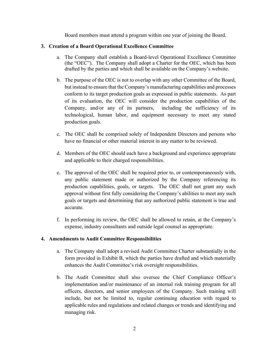 2 Board members must attend a program within one year of joining the Board. 3. Creation of a Board Operational Excellence Committee a. The Company shall establish a Board-level Operational Excellence Committee (the “OEC”). The Company shall adopt a Charter for the OEC, which has been drafted by the parties and which shall be available on the Company’s website. b. The purpose of the OEC is not to overlap with any other Committee of the Board, but instead to ensure that the Company’s manufacturing capabilities and processes conform to its target production goals as expressed in public statements. As part of its evaluation, the OEC will consider the production capabilities of the Company, and/or any of its partners, including the sufficiency of its technological, human labor, and equipment necessary to meet any stated production goals. c. The OEC shall be comprised solely of Independent Directors and persons who have no financial or other material interest in any matter to be reviewed. d. Members of the OEC should each have a background and experience appropriate and applicable to their charged responsibilities. e. The approval of the OEC shall be required prior to, or contemporaneously with, any public statement made or authorized by the Company referencing its production capabilities, goals, or targets. The OEC shall not grant any such approval without first fully considering the Company’s abilities to meet any such goals or targets and determining that any authorized public statement is true and accurate. f. In performing its review, the OEC shall be allowed to retain, at the Company’s expense, industry consultants and outside legal counsel as appropriate. 4. Amendments to Audit Committee Responsibilities a. The Company shall adopt a revised Audit Committee Charter substantially in the form provided in Exhibit B, which the parties have drafted and which materially enhances the Audit Committee’s risk oversight responsibilities. b. The Audit Committee shall also oversee the Chief Compliance Officer’s implementation and/or maintenance of an internal risk training program for all officers, directors, and senior employees of the Company. Such training will include, but not be limited to, regular continuing education with regard to applicable rules and regulations and related changes or trends and identifying and managing risk.