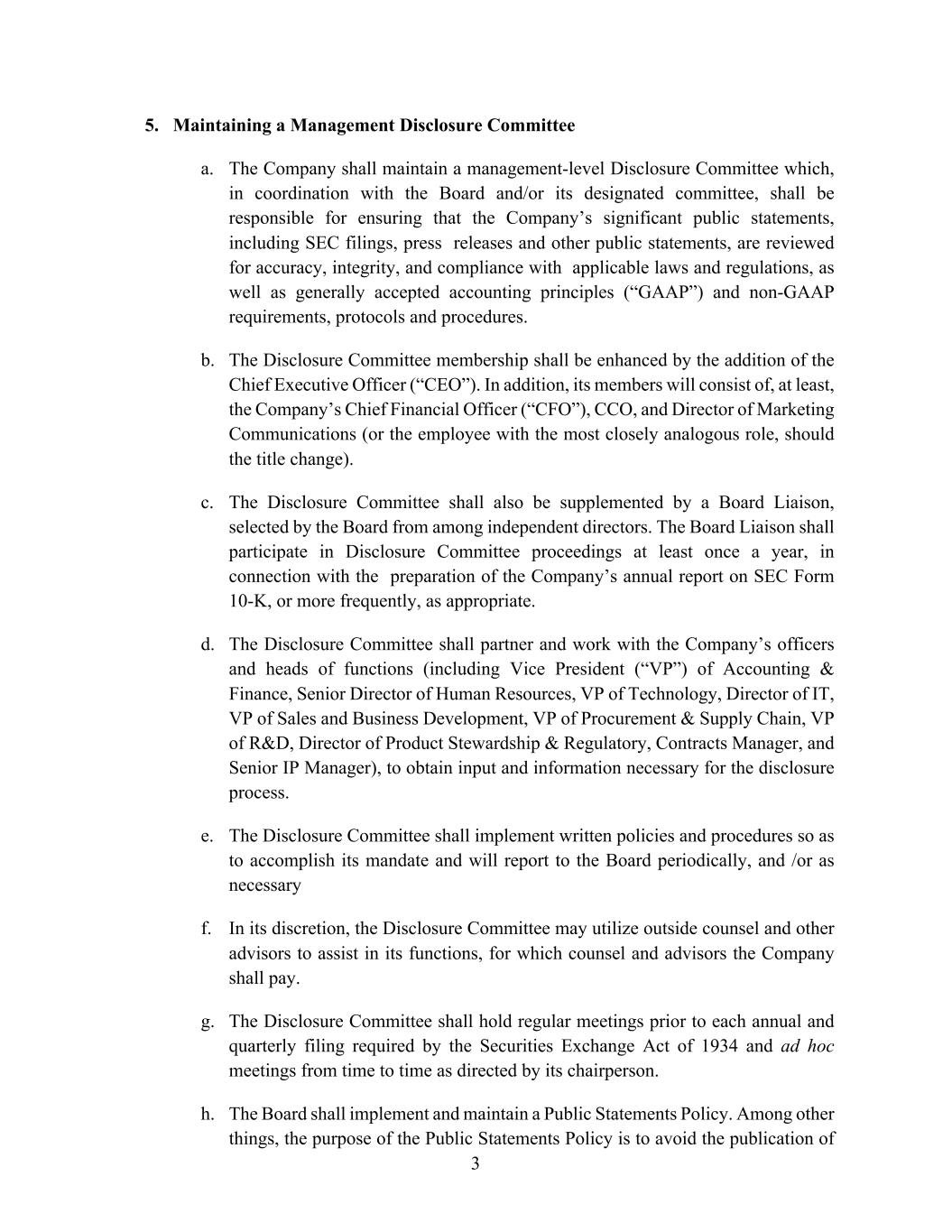3 5. Maintaining a Management Disclosure Committee a. The Company shall maintain a management-level Disclosure Committee which, in coordination with the Board and/or its designated committee, shall be responsible for ensuring that the Company’s significant public statements, including SEC filings, press releases and other public statements, are reviewed for accuracy, integrity, and compliance with applicable laws and regulations, as well as generally accepted accounting principles (“GAAP”) and non-GAAP requirements, protocols and procedures. b. The Disclosure Committee membership shall be enhanced by the addition of the Chief Executive Officer (“CEO”). In addition, its members will consist of, at least, the Company’s Chief Financial Officer (“CFO”), CCO, and Director of Marketing Communications (or the employee with the most closely analogous role, should the title change). c. The Disclosure Committee shall also be supplemented by a Board Liaison, selected by the Board from among independent directors. The Board Liaison shall participate in Disclosure Committee proceedings at least once a year, in connection with the preparation of the Company’s annual report on SEC Form 10-K, or more frequently, as appropriate. d. The Disclosure Committee shall partner and work with the Company’s officers and heads of functions (including Vice President (“VP”) of Accounting & Finance, Senior Director of Human Resources, VP of Technology, Director of IT, VP of Sales and Business Development, VP of Procurement & Supply Chain, VP of R&D, Director of Product Stewardship & Regulatory, Contracts Manager, and Senior IP Manager), to obtain input and information necessary for the disclosure process. e. The Disclosure Committee shall implement written policies and procedures so as to accomplish its mandate and will report to the Board periodically, and /or as necessary f. In its discretion, the Disclosure Committee may utilize outside counsel and other advisors to assist in its functions, for which counsel and advisors the Company shall pay. g. The Disclosure Committee shall hold regular meetings prior to each annual and quarterly filing required by the Securities Exchange Act of 1934 and ad hoc meetings from time to time as directed by its chairperson. h. The Board shall implement and maintain a Public Statements Policy. Among other things, the purpose of the Public Statements Policy is to avoid the publication of