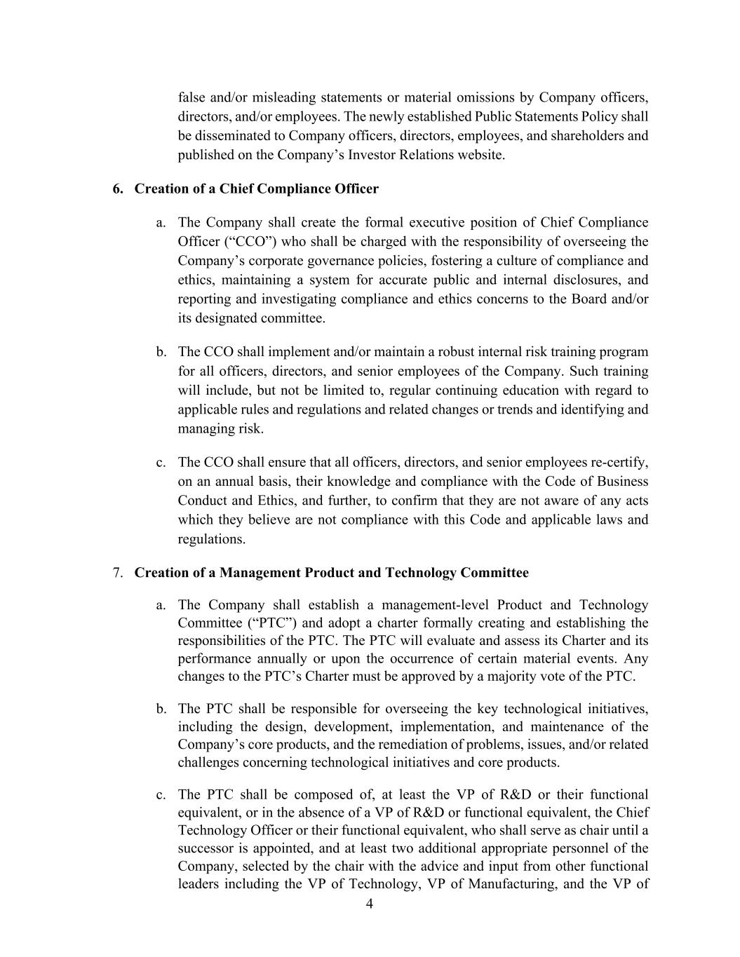 4 false and/or misleading statements or material omissions by Company officers, directors, and/or employees. The newly established Public Statements Policy shall be disseminated to Company officers, directors, employees, and shareholders and published on the Company’s Investor Relations website. 6. Creation of a Chief Compliance Officer a. The Company shall create the formal executive position of Chief Compliance Officer (“CCO”) who shall be charged with the responsibility of overseeing the Company’s corporate governance policies, fostering a culture of compliance and ethics, maintaining a system for accurate public and internal disclosures, and reporting and investigating compliance and ethics concerns to the Board and/or its designated committee. b. The CCO shall implement and/or maintain a robust internal risk training program for all officers, directors, and senior employees of the Company. Such training will include, but not be limited to, regular continuing education with regard to applicable rules and regulations and related changes or trends and identifying and managing risk. c. The CCO shall ensure that all officers, directors, and senior employees re-certify, on an annual basis, their knowledge and compliance with the Code of Business Conduct and Ethics, and further, to confirm that they are not aware of any acts which they believe are not compliance with this Code and applicable laws and regulations. 7. Creation of a Management Product and Technology Committee a. The Company shall establish a management-level Product and Technology Committee (“PTC”) and adopt a charter formally creating and establishing the responsibilities of the PTC. The PTC will evaluate and assess its Charter and its performance annually or upon the occurrence of certain material events. Any changes to the PTC’s Charter must be approved by a majority vote of the PTC. b. The PTC shall be responsible for overseeing the key technological initiatives, including the design, development, implementation, and maintenance of the Company’s core products, and the remediation of problems, issues, and/or related challenges concerning technological initiatives and core products. c. The PTC shall be composed of, at least the VP of R&D or their functional equivalent, or in the absence of a VP of R&D or functional equivalent, the Chief Technology Officer or their functional equivalent, who shall serve as chair until a successor is appointed, and at least two additional appropriate personnel of the Company, selected by the chair with the advice and input from other functional leaders including the VP of Technology, VP of Manufacturing, and the VP of