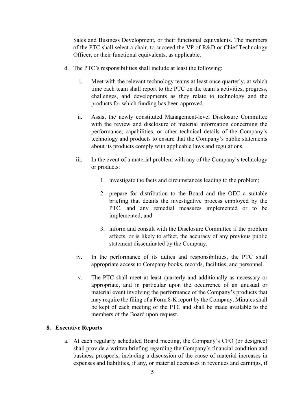 5 Sales and Business Development, or their functional equivalents. The members of the PTC shall select a chair, to succeed the VP of R&D or Chief Technology Officer, or their functional equivalents, as applicable. d. The PTC’s responsibilities shall include at least the following: i. Meet with the relevant technology teams at least once quarterly, at which time each team shall report to the PTC on the team’s activities, progress, challenges, and developments as they relate to technology and the products for which funding has been approved. ii. Assist the newly constituted Management-level Disclosure Committee with the review and disclosure of material information concerning the performance, capabilities, or other technical details of the Company’s technology and products to ensure that the Company’s public statements about its products comply with applicable laws and regulations. iii. In the event of a material problem with any of the Company’s technology or products: 1. investigate the facts and circumstances leading to the problem; 2. prepare for distribution to the Board and the OEC a suitable briefing that details the investigative process employed by the PTC, and any remedial measures implemented or to be implemented; and 3. inform and consult with the Disclosure Committee if the problem affects, or is likely to affect, the accuracy of any previous public statement disseminated by the Company. iv. In the performance of its duties and responsibilities, the PTC shall appropriate access to Company books, records, facilities, and personnel. v. The PTC shall meet at least quarterly and additionally as necessary or appropriate, and in particular upon the occurrence of an unusual or material event involving the performance of the Company’s products that may require the filing of a Form 8-K report by the Company. Minutes shall be kept of each meeting of the PTC and shall be made available to the members of the Board upon request. 8. Executive Reports a. At each regularly scheduled Board meeting, the Company’s CFO (or designee) shall provide a written briefing regarding the Company’s financial condition and business prospects, including a discussion of the cause of material increases in expenses and liabilities, if any, or material decreases in revenues and earnings, if