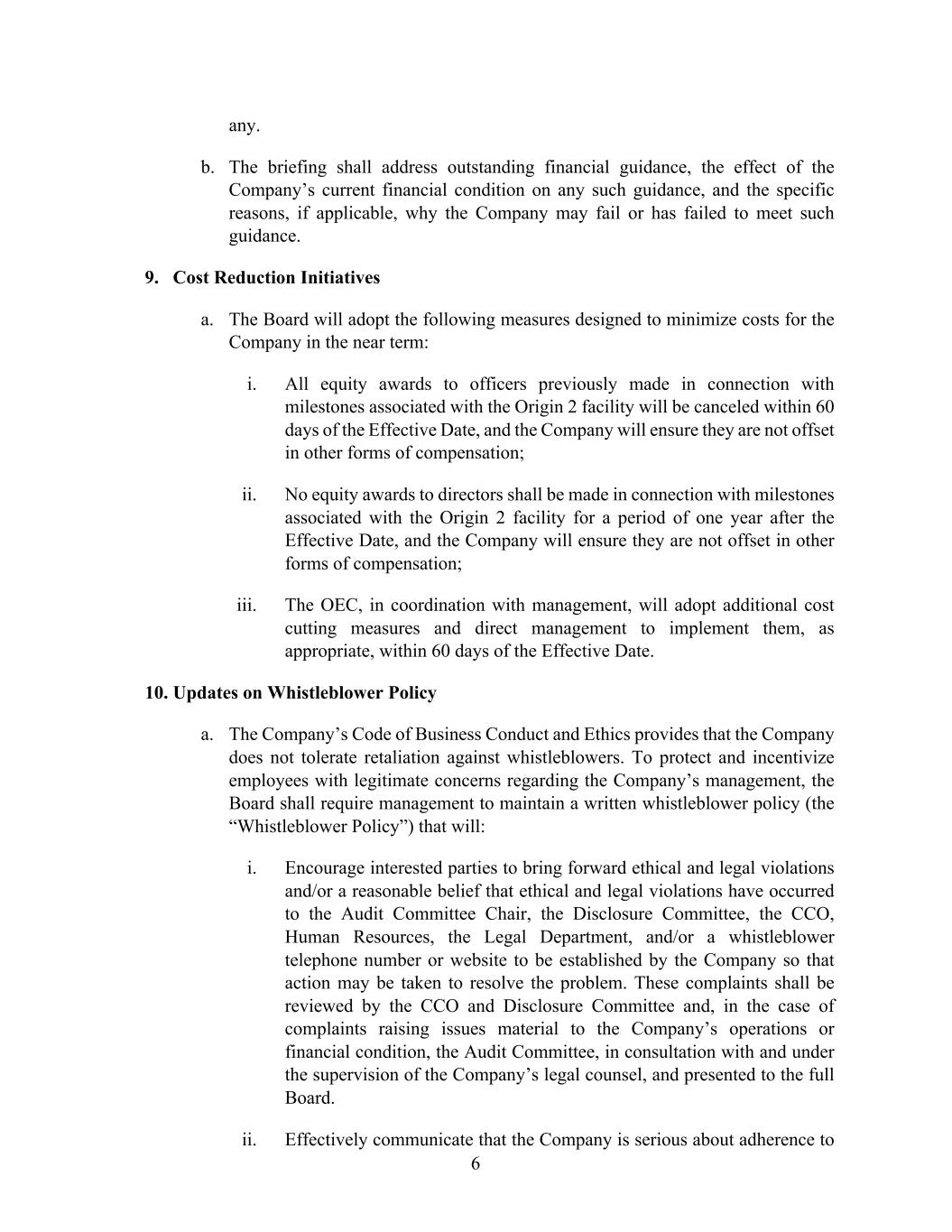 6 any. b. The briefing shall address outstanding financial guidance, the effect of the Company’s current financial condition on any such guidance, and the specific reasons, if applicable, why the Company may fail or has failed to meet such guidance. 9. Cost Reduction Initiatives a. The Board will adopt the following measures designed to minimize costs for the Company in the near term: i. All equity awards to officers previously made in connection with milestones associated with the Origin 2 facility will be canceled within 60 days of the Effective Date, and the Company will ensure they are not offset in other forms of compensation; ii. No equity awards to directors shall be made in connection with milestones associated with the Origin 2 facility for a period of one year after the Effective Date, and the Company will ensure they are not offset in other forms of compensation; iii. The OEC, in coordination with management, will adopt additional cost cutting measures and direct management to implement them, as appropriate, within 60 days of the Effective Date. 10. Updates on Whistleblower Policy a. The Company’s Code of Business Conduct and Ethics provides that the Company does not tolerate retaliation against whistleblowers. To protect and incentivize employees with legitimate concerns regarding the Company’s management, the Board shall require management to maintain a written whistleblower policy (the “Whistleblower Policy”) that will: i. Encourage interested parties to bring forward ethical and legal violations and/or a reasonable belief that ethical and legal violations have occurred to the Audit Committee Chair, the Disclosure Committee, the CCO, Human Resources, the Legal Department, and/or a whistleblower telephone number or website to be established by the Company so that action may be taken to resolve the problem. These complaints shall be reviewed by the CCO and Disclosure Committee and, in the case of complaints raising issues material to the Company’s operations or financial condition, the Audit Committee, in consultation with and under the supervision of the Company’s legal counsel, and presented to the full Board. ii. Effectively communicate that the Company is serious about adherence to