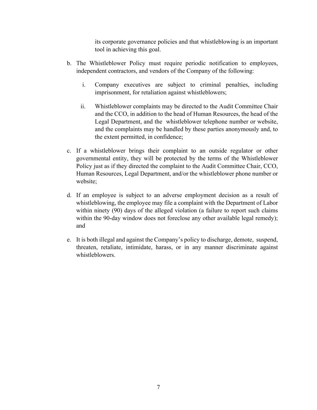 7 its corporate governance policies and that whistleblowing is an important tool in achieving this goal. b. The Whistleblower Policy must require periodic notification to employees, independent contractors, and vendors of the Company of the following: i. Company executives are subject to criminal penalties, including imprisonment, for retaliation against whistleblowers; ii. Whistleblower complaints may be directed to the Audit Committee Chair and the CCO, in addition to the head of Human Resources, the head of the Legal Department, and the whistleblower telephone number or website, and the complaints may be handled by these parties anonymously and, to the extent permitted, in confidence; c. If a whistleblower brings their complaint to an outside regulator or other governmental entity, they will be protected by the terms of the Whistleblower Policy just as if they directed the complaint to the Audit Committee Chair, CCO, Human Resources, Legal Department, and/or the whistleblower phone number or website; d. If an employee is subject to an adverse employment decision as a result of whistleblowing, the employee may file a complaint with the Department of Labor within ninety (90) days of the alleged violation (a failure to report such claims within the 90-day window does not foreclose any other available legal remedy); and e. It is both illegal and against the Company’s policy to discharge, demote, suspend, threaten, retaliate, intimidate, harass, or in any manner discriminate against whistleblowers.