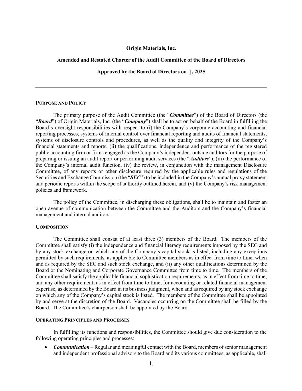 1. Origin Materials, Inc. Amended and Restated Charter of the Audit Committee of the Board of Directors Approved by the Board of Directors on [], 2025 PURPOSE AND POLICY The primary purpose of the Audit Committee (the “Committee”) of the Board of Directors (the “Board”) of Origin Materials, Inc. (the “Company”) shall be to act on behalf of the Board in fulfilling the Board’s oversight responsibilities with respect to (i) the Company’s corporate accounting and financial reporting processes, systems of internal control over financial reporting and audits of financial statements, systems of disclosure controls and procedures, as well as the quality and integrity of the Company’s financial statements and reports, (ii) the qualifications, independence and performance of the registered public accounting firm or firms engaged as the Company’s independent outside auditors for the purpose of preparing or issuing an audit report or performing audit services (the “Auditors”), (iii) the performance of the Company’s internal audit function, (iv) the review, in conjunction with the management Disclosure Committee, of any reports or other disclosure required by the applicable rules and regulations of the Securities and Exchange Commission (the “SEC”) to be included in the Company’s annual proxy statement and periodic reports within the scope of authority outlined herein, and (v) the Company’s risk management policies and framework. The policy of the Committee, in discharging these obligations, shall be to maintain and foster an open avenue of communication between the Committee and the Auditors and the Company’s financial management and internal auditors. COMPOSITION The Committee shall consist of at least three (3) members of the Board. The members of the Committee shall satisfy (i) the independence and financial literacy requirements imposed by the SEC and by any stock exchange on which any of the Company’s capital stock is listed, including any exceptions permitted by such requirements, as applicable to Committee members as in effect from time to time, when and as required by the SEC and such stock exchange, and (ii) any other qualifications determined by the Board or the Nominating and Corporate Governance Committee from time to time. The members of the Committee shall satisfy the applicable financial sophistication requirements, as in effect from time to time, and any other requirement, as in effect from time to time, for accounting or related financial management expertise, as determined by the Board in its business judgment, when and as required by any stock exchange on which any of the Company’s capital stock is listed. The members of the Committee shall be appointed by and serve at the discretion of the Board. Vacancies occurring on the Committee shall be filled by the Board. The Committee’s chairperson shall be appointed by the Board. OPERATING PRINCIPLES AND PROCESSES In fulfilling its functions and responsibilities, the Committee should give due consideration to the following operating principles and processes: • Communication – Regular and meaningful contact with the Board, members of senior management and independent professional advisors to the Board and its various committees, as applicable, shall