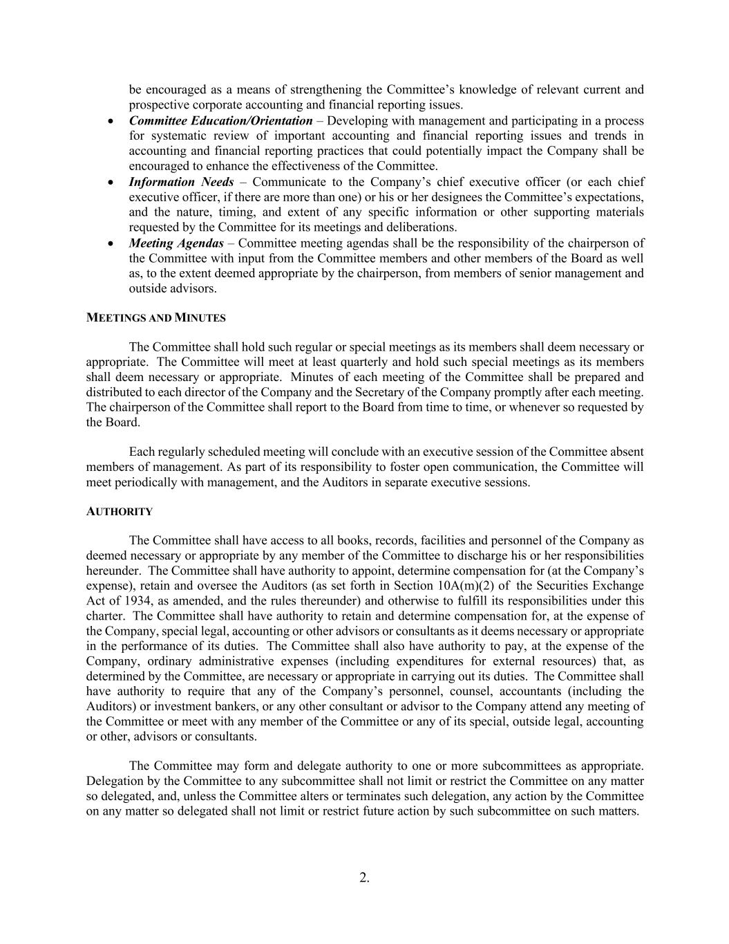 2. be encouraged as a means of strengthening the Committee’s knowledge of relevant current and prospective corporate accounting and financial reporting issues. • Committee Education/Orientation – Developing with management and participating in a process for systematic review of important accounting and financial reporting issues and trends in accounting and financial reporting practices that could potentially impact the Company shall be encouraged to enhance the effectiveness of the Committee. • Information Needs – Communicate to the Company’s chief executive officer (or each chief executive officer, if there are more than one) or his or her designees the Committee’s expectations, and the nature, timing, and extent of any specific information or other supporting materials requested by the Committee for its meetings and deliberations. • Meeting Agendas – Committee meeting agendas shall be the responsibility of the chairperson of the Committee with input from the Committee members and other members of the Board as well as, to the extent deemed appropriate by the chairperson, from members of senior management and outside advisors. MEETINGS AND MINUTES The Committee shall hold such regular or special meetings as its members shall deem necessary or appropriate. The Committee will meet at least quarterly and hold such special meetings as its members shall deem necessary or appropriate. Minutes of each meeting of the Committee shall be prepared and distributed to each director of the Company and the Secretary of the Company promptly after each meeting. The chairperson of the Committee shall report to the Board from time to time, or whenever so requested by the Board. Each regularly scheduled meeting will conclude with an executive session of the Committee absent members of management. As part of its responsibility to foster open communication, the Committee will meet periodically with management, and the Auditors in separate executive sessions. AUTHORITY The Committee shall have access to all books, records, facilities and personnel of the Company as deemed necessary or appropriate by any member of the Committee to discharge his or her responsibilities hereunder. The Committee shall have authority to appoint, determine compensation for (at the Company’s expense), retain and oversee the Auditors (as set forth in Section 10A(m)(2) of the Securities Exchange Act of 1934, as amended, and the rules thereunder) and otherwise to fulfill its responsibilities under this charter. The Committee shall have authority to retain and determine compensation for, at the expense of the Company, special legal, accounting or other advisors or consultants as it deems necessary or appropriate in the performance of its duties. The Committee shall also have authority to pay, at the expense of the Company, ordinary administrative expenses (including expenditures for external resources) that, as determined by the Committee, are necessary or appropriate in carrying out its duties. The Committee shall have authority to require that any of the Company’s personnel, counsel, accountants (including the Auditors) or investment bankers, or any other consultant or advisor to the Company attend any meeting of the Committee or meet with any member of the Committee or any of its special, outside legal, accounting or other, advisors or consultants. The Committee may form and delegate authority to one or more subcommittees as appropriate. Delegation by the Committee to any subcommittee shall not limit or restrict the Committee on any matter so delegated, and, unless the Committee alters or terminates such delegation, any action by the Committee on any matter so delegated shall not limit or restrict future action by such subcommittee on such matters.