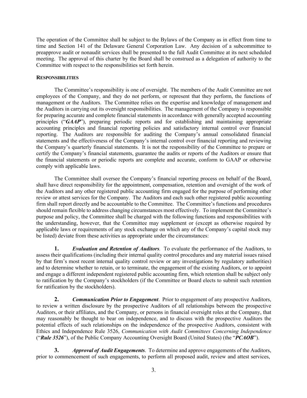 3. The operation of the Committee shall be subject to the Bylaws of the Company as in effect from time to time and Section 141 of the Delaware General Corporation Law. Any decision of a subcommittee to preapprove audit or nonaudit services shall be presented to the full Audit Committee at its next scheduled meeting. The approval of this charter by the Board shall be construed as a delegation of authority to the Committee with respect to the responsibilities set forth herein. RESPONSIBILITIES The Committee’s responsibility is one of oversight. The members of the Audit Committee are not employees of the Company, and they do not perform, or represent that they perform, the functions of management or the Auditors. The Committee relies on the expertise and knowledge of management and the Auditors in carrying out its oversight responsibilities. The management of the Company is responsible for preparing accurate and complete financial statements in accordance with generally accepted accounting principles (“GAAP”), preparing periodic reports and for establishing and maintaining appropriate accounting principles and financial reporting policies and satisfactory internal control over financial reporting. The Auditors are responsible for auditing the Company’s annual consolidated financial statements and the effectiveness of the Company’s internal control over financial reporting and reviewing the Company’s quarterly financial statements. It is not the responsibility of the Committee to prepare or certify the Company’s financial statements, guarantee the audits or reports of the Auditors or ensure that the financial statements or periodic reports are complete and accurate, conform to GAAP or otherwise comply with applicable laws. The Committee shall oversee the Company’s financial reporting process on behalf of the Board, shall have direct responsibility for the appointment, compensation, retention and oversight of the work of the Auditors and any other registered public accounting firm engaged for the purpose of performing other review or attest services for the Company. The Auditors and each such other registered public accounting firm shall report directly and be accountable to the Committee. The Committee’s functions and procedures should remain flexible to address changing circumstances most effectively. To implement the Committee’s purpose and policy, the Committee shall be charged with the following functions and responsibilities with the understanding, however, that the Committee may supplement or (except as otherwise required by applicable laws or requirements of any stock exchange on which any of the Company’s capital stock may be listed) deviate from these activities as appropriate under the circumstances: 1. Evaluation and Retention of Auditors. To evaluate the performance of the Auditors, to assess their qualifications (including their internal quality control procedures and any material issues raised by that firm’s most recent internal quality control review or any investigations by regulatory authorities) and to determine whether to retain, or to terminate, the engagement of the existing Auditors, or to appoint and engage a different independent registered public accounting firm, which retention shall be subject only to ratification by the Company’s stockholders (if the Committee or Board elects to submit such retention for ratification by the stockholders). 2. Communication Prior to Engagement. Prior to engagement of any prospective Auditors, to review a written disclosure by the prospective Auditors of all relationships between the prospective Auditors, or their affiliates, and the Company, or persons in financial oversight roles at the Company, that may reasonably be thought to bear on independence, and to discuss with the prospective Auditors the potential effects of such relationships on the independence of the prospective Auditors, consistent with Ethics and Independence Rule 3526, Communication with Audit Committees Concerning Independence (“Rule 3526”), of the Public Company Accounting Oversight Board (United States) (the “PCAOB”). 3. Approval of Audit Engagements. To determine and approve engagements of the Auditors, prior to commencement of such engagements, to perform all proposed audit, review and attest services,
