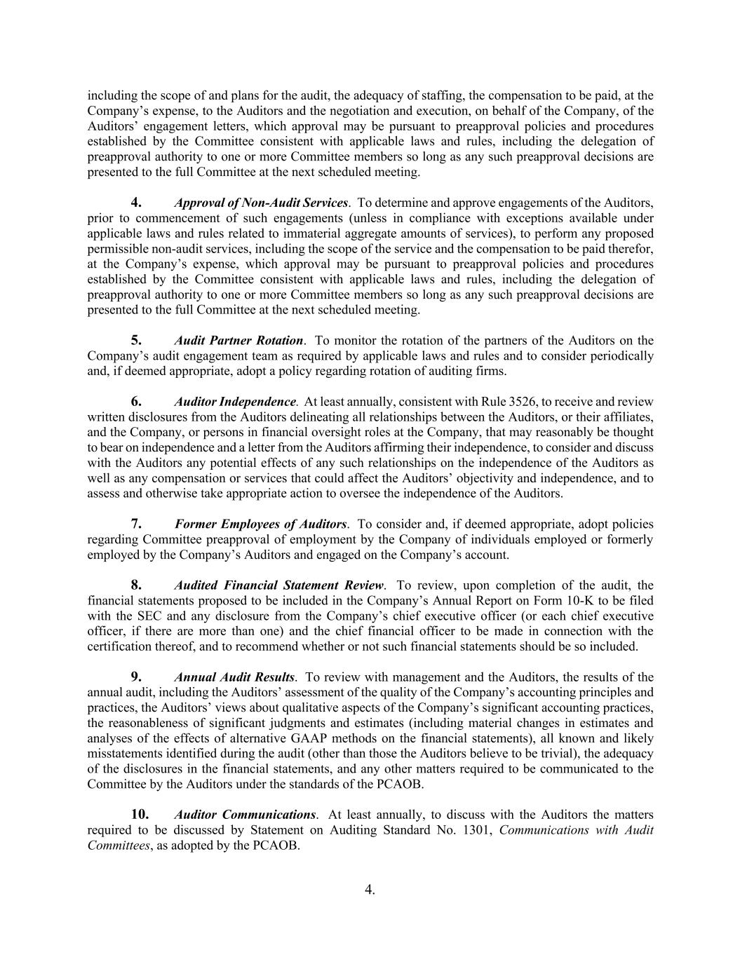 4. including the scope of and plans for the audit, the adequacy of staffing, the compensation to be paid, at the Company’s expense, to the Auditors and the negotiation and execution, on behalf of the Company, of the Auditors’ engagement letters, which approval may be pursuant to preapproval policies and procedures established by the Committee consistent with applicable laws and rules, including the delegation of preapproval authority to one or more Committee members so long as any such preapproval decisions are presented to the full Committee at the next scheduled meeting. 4. Approval of Non-Audit Services. To determine and approve engagements of the Auditors, prior to commencement of such engagements (unless in compliance with exceptions available under applicable laws and rules related to immaterial aggregate amounts of services), to perform any proposed permissible non-audit services, including the scope of the service and the compensation to be paid therefor, at the Company’s expense, which approval may be pursuant to preapproval policies and procedures established by the Committee consistent with applicable laws and rules, including the delegation of preapproval authority to one or more Committee members so long as any such preapproval decisions are presented to the full Committee at the next scheduled meeting. 5. Audit Partner Rotation. To monitor the rotation of the partners of the Auditors on the Company’s audit engagement team as required by applicable laws and rules and to consider periodically and, if deemed appropriate, adopt a policy regarding rotation of auditing firms. 6. Auditor Independence. At least annually, consistent with Rule 3526, to receive and review written disclosures from the Auditors delineating all relationships between the Auditors, or their affiliates, and the Company, or persons in financial oversight roles at the Company, that may reasonably be thought to bear on independence and a letter from the Auditors affirming their independence, to consider and discuss with the Auditors any potential effects of any such relationships on the independence of the Auditors as well as any compensation or services that could affect the Auditors’ objectivity and independence, and to assess and otherwise take appropriate action to oversee the independence of the Auditors. 7. Former Employees of Auditors. To consider and, if deemed appropriate, adopt policies regarding Committee preapproval of employment by the Company of individuals employed or formerly employed by the Company’s Auditors and engaged on the Company’s account. 8. Audited Financial Statement Review. To review, upon completion of the audit, the financial statements proposed to be included in the Company’s Annual Report on Form 10-K to be filed with the SEC and any disclosure from the Company’s chief executive officer (or each chief executive officer, if there are more than one) and the chief financial officer to be made in connection with the certification thereof, and to recommend whether or not such financial statements should be so included. 9. Annual Audit Results. To review with management and the Auditors, the results of the annual audit, including the Auditors’ assessment of the quality of the Company’s accounting principles and practices, the Auditors’ views about qualitative aspects of the Company’s significant accounting practices, the reasonableness of significant judgments and estimates (including material changes in estimates and analyses of the effects of alternative GAAP methods on the financial statements), all known and likely misstatements identified during the audit (other than those the Auditors believe to be trivial), the adequacy of the disclosures in the financial statements, and any other matters required to be communicated to the Committee by the Auditors under the standards of the PCAOB. 10. Auditor Communications. At least annually, to discuss with the Auditors the matters required to be discussed by Statement on Auditing Standard No. 1301, Communications with Audit Committees, as adopted by the PCAOB.