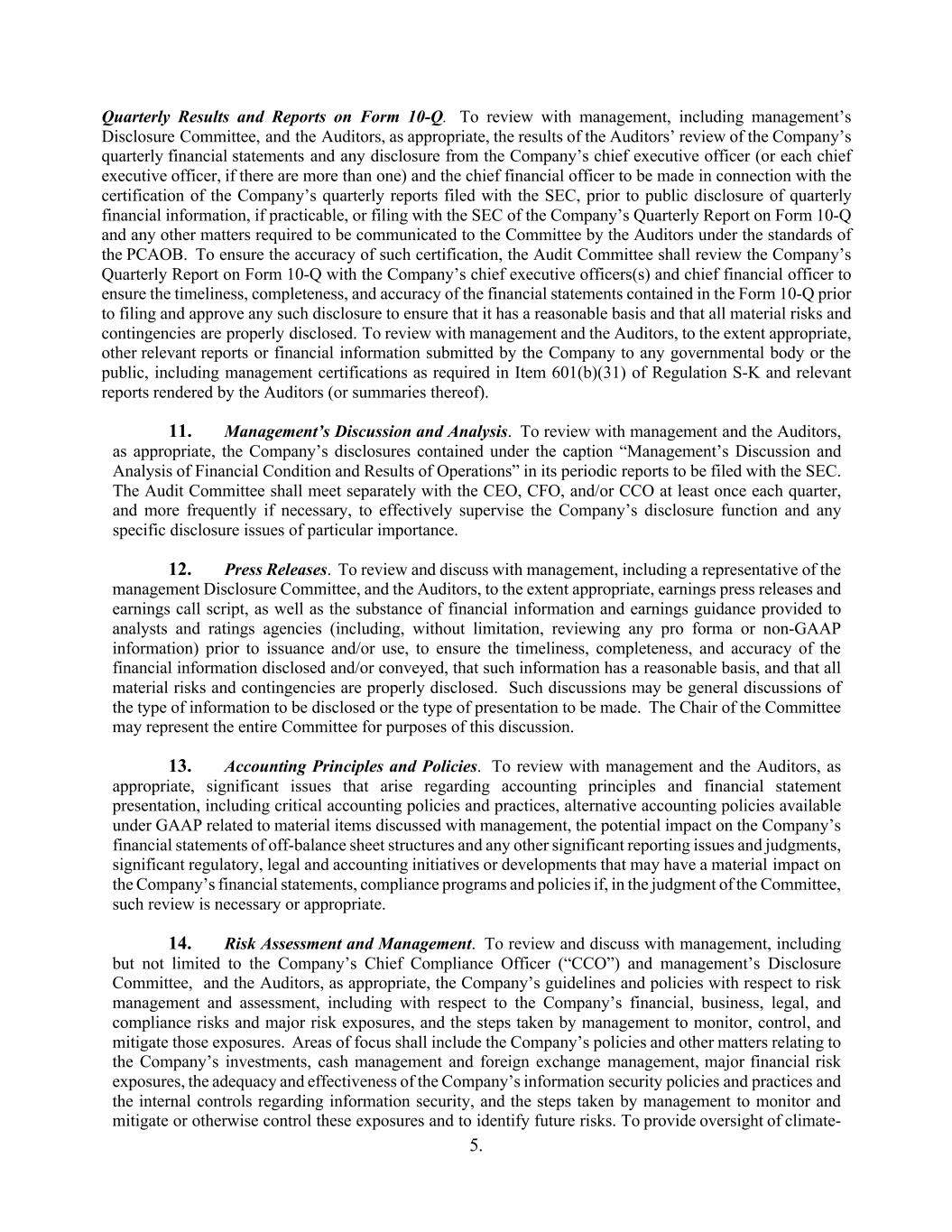 5. Quarterly Results and Reports on Form 10-Q. To review with management, including management’s Disclosure Committee, and the Auditors, as appropriate, the results of the Auditors’ review of the Company’s quarterly financial statements and any disclosure from the Company’s chief executive officer (or each chief executive officer, if there are more than one) and the chief financial officer to be made in connection with the certification of the Company’s quarterly reports filed with the SEC, prior to public disclosure of quarterly financial information, if practicable, or filing with the SEC of the Company’s Quarterly Report on Form 10-Q and any other matters required to be communicated to the Committee by the Auditors under the standards of the PCAOB. To ensure the accuracy of such certification, the Audit Committee shall review the Company’s Quarterly Report on Form 10-Q with the Company’s chief executive officers(s) and chief financial officer to ensure the timeliness, completeness, and accuracy of the financial statements contained in the Form 10-Q prior to filing and approve any such disclosure to ensure that it has a reasonable basis and that all material risks and contingencies are properly disclosed. To review with management and the Auditors, to the extent appropriate, other relevant reports or financial information submitted by the Company to any governmental body or the public, including management certifications as required in Item 601(b)(31) of Regulation S-K and relevant reports rendered by the Auditors (or summaries thereof). 11. Management’s Discussion and Analysis. To review with management and the Auditors, as appropriate, the Company’s disclosures contained under the caption “Management’s Discussion and Analysis of Financial Condition and Results of Operations” in its periodic reports to be filed with the SEC. The Audit Committee shall meet separately with the CEO, CFO, and/or CCO at least once each quarter, and more frequently if necessary, to effectively supervise the Company’s disclosure function and any specific disclosure issues of particular importance. 12. Press Releases. To review and discuss with management, including a representative of the management Disclosure Committee, and the Auditors, to the extent appropriate, earnings press releases and earnings call script, as well as the substance of financial information and earnings guidance provided to analysts and ratings agencies (including, without limitation, reviewing any pro forma or non-GAAP information) prior to issuance and/or use, to ensure the timeliness, completeness, and accuracy of the financial information disclosed and/or conveyed, that such information has a reasonable basis, and that all material risks and contingencies are properly disclosed. Such discussions may be general discussions of the type of information to be disclosed or the type of presentation to be made. The Chair of the Committee may represent the entire Committee for purposes of this discussion. 13. Accounting Principles and Policies. To review with management and the Auditors, as appropriate, significant issues that arise regarding accounting principles and financial statement presentation, including critical accounting policies and practices, alternative accounting policies available under GAAP related to material items discussed with management, the potential impact on the Company’s financial statements of off-balance sheet structures and any other significant reporting issues and judgments, significant regulatory, legal and accounting initiatives or developments that may have a material impact on the Company’s financial statements, compliance programs and policies if, in the judgment of the Committee, such review is necessary or appropriate. 14. Risk Assessment and Management. To review and discuss with management, including but not limited to the Company’s Chief Compliance Officer (“CCO”) and management’s Disclosure Committee, and the Auditors, as appropriate, the Company’s guidelines and policies with respect to risk management and assessment, including with respect to the Company’s financial, business, legal, and compliance risks and major risk exposures, and the steps taken by management to monitor, control, and mitigate those exposures. Areas of focus shall include the Company’s policies and other matters relating to the Company’s investments, cash management and foreign exchange management, major financial risk exposures, the adequacy and effectiveness of the Company’s information security policies and practices and the internal controls regarding information security, and the steps taken by management to monitor and mitigate or otherwise control these exposures and to identify future risks. To provide oversight of climate-
