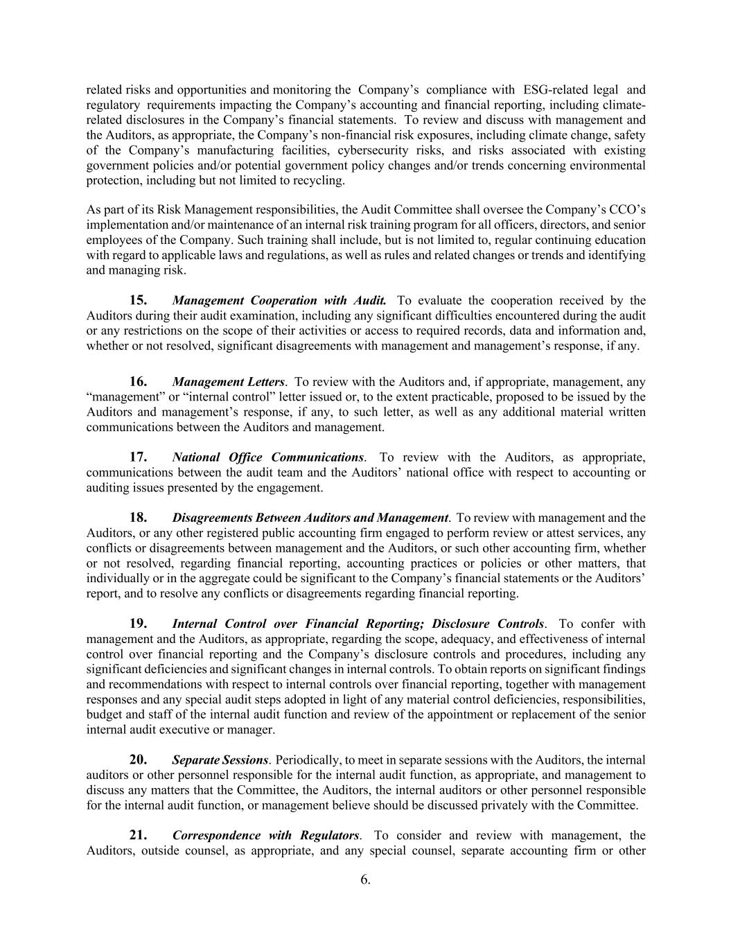 6. related risks and opportunities and monitoring the Company’s compliance with ESG-related legal and regulatory requirements impacting the Company’s accounting and financial reporting, including climate- related disclosures in the Company’s financial statements. To review and discuss with management and the Auditors, as appropriate, the Company’s non-financial risk exposures, including climate change, safety of the Company’s manufacturing facilities, cybersecurity risks, and risks associated with existing government policies and/or potential government policy changes and/or trends concerning environmental protection, including but not limited to recycling. As part of its Risk Management responsibilities, the Audit Committee shall oversee the Company’s CCO’s implementation and/or maintenance of an internal risk training program for all officers, directors, and senior employees of the Company. Such training shall include, but is not limited to, regular continuing education with regard to applicable laws and regulations, as well as rules and related changes or trends and identifying and managing risk. 15. Management Cooperation with Audit. To evaluate the cooperation received by the Auditors during their audit examination, including any significant difficulties encountered during the audit or any restrictions on the scope of their activities or access to required records, data and information and, whether or not resolved, significant disagreements with management and management’s response, if any. 16. Management Letters. To review with the Auditors and, if appropriate, management, any “management” or “internal control” letter issued or, to the extent practicable, proposed to be issued by the Auditors and management’s response, if any, to such letter, as well as any additional material written communications between the Auditors and management. 17. National Office Communications. To review with the Auditors, as appropriate, communications between the audit team and the Auditors’ national office with respect to accounting or auditing issues presented by the engagement. 18. Disagreements Between Auditors and Management. To review with management and the Auditors, or any other registered public accounting firm engaged to perform review or attest services, any conflicts or disagreements between management and the Auditors, or such other accounting firm, whether or not resolved, regarding financial reporting, accounting practices or policies or other matters, that individually or in the aggregate could be significant to the Company’s financial statements or the Auditors’ report, and to resolve any conflicts or disagreements regarding financial reporting. 19. Internal Control over Financial Reporting; Disclosure Controls. To confer with management and the Auditors, as appropriate, regarding the scope, adequacy, and effectiveness of internal control over financial reporting and the Company’s disclosure controls and procedures, including any significant deficiencies and significant changes in internal controls. To obtain reports on significant findings and recommendations with respect to internal controls over financial reporting, together with management responses and any special audit steps adopted in light of any material control deficiencies, responsibilities, budget and staff of the internal audit function and review of the appointment or replacement of the senior internal audit executive or manager. 20. Separate Sessions. Periodically, to meet in separate sessions with the Auditors, the internal auditors or other personnel responsible for the internal audit function, as appropriate, and management to discuss any matters that the Committee, the Auditors, the internal auditors or other personnel responsible for the internal audit function, or management believe should be discussed privately with the Committee. 21. Correspondence with Regulators. To consider and review with management, the Auditors, outside counsel, as appropriate, and any special counsel, separate accounting firm or other