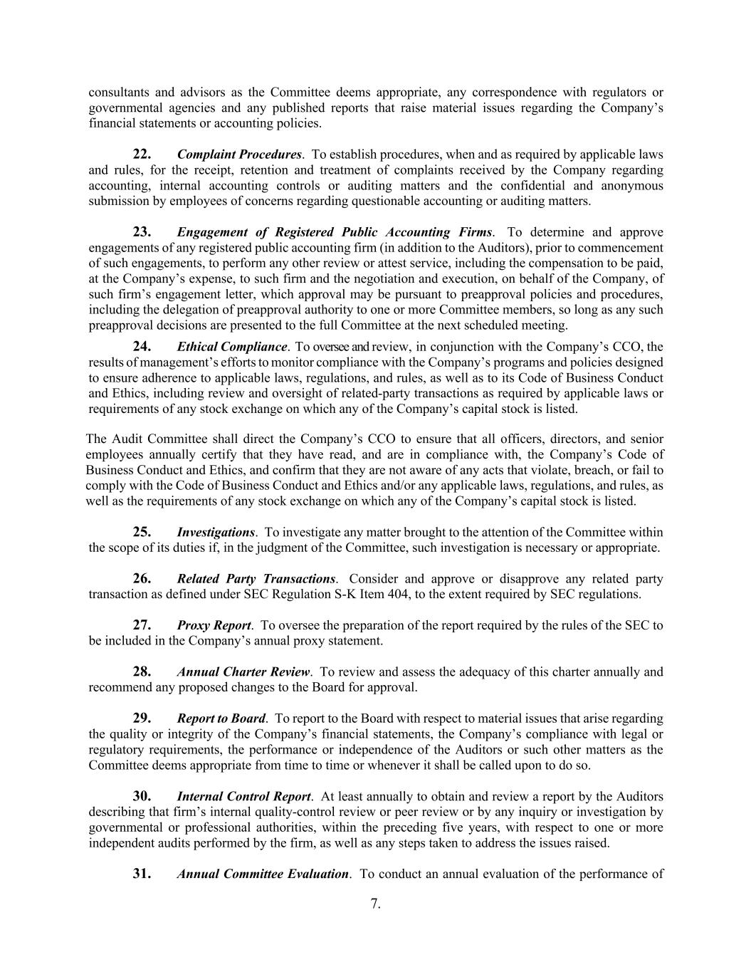7. consultants and advisors as the Committee deems appropriate, any correspondence with regulators or governmental agencies and any published reports that raise material issues regarding the Company’s financial statements or accounting policies. 22. Complaint Procedures. To establish procedures, when and as required by applicable laws and rules, for the receipt, retention and treatment of complaints received by the Company regarding accounting, internal accounting controls or auditing matters and the confidential and anonymous submission by employees of concerns regarding questionable accounting or auditing matters. 23. Engagement of Registered Public Accounting Firms. To determine and approve engagements of any registered public accounting firm (in addition to the Auditors), prior to commencement of such engagements, to perform any other review or attest service, including the compensation to be paid, at the Company’s expense, to such firm and the negotiation and execution, on behalf of the Company, of such firm’s engagement letter, which approval may be pursuant to preapproval policies and procedures, including the delegation of preapproval authority to one or more Committee members, so long as any such preapproval decisions are presented to the full Committee at the next scheduled meeting. 24. Ethical Compliance. To oversee and review, in conjunction with the Company’s CCO, the results of management’s efforts to monitor compliance with the Company’s programs and policies designed to ensure adherence to applicable laws, regulations, and rules, as well as to its Code of Business Conduct and Ethics, including review and oversight of related-party transactions as required by applicable laws or requirements of any stock exchange on which any of the Company’s capital stock is listed. The Audit Committee shall direct the Company’s CCO to ensure that all officers, directors, and senior employees annually certify that they have read, and are in compliance with, the Company’s Code of Business Conduct and Ethics, and confirm that they are not aware of any acts that violate, breach, or fail to comply with the Code of Business Conduct and Ethics and/or any applicable laws, regulations, and rules, as well as the requirements of any stock exchange on which any of the Company’s capital stock is listed. 25. Investigations. To investigate any matter brought to the attention of the Committee within the scope of its duties if, in the judgment of the Committee, such investigation is necessary or appropriate. 26. Related Party Transactions. Consider and approve or disapprove any related party transaction as defined under SEC Regulation S-K Item 404, to the extent required by SEC regulations. 27. Proxy Report. To oversee the preparation of the report required by the rules of the SEC to be included in the Company’s annual proxy statement. 28. Annual Charter Review. To review and assess the adequacy of this charter annually and recommend any proposed changes to the Board for approval. 29. Report to Board. To report to the Board with respect to material issues that arise regarding the quality or integrity of the Company’s financial statements, the Company’s compliance with legal or regulatory requirements, the performance or independence of the Auditors or such other matters as the Committee deems appropriate from time to time or whenever it shall be called upon to do so. 30. Internal Control Report. At least annually to obtain and review a report by the Auditors describing that firm’s internal quality-control review or peer review or by any inquiry or investigation by governmental or professional authorities, within the preceding five years, with respect to one or more independent audits performed by the firm, as well as any steps taken to address the issues raised. 31. Annual Committee Evaluation. To conduct an annual evaluation of the performance of