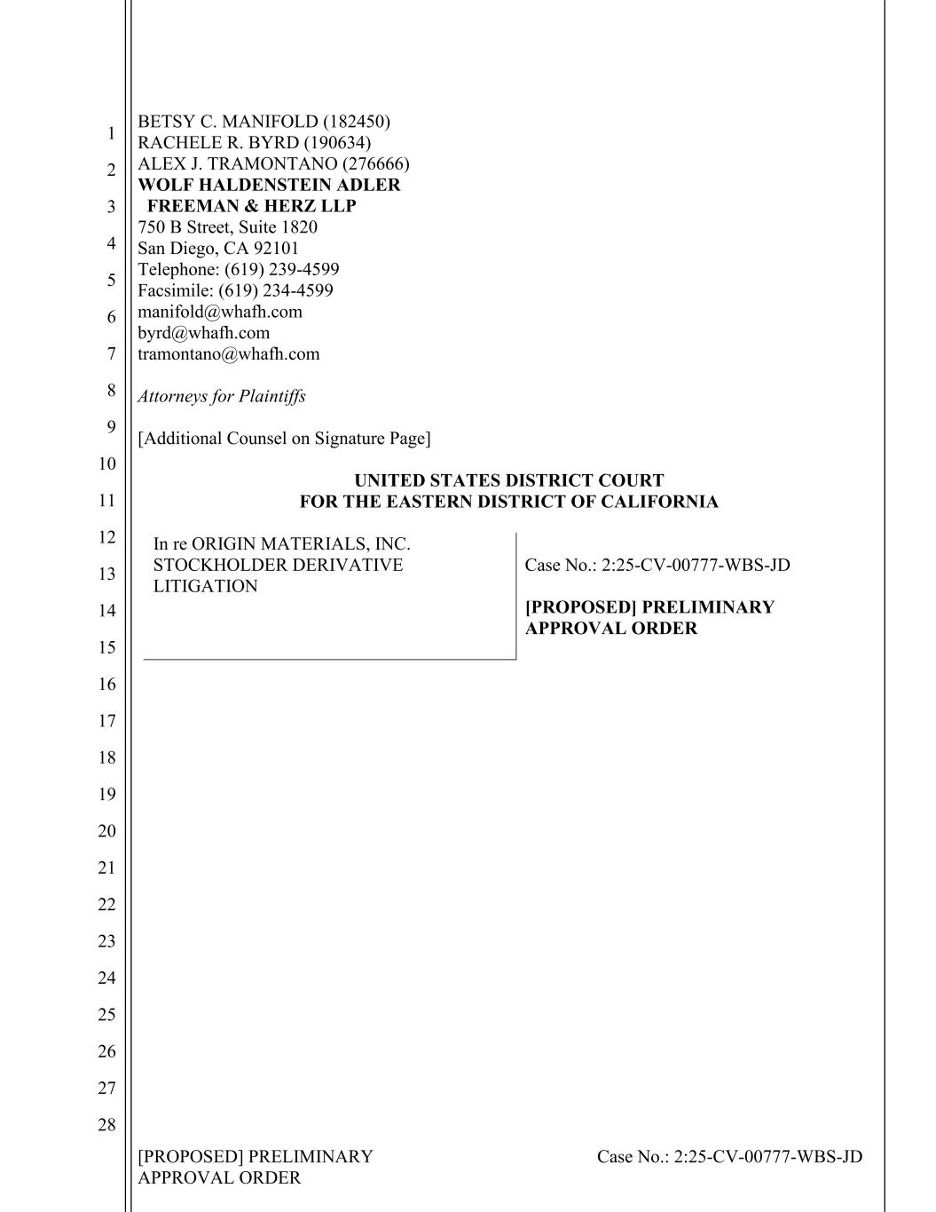 [PROPOSED] PRELIMINARY APPROVAL ORDER Case No.: 2:25-CV-00777-WBS-JD 1 2 3 4 5 6 7 8 9 10 11 12 13 14 15 16 17 18 19 20 21 22 23 24 25 26 27 28 BETSY C. MANIFOLD (182450) RACHELE R. BYRD (190634) ALEX J. TRAMONTANO (276666) WOLF HALDENSTEIN ADLER FREEMAN & HERZ LLP 750 B Street, Suite 1820 San Diego, CA 92101 Telephone: (619) 239-4599 Facsimile: (619) 234-4599 manifold@whafh.com byrd@whafh.com tramontano@whafh.com Attorneys for Plaintiffs [Additional Counsel on Signature Page] UNITED STATES DISTRICT COURT FOR THE EASTERN DISTRICT OF CALIFORNIA In re ORIGIN MATERIALS, INC. STOCKHOLDER DERIVATIVE LITIGATION Case No.: 2:25-CV-00777-WBS-JD [PROPOSED] PRELIMINARY APPROVAL ORDER