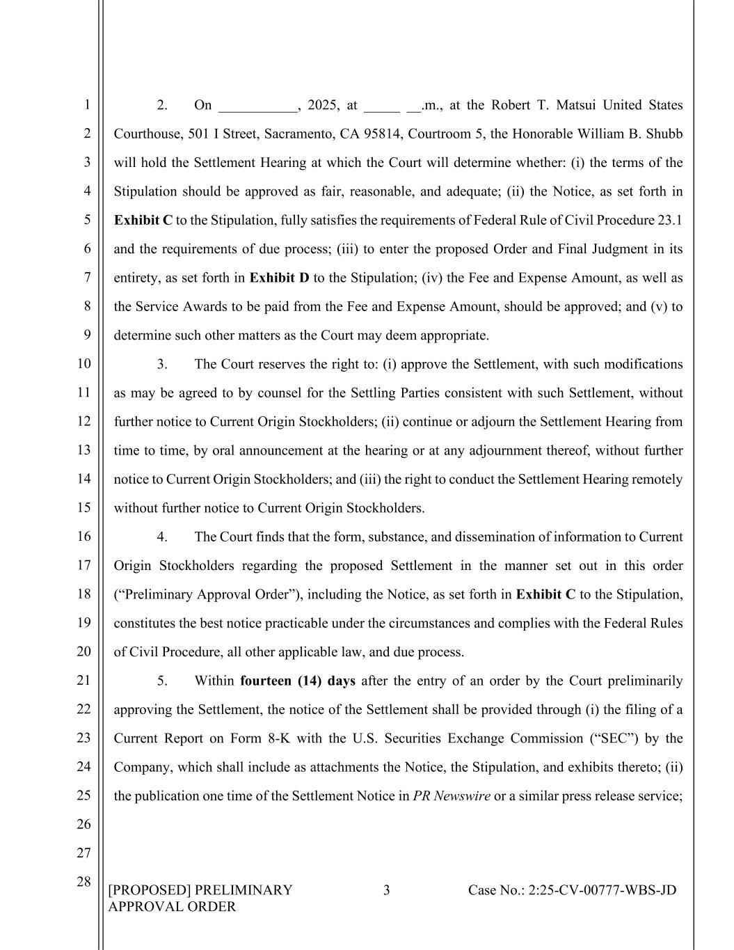 [PROPOSED] PRELIMINARY APPROVAL ORDER 3 Case No.: 2:25-CV-00777-WBS-JD 1 2 3 4 5 6 7 8 9 10 11 12 13 14 15 16 17 18 19 20 21 22 23 24 25 26 27 28 2. On ___________, 2025, at _____ __.m., at the Robert T. Matsui United States Courthouse, 501 I Street, Sacramento, CA 95814, Courtroom 5, the Honorable William B. Shubb will hold the Settlement Hearing at which the Court will determine whether: (i) the terms of the Stipulation should be approved as fair, reasonable, and adequate; (ii) the Notice, as set forth in Exhibit C to the Stipulation, fully satisfies the requirements of Federal Rule of Civil Procedure 23.1 and the requirements of due process; (iii) to enter the proposed Order and Final Judgment in its entirety, as set forth in Exhibit D to the Stipulation; (iv) the Fee and Expense Amount, as well as the Service Awards to be paid from the Fee and Expense Amount, should be approved; and (v) to determine such other matters as the Court may deem appropriate. 3. The Court reserves the right to: (i) approve the Settlement, with such modifications as may be agreed to by counsel for the Settling Parties consistent with such Settlement, without further notice to Current Origin Stockholders; (ii) continue or adjourn the Settlement Hearing from time to time, by oral announcement at the hearing or at any adjournment thereof, without further notice to Current Origin Stockholders; and (iii) the right to conduct the Settlement Hearing remotely without further notice to Current Origin Stockholders. 4. The Court finds that the form, substance, and dissemination of information to Current Origin Stockholders regarding the proposed Settlement in the manner set out in this order (“Preliminary Approval Order”), including the Notice, as set forth in Exhibit C to the Stipulation, constitutes the best notice practicable under the circumstances and complies with the Federal Rules of Civil Procedure, all other applicable law, and due process. 5. Within fourteen (14) days after the entry of an order by the Court preliminarily approving the Settlement, the notice of the Settlement shall be provided through (i) the filing of a Current Report on Form 8-K with the U.S. Securities Exchange Commission (“SEC”) by the Company, which shall include as attachments the Notice, the Stipulation, and exhibits thereto; (ii) the publication one time of the Settlement Notice in PR Newswire or a similar press release service;