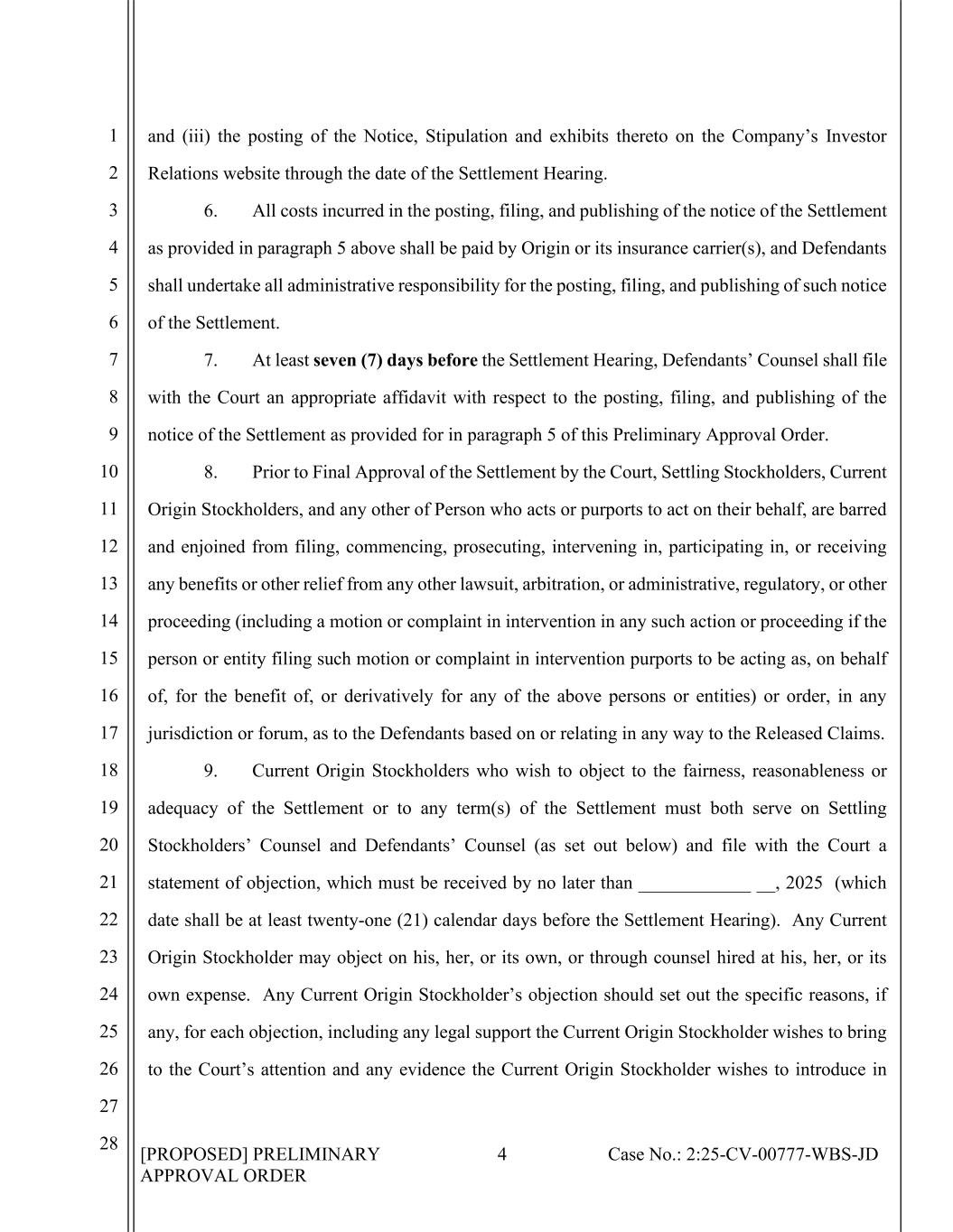 [PROPOSED] PRELIMINARY APPROVAL ORDER 4 Case No.: 2:25-CV-00777-WBS-JD 1 2 3 4 5 6 7 8 9 10 11 12 13 14 15 16 17 18 19 20 21 22 23 24 25 26 27 28 and (iii) the posting of the Notice, Stipulation and exhibits thereto on the Company’s Investor Relations website through the date of the Settlement Hearing. 6. All costs incurred in the posting, filing, and publishing of the notice of the Settlement as provided in paragraph 5 above shall be paid by Origin or its insurance carrier(s), and Defendants shall undertake all administrative responsibility for the posting, filing, and publishing of such notice of the Settlement. 7. At least seven (7) days before the Settlement Hearing, Defendants’ Counsel shall file with the Court an appropriate affidavit with respect to the posting, filing, and publishing of the notice of the Settlement as provided for in paragraph 5 of this Preliminary Approval Order. 8. Prior to Final Approval of the Settlement by the Court, Settling Stockholders, Current Origin Stockholders, and any other of Person who acts or purports to act on their behalf, are barred and enjoined from filing, commencing, prosecuting, intervening in, participating in, or receiving any benefits or other relief from any other lawsuit, arbitration, or administrative, regulatory, or other proceeding (including a motion or complaint in intervention in any such action or proceeding if the person or entity filing such motion or complaint in intervention purports to be acting as, on behalf of, for the benefit of, or derivatively for any of the above persons or entities) or order, in any jurisdiction or forum, as to the Defendants based on or relating in any way to the Released Claims. 9. Current Origin Stockholders who wish to object to the fairness, reasonableness or adequacy of the Settlement or to any term(s) of the Settlement must both serve on Settling Stockholders’ Counsel and Defendants’ Counsel (as set out below) and file with the Court a statement of objection, which must be received by no later than ____________ __, 2025 (which date shall be at least twenty-one (21) calendar days before the Settlement Hearing). Any Current Origin Stockholder may object on his, her, or its own, or through counsel hired at his, her, or its own expense. Any Current Origin Stockholder’s objection should set out the specific reasons, if any, for each objection, including any legal support the Current Origin Stockholder wishes to bring to the Court’s attention and any evidence the Current Origin Stockholder wishes to introduce in