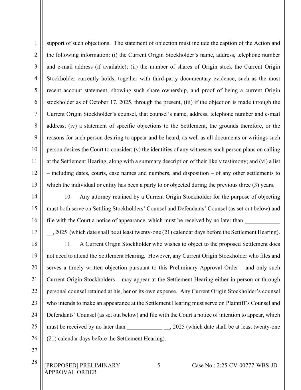 [PROPOSED] PRELIMINARY APPROVAL ORDER 5 Case No.: 2:25-CV-00777-WBS-JD 1 2 3 4 5 6 7 8 9 10 11 12 13 14 15 16 17 18 19 20 21 22 23 24 25 26 27 28 support of such objections. The statement of objection must include the caption of the Action and the following information: (i) the Current Origin Stockholder’s name, address, telephone number and e-mail address (if available); (ii) the number of shares of Origin stock the Current Origin Stockholder currently holds, together with third-party documentary evidence, such as the most recent account statement, showing such share ownership, and proof of being a current Origin stockholder as of October 17, 2025, through the present, (iii) if the objection is made through the Current Origin Stockholder’s counsel, that counsel’s name, address, telephone number and e-mail address; (iv) a statement of specific objections to the Settlement, the grounds therefore, or the reasons for such person desiring to appear and be heard, as well as all documents or writings such person desires the Court to consider; (v) the identities of any witnesses such person plans on calling at the Settlement Hearing, along with a summary description of their likely testimony; and (vi) a list – including dates, courts, case names and numbers, and disposition – of any other settlements to which the individual or entity has been a party to or objected during the previous three (3) years. 10. Any attorney retained by a Current Origin Stockholder for the purpose of objecting must both serve on Settling Stockholders’ Counsel and Defendants’ Counsel (as set out below) and file with the Court a notice of appearance, which must be received by no later than ____________ __, 2025 (which date shall be at least twenty-one (21) calendar days before the Settlement Hearing). 11. A Current Origin Stockholder who wishes to object to the proposed Settlement does not need to attend the Settlement Hearing. However, any Current Origin Stockholder who files and serves a timely written objection pursuant to this Preliminary Approval Order – and only such Current Origin Stockholders – may appear at the Settlement Hearing either in person or through personal counsel retained at his, her or its own expense. Any Current Origin Stockholder’s counsel who intends to make an appearance at the Settlement Hearing must serve on Plaintiff’s Counsel and Defendants’ Counsel (as set out below) and file with the Court a notice of intention to appear, which must be received by no later than ____________ __, 2025 (which date shall be at least twenty-one (21) calendar days before the Settlement Hearing).
